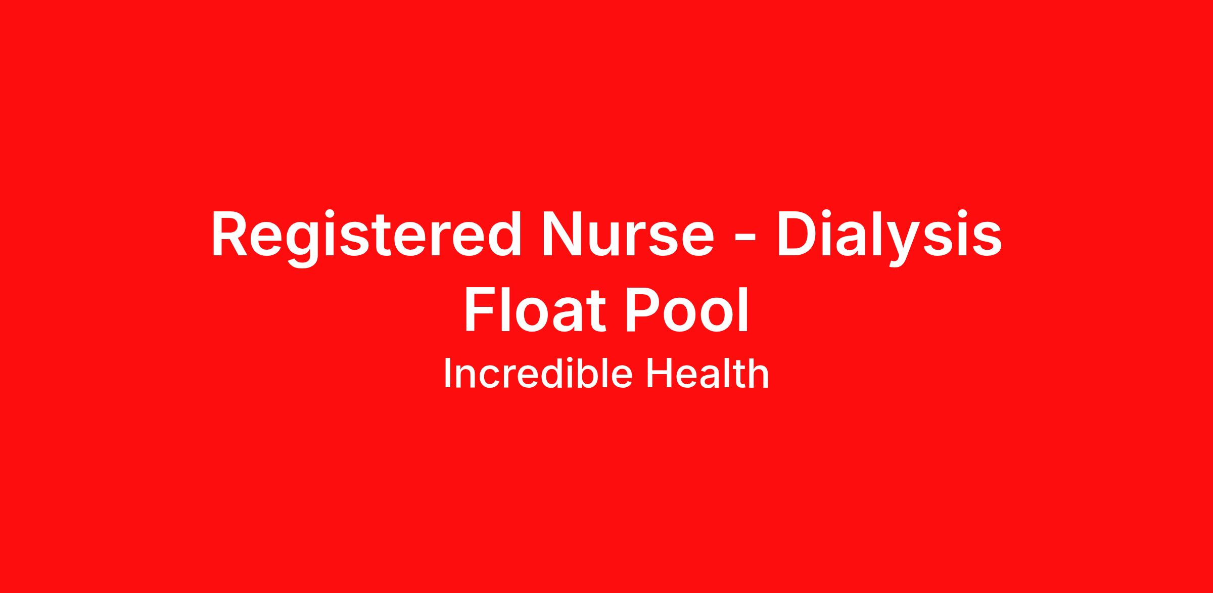 Hospitals on Incredible Health are actively hiring and accepting applications in the Norfolk, VA area for the following position: Registered Nurse - Dialysis Float Pool. Nurses with experience in any of the following areas are strongly encouraged to apply: Acute dialysis, Catheter, graph and fistula care, Collect blood vials, Hemodialysis, or Peritoneal dialysis. Shift(s) available: day shift, night shift, and mid shift Job types available: full time, part time, and per diem Employer features: 401(K) & Matching, Adoption Assistance, Career Advance Program, Child Care Benefits, Family Care Benefits, Paid Parental Leave, Tuition Assistance Qualifications: RN Diploma degree or higher from an accredited school of nursing Active and unencumbered Registered Nurse license in the state of Virginia Benefits: Healthcare coverage: Medical, Dental, Vision 401K Paid Time Off Tuition Assistance