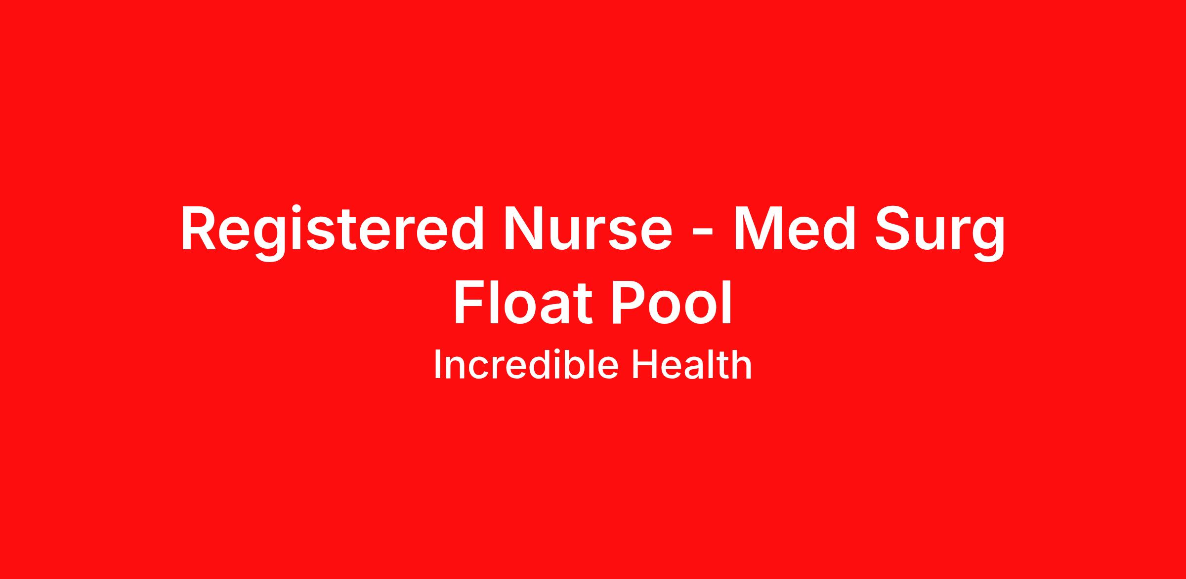 Hospitals on Incredible Health are actively hiring and accepting applications in the Macon, GA area for the following position: Registered Nurse - Med Surg Float Pool. Nurses with experience in any of the following areas are strongly encouraged to apply: Cardiac patients, Couplet care, EKG monitoring, Educator, Fundal massage, Healing, Neuro patients, Oncology patients, Orthopedic patients, Ostomy care, PCA pumps , Traction & cast care, Tube feeding management, or Wound & drain care. Shift(s) available: day shift, night shift, and mid shift Job types available: full time, part time, and per diem Employer features: Academic medical center, Best Places to Work recognition, Community hospital, Level 1 trauma center, Level 2 trauma center, Level 4 trauma center, Magnet recognized, Offers sign on bonus, Teaching Hospital, Tuition Assistance, U.S. News best hospital Qualifications: RN Diploma degree or higher from an accredited school of nursing Active and unencumbered Registered Nurse license in the state of Georgia Benefits: Healthcare coverage: Medical, Dental, Vision 401K Paid Time Off Tuition Assistance Salary: $59,030 to $77,630 /year