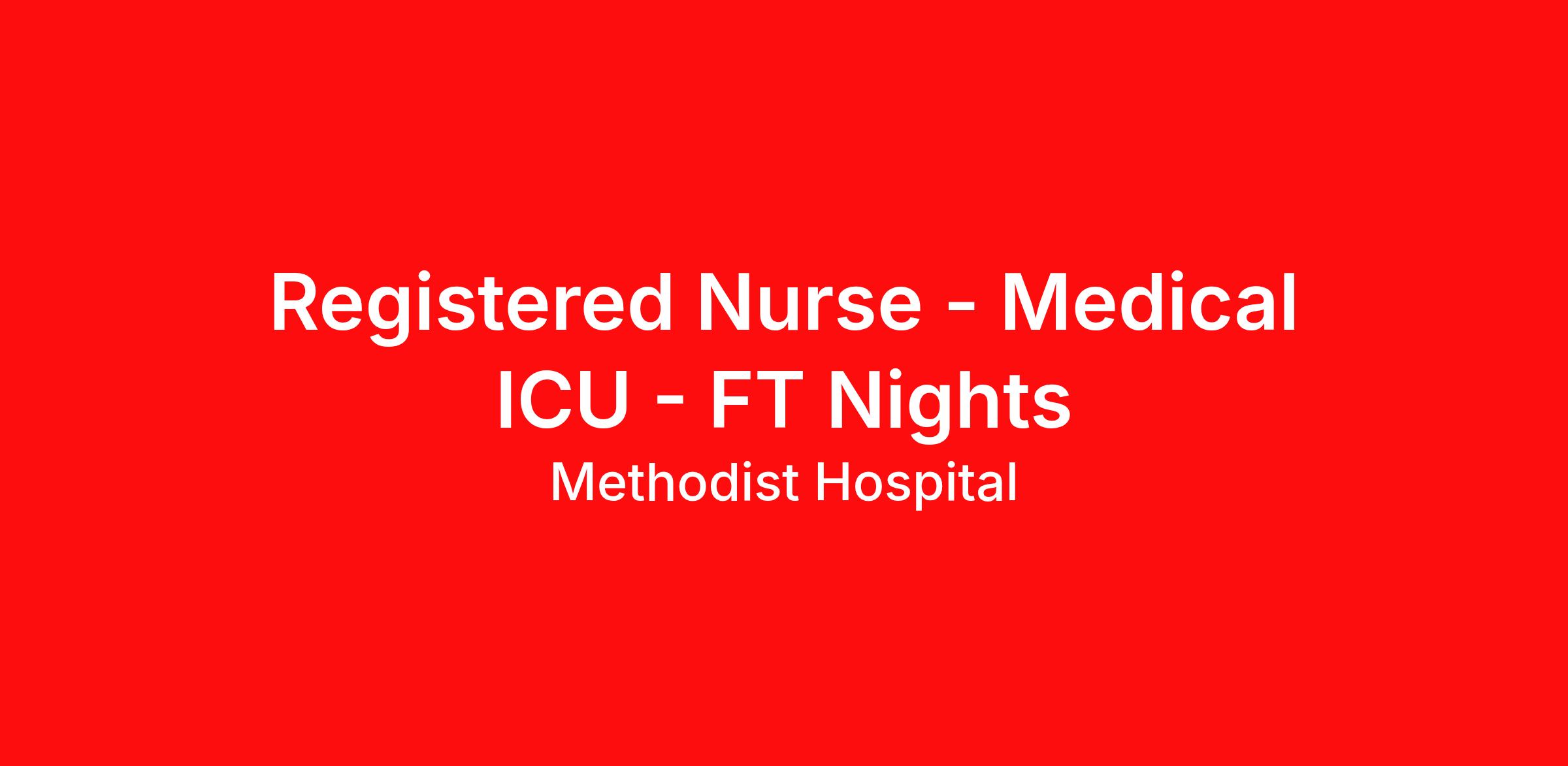 Strong Float Pool Support when it matters most. Technology and tools that streamline patient monitoring and communication to help you work more efficiently. Robust supply chains to keep you fully equipped. Ongoing clinical education to improve your skills. As a Registered Nurse at Methodist Hospital, you’ll have all the staffing support, technology and resources you need to deliver safe, high-quality care—so you can focus on what you do best. Are you a continuous learner? With more than 94,000 nurses throughout HCA Healthcare, we are one of the largest employers of nurses in the United States. Education is key to excellence! As a majority owner of Galen College of Nursing, which joins Research College of Nursing and Mercy School of Nursing as educational facilities within the HCA Healthcare family, we make it easier and more affordable to gain certifications and job skills. Apply today for our Registered Nurse - Medical ICU - FT Nights opening and continue to learn! Job Summary and Qualifications The Registered Nurse coordinates and delivers high quality, patient-centered care in accordance with the nature and specific requirements of the department, and consistent with the scope and standards of practice for the relevant state and specialty. In collaboration with medical providers and other members of the care team, the RN provides individualized, comprehensive, and compassionate care using established nursing models such as “Assess, Perform, Teach, and Manage.” The RN serves as an advocate for patients/families/caregivers and models a commitment to the organization’s vision/mission/values to support an unparalleled patient experience and clinical outcomes that contribute to overall departmental performance. Performs procedures, monitoring, or other functions as ordered by the medical provider(s). Documents the administration of care in the patient medical record in a timely and thorough manner. Teaches patients/families/caregivers about patient medical condition, patient status, treatment plan, medications and possible side effects, and follow-up measures. Translates complex medical terminology to ensure complete understanding. Teaches patients/families/caregivers about any non-medicinal follow-up measures, such as healthy diet and exercise, disease prevention, and/or other lifestyle changes. Prepares patients and families/caregivers for future self-management. Manages evidence-based practices and continuous process improvement initiatives to meet and exceed quality measures and enhance the exceptional care provided to patients. Manages the quality of care by collaborating with a multidisciplinary team to coordinate, evaluate, customize, and deliver a holistic patient treatment plan that promotes and supports recovery. Our Registered Nurses have access to a variety of resources to help you reach your goals including: A comprehensive orientation process Valuable mentorship from specialty specific educators Leadership development programs State-of-the-art units equipped with the latest technologies in patient care What You Will Do In Your Role: You will consistently apply the nursing process, critical thinking skills, scientific judgment, technical skills and leadership to independently deliver safe nursing care to patients. You will collaborate with the patient care team to achieve quality patient outcomes You will provide communication, confidence, and professionalism as evidenced by active engagement in unit and organizational activities You will demonstrate team work, adaptability, and serving as a resource to the patient care team You will have accountability for delivering quality nursing care services and for promoting a positive image of nursing What qualifications you will need: Graduate of an accredited diploma, associates, or baccalaureate degree registered nursing program. Minimum of six (6) months of clinical experience as a licensed Registered Nurse Current Registered Nurse License in the State of Texas or Multi-State Compact License (Employees with RN Compact License are required to obtain Texas RN License within 60 days of hire date) Current American Heart Association BLS Certification Benefits Methodist Hospital, offers a total rewards package that supports the health, life, career and retirement of our colleagues. The available plans and programs include: Comprehensive benefits for medical, prescription drug, dental, vision, behavioral health and telemedicine services Wellbeing support, including free counseling and referral services Time away from work programs for paid time off, paid family leave, long- and short-term disability coverage and leaves of absence Savings and retirement resources, including a 401(k) Plan with a 100% match on 3% to 9% of pay (based on years of service), Employee Stock Purchase Plan, flexible spending accounts, preferred banking partnerships, retirement readiness tools, rollover support and financial wellbeing counseling Education support through tuition assistance, student loan assistance, certification support, dependent scholarships and a partnership with Galen College of Nursing Additional benefits for fertility and family building, adoption assistance, life insurance, supplemental health protection plans, auto and home insurance, legal counseling, identity theft protection and consumer discounts Learn more about Employee Benefits Note: Eligibility for benefits may vary by location Methodist Hospital opened in 1963 as the first hospital in the now internationally acclaimed South Texas Medical Center. With over 900 beds, Methodist Hospital offers a broad range of specialties including cardiology, oncology, bone marrow transplants, emergency medicine, neurosciences, maternity care, gynecology and orthopedics. We are proud to be the largest provider of the lifesaving ECMO Program in San Antonio, are home to the largest robotics program in the world, and our Adult Blood Cancer and Stem Cell Transplant unit has become the first prog