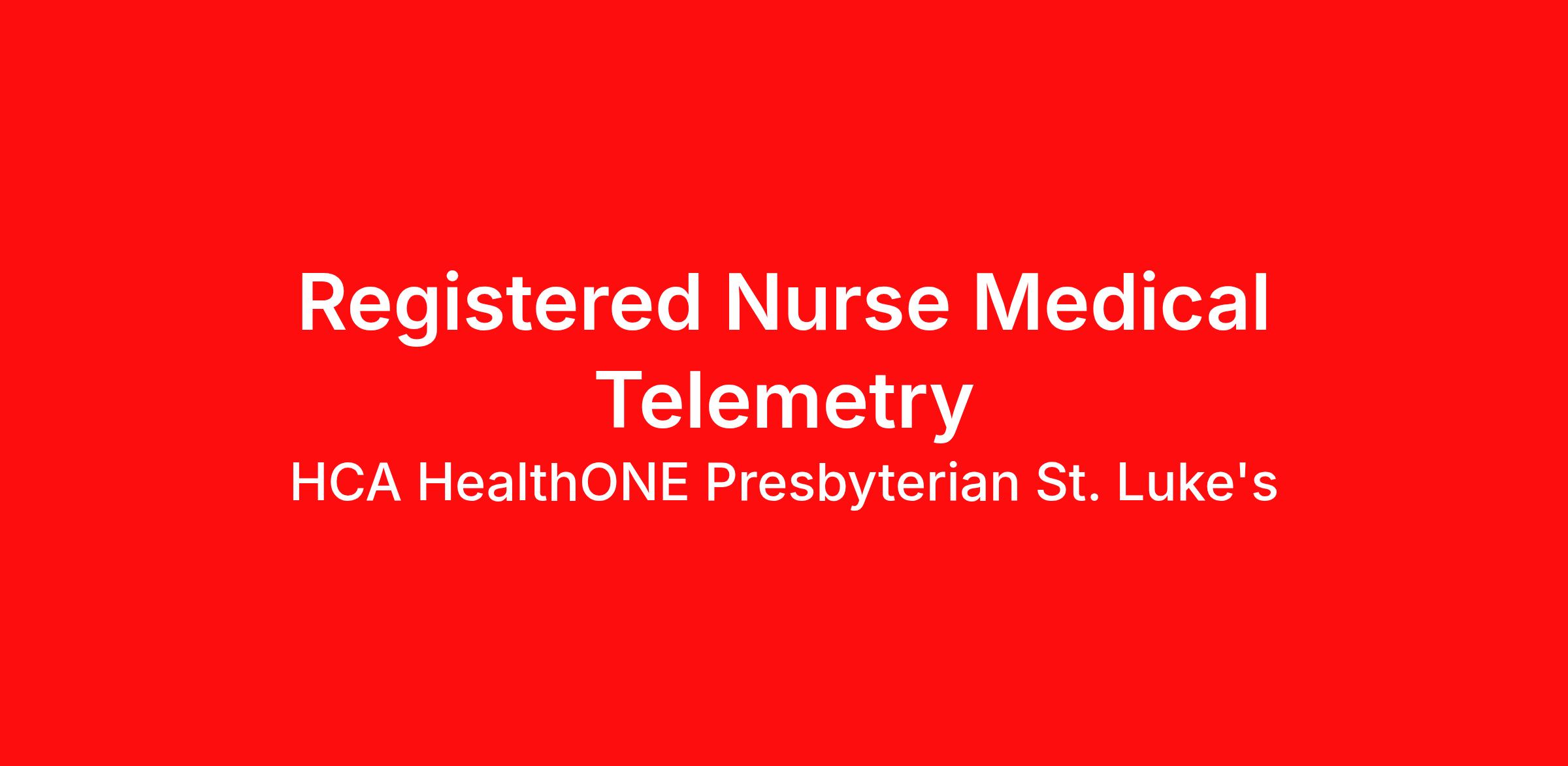 Hourly Wage Estimate: $36.50 - $53.25 / hour Learn more about the benefits offered for this job. The estimate displayed represents the typical wage range of candidates hired. Factors that may be used to determine your actual salary may include your specific skills, how many years of experience you have and comparison to other employees already in this role. The typical candidate is hired below midpoint of the range. *Now offering recently increased hourly rates for RNs Introduction HCA HealthONE Presbyterian St. Luke's is committed to investing in the latest technology enabling nurses to work more efficiently. Are you passionate about delivering patient-centered care? Submit your application for Registered Nurse Med Tele position and spend more time at the bedside with the patient. Benefits HCA HealthONE Presbyterian St. Luke's, offers a total rewards package that supports the health, life, career and retirement of our colleagues. The available plans and programs include: Comprehensive medical coverage that covers many common services at no cost or for a low copay. Plans include prescription drug and behavioral health coverage as well as free telemedicine services and free AirMed medical transportation. Additional options for dental and vision benefits, life and disability coverage, flexible spending accounts, supplemental health protection plans (accident, critical illness, hospital indemnity), auto and home insurance, identity theft protection, legal counseling, long-term care coverage, moving assistance, pet insurance and more. Free counseling services and resources for emotional, physical and financial wellbeing 401(k) Plan with a 100% match on 3% to 9% of pay (based on years of service) Employee Stock Purchase Plan with 10% off HCA Healthcare stock Family support through fertility and family building benefits with Progyny and adoption assistance. Referral services for child, elder and pet care, home and auto repair, event planning and more Consumer discounts through Abenity and Consumer Discounts Retirement readiness, rollover assistance services and preferred banking partnerships Education assistance (tuition, student loan, certification support, dependent scholarships) Colleague recognition program Time Away From Work Program (paid time off, paid family leave, long- and short-term disability coverage and leaves of absence) Employee Health Assistance Fund that offers free employee-only coverage to full-time and part-time colleagues based on income. Learn more about Employee Benefits Note: Eligibility for benefits may vary by location. You contribute to our success let us contribute to yours! Whether you choose to focus on bedside care, a leadership or C-suite role, shape business and operational outcomes, or work to deliver clinical excellence behind the scenes in data science, case management or transfer centers. Unlock your potential at HCA HealthONE Presbyterian St. Luke's! Job Summary and Qualifications As a Registered Nurse, you will be responsible for delivering high-quality, patient-centered care in line with the requirements of the department and the standards of practice for the relevant state and specialty. Collaborating with medical providers and the care team, you will provide personalized, comprehensive, and compassionate care, following established nursing models such as "Assess, Perform, Teach, and Manage." You will also act as an advocate for patients, families, and caregivers, embodying the organization's vision, mission, and values to ensure an outstanding patient experience and positive clinical outcomes. As a Registered Nurse on the Telemetry unit, you will be joining a team of professionals who are dedicated to deliver excellent care to our patients. You will enable patients to reach their goals through care specifically designed to cater to individual patient needs, and also administered by some of the most highly skilled and trained providers in the Rocky Mountain region. What you will do in this role: You will provide age appropriate excellent care to your patients based on physical, psychosocial, cultural, safety and learning needs of the patient. You will be performing duties within the scope of your practice and function within the philosophy and overall plan of care delivery at our hospitals. You will work in inpatient acute setting. What qualifications you will need for this role: Current licensure in the State of Colorado as a Registered Nurse, or current active multi-state Registered Nurse license BSN preferred Current BLS certification through the American Heart Association or American Red Cross Current ACLS certification through American Heart Association or American Red Cross Graduate from an accredited school of nursing One year experience in acute care HCA HealthONE, one of the largest and most comprehensive healthcare systems in the Rocky Mountain region, offers more than 170 care sites in the Denver metro area. Offering services across the continuum of care to meet patients’ total healthcare needs, HCA HealthONE includes seven acute care hospitals, a dedicated flagship pediatric hospital, a rehabilitation hospital, CareNow® urgent care clinics, mental health campuses, imaging and surgery centers, physician practices, home and hospice care, and AirLife Denver, which provides regional critical care air and ground transportation. Among HCA HealthONE’s acute care hospitals is Presbyterian/St. Luke’s (P/SL). P/SL has been meeting the healthcare needs of patients and their families from across the Rocky Mountain region for more than 140 years. Included on the P/SL campus is Rocky Mountain Children’s, a dedicated pediatric hospital, making the campus the only tertiary/quaternary combined pediatric and adult hospital in this region. P/SL is home to an award-winning cancer program including the Colorado Blood Cancer Institute, a solid organ transplant program, and complex orthopedics. Consistently among the Denver Business Journals’ list of t