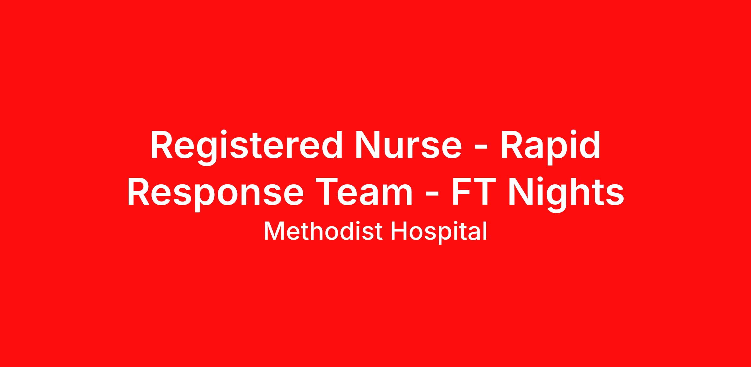 As a Registered Nurse - Rapid Response Team - FT Nights , your voice to influence patient care is valued and empowered at every turn –whether through open, collaborative relationships with your direct manager or more formal opportunities through hospital councils and national nursing initiatives. You'll help shape decisions that elevate both patient outcomes and the future of nursing. Do you want to work where you have a voice? Nurses are at the forefront of our commitment to the care and improvement of human life. At HCA Healthcare, there are many ways for nurses to have a voice through professional practice councils, advisory councils, vital voices surveys, and units of distinction. We learn from our multi-generational nursing family. We partner with our Nurses at Methodist Hospital! Job Summary and Qualifications Our Registered Nurses have access to a variety of resources to help you reach your goals including: A comprehensive orientation process Valuable mentorship from specialty specific educators Leadership development programs State-of-the-art units equipped with the latest technologies in patient care What You Will Do In Your Role: You will consistently apply the nursing process, critical thinking skills, scientific judgment, technical skills and leadership to independently deliver safe nursing care to patients. You will collaborate with the patient care team to achieve quality patient outcomes You will provide communication, confidence, and professionalism as evidenced by active engagement in unit and organizational activities You will demonstrate team work, adaptability, and serving as a resource to the patient care team You will have accountability for delivering quality nursing care services and for promoting a positive image of nursing What qualifications you will need: Graduate of an accredited diploma, associates, or baccalaureate degree registered nursing program. Minimum of six (6) months of clinical experience as a licensed Registered Nurse Experience responding to codes is strongly preferred Current Registered Nurse License in the State of Texas or Multi-State Compact License (Employees with RN Compact License are required to obtain Texas RN License within 60 days of hire date) Current American Heart Association BLS Certification Benefits Methodist Hospital, offers a total rewards package that supports the health, life, career and retirement of our colleagues. The available plans and programs include: Comprehensive benefits for medical, prescription drug, dental, vision, behavioral health and telemedicine services Wellbeing support, including free counseling and referral services Time away from work programs for paid time off, paid family leave, long- and short-term disability coverage and leaves of absence Savings and retirement resources , including a 401(k) Plan with a 100% match on 3% to 9% of pay (based on years of service), Employee Stock Purchase Plan, flexible spending accounts, preferred banking partnerships, retirement readiness tools, rollover support and financial wellbeing counseling Education support through tuition assistance, student loan assistance, certification support, dependent scholarships and a partnership with Galen College of Nursing Additional benefits for fertility and family building, adoption assistance, life insurance, supplemental health protection plans, auto and home insurance, legal counseling, identity theft protection and consumer discounts Learn more about Employee Benefits Note: Eligibility for benefits may vary by location. "Nurses play a pivotal role and are the backbone of healthcare delivery. At HCA Healthcare, we are dedicated to ensuring nurses have necessary tools and resources to provide world-class patient care, advocating for the profession and helping to shape the future of nursing." Sammie Mosier, DHA, MA, BSN, NE-BC Senior Vice President and Chief Nursing Executive, HCA Healthcare Methodist Hospital opened in 1963 as the first hospital in the now internationally acclaimed South Texas Medical Center. With over 900 beds, Methodist Hospital offers a broad range of specialties including cardiology, oncology, bone marrow transplants, emergency medicine, neurosciences, maternity care, gynecology and orthopedics. We are proud to be the largest provider of the lifesaving ECMO Program in San Antonio, are home to the largest robotics program in the world, and our Adult Blood Cancer and Stem Cell Transplant unit has become the first program to receive FACT Accreditation in North America. As the flagship hospital, and most comprehensive medical care facility of Methodist Healthcare, we appreciate the support and recognition we receive from the community. We’ve recently been named the No.1 Best Regional Hospital by the U.S. News and World Report for 2019-20. We pride ourselves on providing the highest quality of care possible for our patients, which is proven by our consecutive Grade A Leapfrog Hospital Safety scores. In addition, Methodist Hospital not only received a Primary Stroke Center designation from The Joint Commission, but has also received a Comprehensive Stroke Center Certification from DNV GL Healthcare, designating the facility as offering the most advanced stroke treatment available in a given geographic area. For more information, please visit our website at www.sahealth.com and select Methodist Hospital under Locations. If this opportunity is your next step in your career path, we encourage you to apply for our Registered Nurse - Rapid Response Team - FT Nights opening. We review all applications. Qualified candidates will be contacted by a member of our team. We are interviewing apply today! We are an equal opportunity employer. We do not discriminate on the basis of race, religion, color, national origin, gender, sexual orientation, age, marital status, veteran status, or disability status.