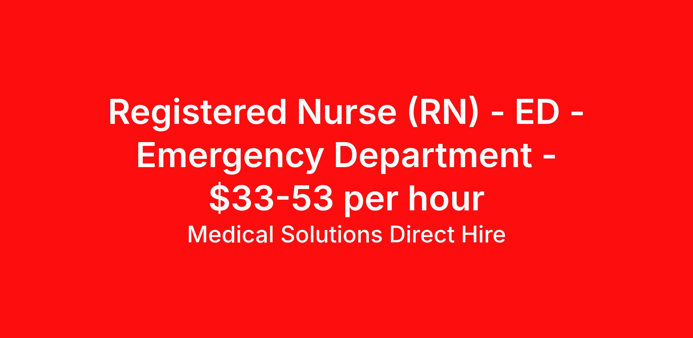 Medical Solutions Direct Hire is seeking a Registered Nurse (RN) ED - Emergency Department for a nursing job in Bethel, Delaware. Job Description & Requirements Specialty: ED - Emergency Department Discipline: RN Duration: Ongoing 36 hours per week Shift: 12 hours Employment Type: Staff Date Posted: March 17, 2026 Pay: $33.00 – $52.80/hour (based on experience) Emergency Room Registered Nurse (ER RN) Opportunity – Eastern Shore, MD Direct Hire | Full-Time | Multiple Shifts Available Position Overview Seeking an experienced Emergency Room Registered Nurse (ER RN) to join a high-acuity hospital Emergency Department Ideal for nurses who thrive in fast-paced, trauma-focused environments with diverse patient populations Provides emergency and critical care to adult and pediatric patients, including trauma, stroke, AMI, and behavioral health cases Functions as a patient advocate while delivering care aligned with ANA Standards and the Nursing Process Shift Details Days, evenings, or nights based on departmental needs Required weekend rotation Scheduled off at least three holidays per year Occasional overtime as needed Compensation & Incentives Competitive hourly pay based on experience ($33.00 – $52.80/hour) Comprehensive benefits package Opportunities for career growth and development Key Responsibilities Provide direct patient care in a hospital Emergency Department as an ER RN Assess, plan, implement, and evaluate patient care using the nursing process Deliver emergency, trauma, and critical care nursing services Administer medications and manage emergency department equipment Educate patients and families on treatment plans and discharge instructions Act as a patient advocate for emergency and trauma patients Collaborate with physicians and interdisciplinary teams to ensure optimal patient outcomes Maintain compliance with clinical standards, safety protocols, and regulatory requirements Requirements Active Registered Nurse (RN) license in state of permanent residency American Heart Association (AHA) BLS certification required ACLS and PALS required within 6 months of hire Emergency Room RN, ER RN, or acute care RN experience preferred Why This Opportunity Work in a high-acuity Emergency Department with exposure to trauma, stroke, cardiac, and behavioral health cases Supportive clinical environment with strong physician collaboration Opportunities to expand emergency and critical care skill sets Stable, hospital-based role with long-term career growth potential Location Highlights Coastal living just 30 minutes from the beach Affordable cost of living compared to major metro areas Access to outdoor recreation, dining, and family-friendly communities Balanced lifestyle with proximity to both coastal and urban amenities Job Type Full-time Benefits Medical, Dental, and Vision Insurance Prescription Coverage Paid Time Off (PTO) Retirement Plan Tuition Assistance and Professional Development Life and Disability Insurance Employee Assistance Program (EAP) On-site Childcare Access to Financial Services Work Location On-site Selected candidates will be contacted directly to discuss experience, background, and next steps in the interview process. Please contact Linda Georgiev, Recruiter, with any questions at . About Medical Solutions Direct Hire At Medical Solutions, we’re people who care, helping people who care. No matter how you look at it, there’s a whole lot of care going on in our world and that’s just the way we like it. What do we do? Medical Solutions is one of the nation’s largest providers of total workforce solutions in the healthcare industry, connecting nurses and allied health clinicians with hospitals and healthcare systems across the country and around the corner. Through our family of brands, we also serve a segment of clients outside of the healthcare space. And we’re the very best at what we do. You’ll love our culture that’s filled with heart and soul. As a company and employer, we’re sincerely and unabashedly us. We lead as humans first and believe the unique qualities of each team member make us better together. We share a purpose for helping others and the drive to make a difference. And we offer endless opportunities for personal and professional growth, throughout your career. At Medical Solutions, you’ll find a great place to work and a career home. We’ve received Best Places to Work awards, landed top industry awards, and received accolades for the impact we’ve made in business and within our community. But the only way to really get to know us, is to join us. We think you’ll fit right in.