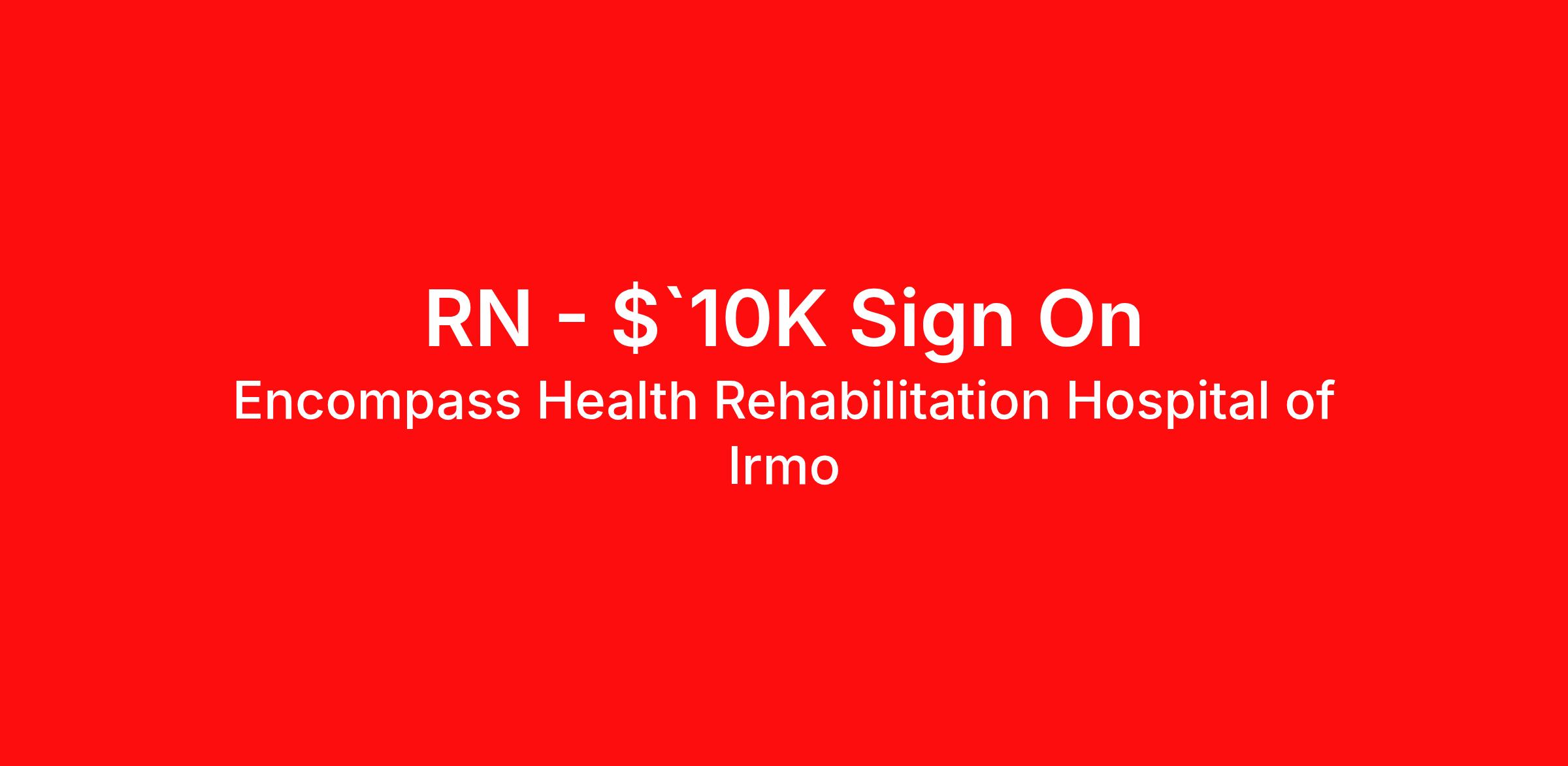 Registered Nurse Career Opportunity Now offering a $10,000 Sign On Bonus for Full Time RNs! Now hiring Full Time, Part Time and PRN RNs for Day and Night Shift Weekend 1 option also available Encompass Health: Where Nursing Meets Heart, Home, and Healing Are you seeking a nursing career deeply rooted in purpose, close to your heart and home? Encompass Health offers a transformative journey where your expertise as a Registered Nurse becomes an integral part of patients' recoveries. Picture the impact of providing individualized, compassionate care that guides patients along their path to healing. With us, small victories lead to monumental impacts as you use your specialized skills to offer top-tier, personalized support. Understand your patients deeply, assist in their rehabilitation goals, and thrive in an environment equipped with cutting-edge technology. Welcome to a place where nursing becomes a profound contribution to both community and personal fulfillment. A Glimpse into Our World At Encompass Health, you'll experience the difference the moment you become a part of our team. Being at Encompass Health means aligning with a rapidly growing national inpatient rehabilitation leader. We take pride in the growth opportunities we offer and how our team unites for the greater good of our patients. Our achievements include being named one of the "World's Most Admired Companies" and receiving the Fortune 100 Best Companies to Work For® Award, among other accolades, which is nothing short of amazing. Starting Perks and Benefits Our benefits are designed to support your well-being and start on day one : Affordable medical, dental, and vision plans for both full-time and part-time employees and their families. Generous paid time off that accrues over time. Opportunities for tuition reimbursement and continuous education. Company-matching 401(k) and employee stock purchase plans. Flexible spending and health savings accounts. A vibrant community of individuals passionate about the work they do! Realize Your Vision as a Registered Nurse Supervise care and treatments, lead patient assessments, tailor care plans, and address patient concerns to provide exceptional care. Build meaningful relationships with patients and their families, understanding their unique needs to facilitate their recovery. Collaborate and communicate effectively with various departments to ensure coordinated care and provide direct patient care when needed. Serve as a resource for fellow staff, supporting them with complex patient needs and inquiries. Celebrate victories and milestones achieved by our patients. Qualifications Valid RN licensures as required by state regulations. CPR certification (ACLS preferred). CRRN certification preferred. One year of experience in a rehabilitation hospital setting is preferred. We're eager to meet you, and we genuinely mean that. Join us on this remarkable journey! The Encompass Health Way We proudly set the standard in care by leading with empathy, doing what's right, focusing on the positive, and standing stronger together. Encompass Health is a trusted leader in post-acute care with over 150 nationwide locations and a team of 36,000 exceptional individuals and growing! At Encompass Health, we celebrate and welcome diversity in our inclusive culture. We provide equal employment opportunities regardless of race, ethnicity, gender, sexual orientation, gender identity or expression, religion, national origin, color, creed, age, mental or physical disability, or any other protected classification.