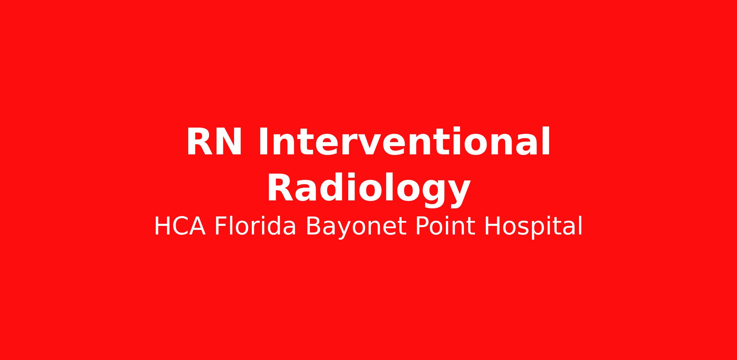 As a RN Interventional Radiology, your voice to influence patient care is valued and empowered at every turn –whether through open, collaborative relationships with your direct manager or more formal opportunities through hospital councils and national nursing initiatives. You'll help shape decisions that elevate both patient outcomes and the future of nursing. Job Summary and Qualifications We are seeking a Radiology Registered Nurse for our Special Procedures Department. You will provide clinical expertise to ensure all patients receive high quality, efficient care in a procedural environment. We are an amazing team that works hard to support each other and are seeking a phenomenal addition like you who feels patient care is as meaningful as we do. We want you to apply now. What you will do in this role: You will assess, plan, intervene and evaluate the care of invasive radiology patients; pre-, intra-, and post-procedure. You will assist physicians in procedures. You will identify, determine, and ensure all appropriate equipment is available for procedures. You will ensure room is set up in a timely manner. You will monitor patients during procedures and document appropriately. You will continuously assess, monitor, record and communicate patient condition and act appropriately. You will administer medications in accordance with physician orders. Requirements: Must be licensed as a Florida Registered Nurse in accordance with state regulations or appropriate compact licensure. If compact license held, active FL RN license required within 60 days of hire. Nursing Diploma or ASN required; BSN preferred. Previous experience in an acute care setting strongly preferred. Current American Heart Association BLS (Basic Life Support) certification required. American Heart Association ACLS (Advanced Cardiac Life Support) certification required within 6 months of hire/transfer. Critical thinking, service excellence and good interpersonal communication skills, ability to read/comprehend written instructions, ability to follow verbal instructions, PC skills Benefits HCA Florida Bayonet Point Hospital, offers a total rewards package that supports the health, life, career and retirement of our colleagues. The available plans and programs include: Comprehensive benefits for medical, prescription drug, dental, vision, behavioral health and telemedicine services Wellbeing support, including free counseling and referral services Time away from work programs for paid time off, paid family leave, long- and short-term disability coverage and leaves of absence Savings and retirement resources , including a 401(k) Plan with a 100% match on 3% to 9% of pay (based on years of service), Employee Stock Purchase Plan, flexible spending accounts, preferred banking partnerships, retirement readiness tools, rollover support and financial wellbeing counseling Education support through tuition assistance, student loan assistance, certification support, dependent scholarships and a partnership with Galen College of Nursing Additional benefits for fertility and family building, adoption assistance, life insurance, supplemental health protection plans, auto and home insurance, legal counseling, identity theft protection and consumer discounts Learn more about Employee Benefits Note: Eligibility for benefits may vary by location. "Nurses play a pivotal role and are the backbone of healthcare delivery. At HCA Healthcare, we are dedicated to ensuring nurses have necessary tools and resources to provide world-class patient care, advocating for the profession and helping to shape the future of nursing." Sammie Mosier, DHA, MA, BSN, NE-BC Senior Vice President and Chief Nursing Executive, HCA Healthcare HCA Florida Bayonet Point Hospital has been serving the Hudson, FL community since 1981. As a 392-bed acute care facility and designated Level II Trauma Center, we are home to the nationally acclaimed Heart Institute and employ over 350 physicians and 1,300 staff members. We were the first hospital in northwest Pasco County to offer a comprehensive cardiac and open-heart program, and our commitment to quality has earned us recognition for innovative care. Our accredited Heart Institute, Stroke Center, Chest Pain Center, and programs in Cancer Care, Orthopedics, and Neurosurgery exemplify our high-quality services. With over 100,000 procedures performed, we are dedicated to excellence. HCA Healthcare has been recognized as one of the World’s Most Ethical Companies® by the Ethisphere Institute more than ten times. In recent years, HCA Healthcare spent an estimated $3.7 billion in costs for the delivery of charitable care, uninsured discounts, and other uncompensated expenses. If this opportunity is your next step in your career path, we encourage you to apply for our RN Interventional Radiology opening. We review all applications. Qualified candidates will be contacted by a member of our team. We are interviewing, apply today! We are an equal opportunity employer. We do not discriminate on the basis of race, religion, color, national origin, gender, sexual orientation, age, marital status, veteran status, or disability status.