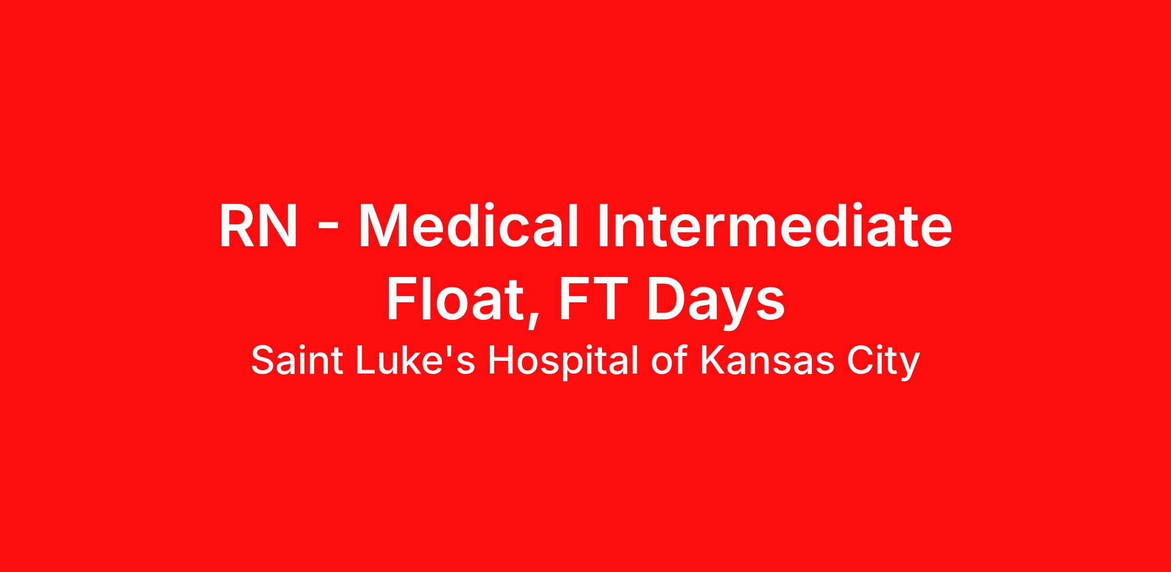 Job Description Saint Luke's Hospital is looking for a Registered Nurse to join the dynamic Intermediate Float Pool. Schedule: Full Time, Day Shift The Intermediate Float Pool at SLH is looking for an RN who is wanting to gain experience in various units while working at one facility. The Tier I Intermediate float pool nurse will float to 14 different units at Saint Luke's Hospital caring for medical surgical and intermediate patients. Included in the float pool are units that have a focus in Neuro, Cardiac, Transplant, Pulmonary, Ortho, and Surgical. Opportunities for growth in this position include precepting, charge RN, and additional training or competencies to care for additional patient types. This position is looking for someone who is flexible, adaptable, and able to learn quickly. This opportunity will provide you the opportunity to build competencies integral to your nursing career. Saint Luke's Hospital Highlights: Magnet Facility Teaching Facility Level I Trauma Center Accountable for utilizing the nursing process. Responsible for performing patient care delegating patient care tasks and for supervision of other patient care staff. Responsible for coordinating the plan of care for a group of assigned patients and consulting with other members of the health care team when indicated to ensure optimal patient outcomes. This clinical nurse demonstrates proficiency and abides by policies rules guidelines and procedures. Tier 1 will work at one entity. Job Requirements Applicable Experience: 1 year Basic Life Support - American Heart Association or Red Cross, Registered Nurse - Various Associate Degree Job Details Full Time Day (United States of America) The best place to get care. The best place to give care . Saint Luke's 12,000 employees strive toward that vision every day. Our employees are proud to work for the only faith-based, nonprofit, locally owned health system in Kansas City. Joining Saint Luke's means joining a team of exceptional professionals who strive for excellence in patient care. Do the best work of your career within a highly diverse and inclusive workspace where all voices matter. Join the Kansas City region's premiere provider of health services. Equal Opportunity Employer.