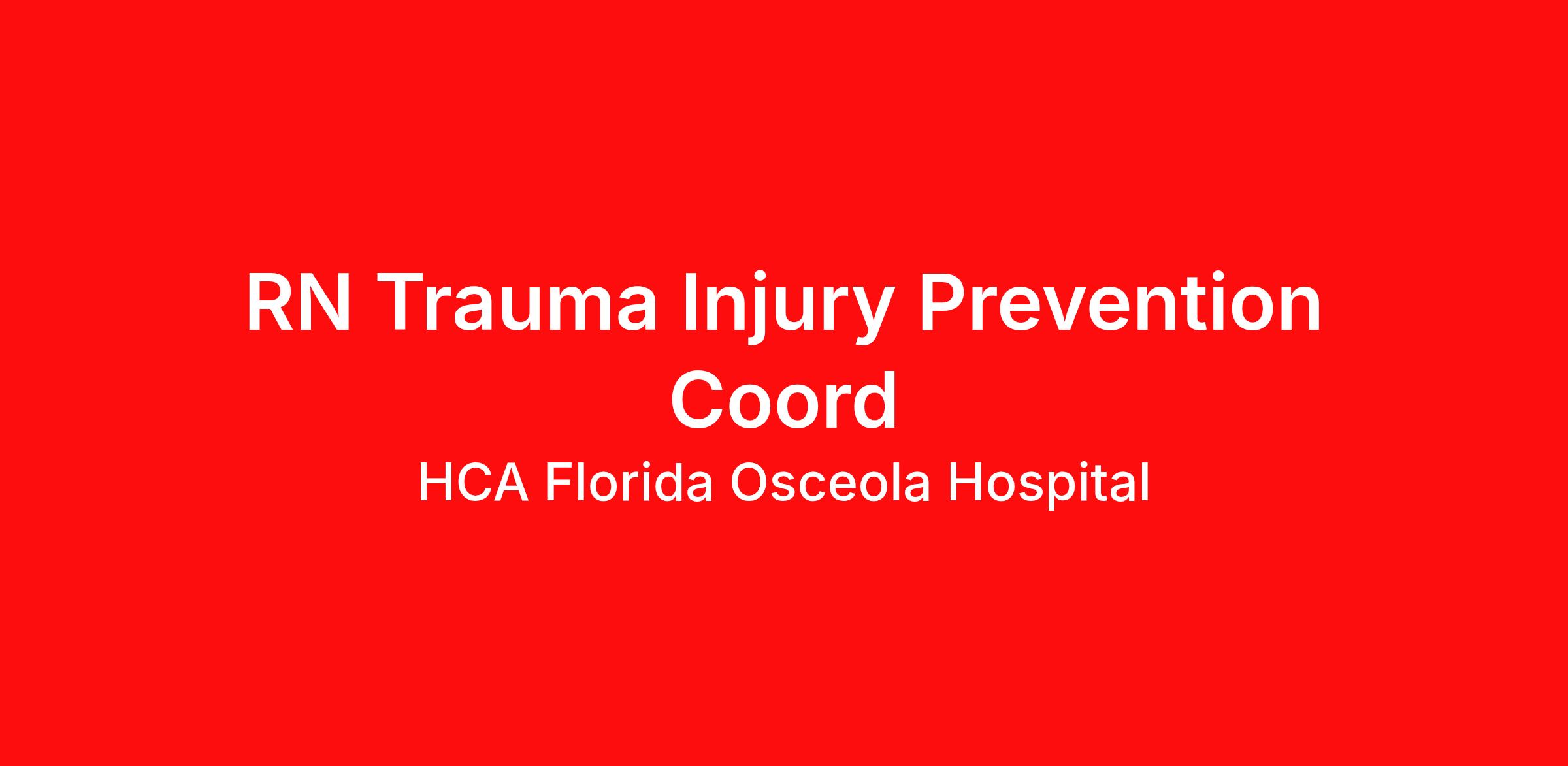 Introduction Are you passionate about the patient experience? At HCA Healthcare, we are committed to caring for patients with purpose and integrity. We care like family! Jump-start your career as a(an) RN Trauma Injury Prevention Coord today with HCA Florida Osceola Hospital. Benefits HCA Florida Osceola Hospital offers a total rewards package that supports the health, life, career and retirement of our colleagues. The available plans and programs include: Comprehensive medical coverage that covers many common services at no cost or for a low copay. Plans include prescription drug and behavioral health coverage as well as free telemedicine services and free AirMed medical transportation. Additional options for dental and vision benefits, life and disability coverage, flexible spending accounts, supplemental health protection plans (accident, critical illness, hospital indemnity), auto and home insurance, identity theft protection, legal counseling, long-term care coverage, moving assistance, pet insurance and more. Free counseling services and resources for emotional, physical and financial wellbeing 401(k) Plan with a 100% match on 3% to 9% of pay (based on years of service) Employee Stock Purchase Plan with 10% off HCA Healthcare stock Family support through fertility and family building benefits with Progyny and adoption assistance. Referral services for child, elder and pet care, home and auto repair, event planning and more Consumer discounts through Abenity and Consumer Discounts Retirement readiness, rollover assistance services and preferred banking partnerships Education assistance (tuition, student loan, certification support, dependent scholarships) Colleague recognition program Time Away From Work Program (paid time off, paid family leave, long- and short-term disability coverage and leaves of absence) Employee Health Assistance Fund that offers free employee-only coverage to full-time and part-time colleagues based on income. Learn more about Employee Benefits Note: Eligibility for benefits may vary by location. Come join our team as a(an) RN Trauma Injury Prevention Coord. We care for our community! Just last year, HCA Healthcare and our colleagues donated $13.8 million dollars to charitable organizations. Apply Today! Job Summary and Qualifications As an RN Trauma Injury Prevention Coordinator, you will organize the Trauma Program’s injury-prevention strategies across the full continuum of care – turning data, community needs, and evidence-based practices into programs that help people stay safer and live stronger. You’ll build meaningful connections with EMS, public health partners, schools, hospitals, and community organizations to drive prevention efforts that reflect HCA Healthcare’s commitment to improving more lives in more ways. Your leadership in outreach, education, research, and program development will support Trauma Center verification standards while expanding access to injury-prevention knowledge across the region. Your role will include: Developing and delivering targeted injury-prevention programs shaped by Trauma Registry data, community needs assessments, and performance-improvement indicators Building and sustaining partnerships with EMS agencies, public health leaders, regional trauma coordinators, and community organizations to advance injury-prevention efforts Leading and evaluating outreach education for nurses, EMS providers, referring facilities, and high-risk populations, ensuring alignment with ACS standards and Trauma Center verification requirements Translating and applying trauma research, data trends, and national guidelines into practical prevention strategies, mental-health screening initiatives, and evidence-based interventions Coordinating and communicating prevention priorities across internal and external stakeholders—including surgeons, trauma leaders, committee members, marketing, and public affairs—to strengthen awareness and community engagement Monitoring and documenting compliance with ACS, state, and local trauma-designation standards while assessing the impact and effectiveness of injury-prevention initiatives What qualifications you will need: Associate Degree in Nursing Bachelor’s Degree in Nursing Preferred 3 years experience in Nursing required 3 years experience in Trauma Nursing preferred Experience in Quality/Performance Improvement preferred Experience in Project Management preferred Currently licensed as a registered professional nurse in the state(s) of practice and/or has an active compact license, in accordance with law and regulation. Basic Life Support (BLS) within 30 days Advanced Cardiac Life Support (ACLS) within 6 months Trauma Nursing Core Course (TNCC) within 6 months HCA Florida Osceola Hospital is a 404-bed tertiary care hospital. We are accredited by the Joint Commission and are a Level II Trauma Center. We are a teaching hospital in collaboration with UCF College of Medicine. Our hospital is conveniently and centrally located in the Heart of Kissimmee. We are only minutes from Orlando, St. Cloud, Celebration, and Poinciana. We are committed to enhancing the standard of healthcare by providing services including Emergency Care, Trauma Care, Pediatric ER, Heart & Vascular Institute, and Comprehensive Stroke Center. Other services include The Baby Suites Maternity Care, Neonatal Intensive Care Unit Level II, Women’s Services, Behavioral Health, Orthopedics & Spine, and a Graduate Medical Education Program. We expand our care to the community with our freestanding Emergency Department at Hunter’s Creek ER. HCA Healthcare has been recognized as one of the World’s Most Ethical Companies® by the Ethisphere Institute more than ten times. In recent years, HCA Healthcare spent an estimated $3.7 billion in cost for the delivery of charitable care, uninsured discounts, and other uncompensated expenses. "The great hospitals will always put the patient and the patient's family first, and the really