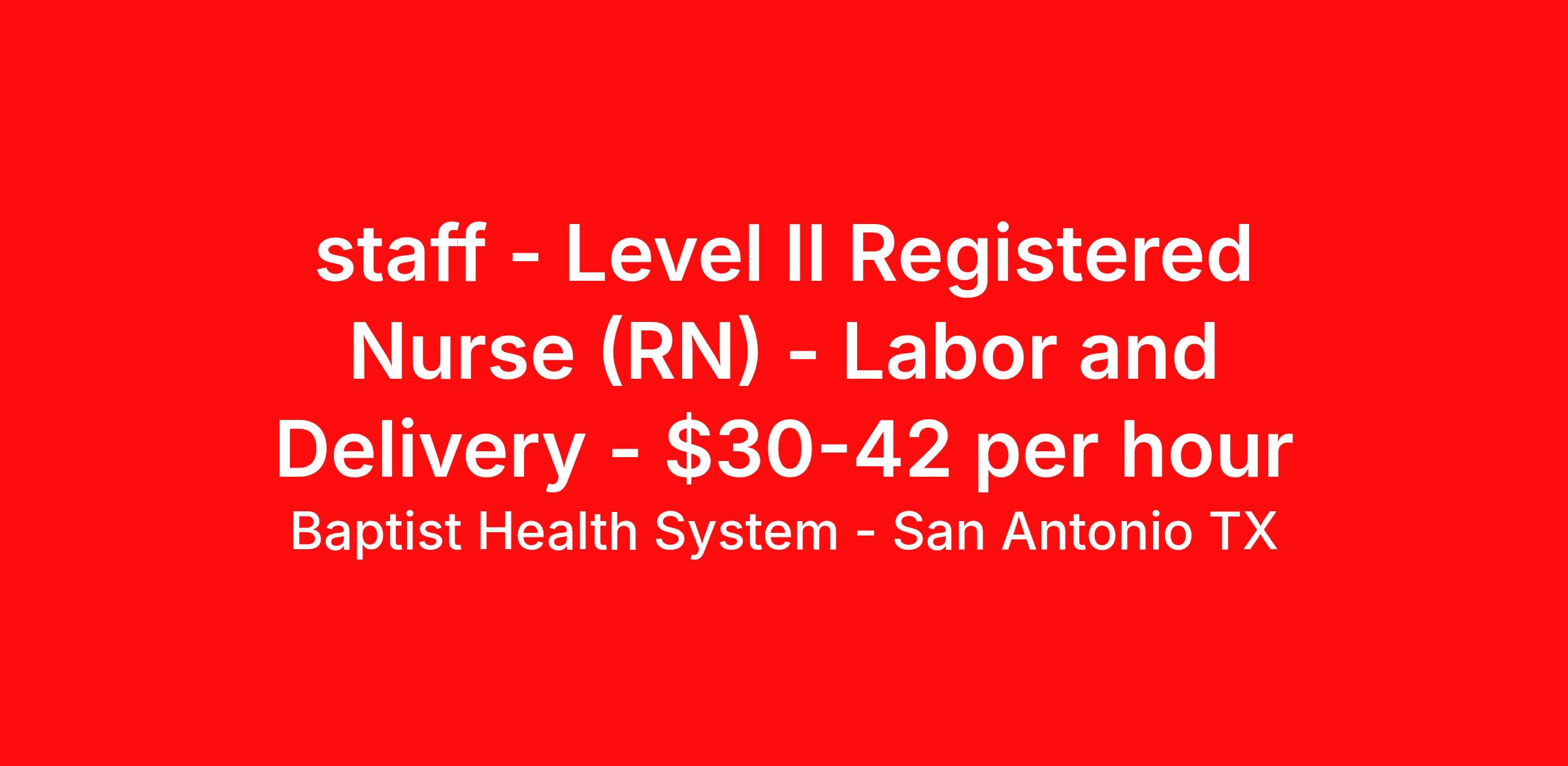 Baptist Health System - San Antonio TX is seeking a Registered Nurse (RN) Labor and Delivery Level II for a nursing job in New Braunfels, Texas. Job Description & Requirements Specialty: Labor and Delivery Discipline: RN Duration: Ongoing 36 hours per week Shift: 12 hours Employment Type: Staff This position may qualify for a sign-on bonus. POSITION SUMMARY Under minimal supervision, provides nursing care for a group of patients assigned to the nurse based on matching the patients’ needs with the nurse’ competencies. Completes established competencies for the position within designated introductory period. Other related duties as assigned. POSITION QUALIFICATIONS MINIMUM EDUCATION: Graduate of accredited school of nursing. PREFERRED EDUCATION: Bachelors Degree MINIMUM EXPERIENCE: None PREFERRED EXPERIENCE: Two years in acute care. Previous clinical nursing experience. REQUIRED CERTIFICATIONS/LICENSURE : Possession of current Texas State License for Registered Nurse PREFERRED CERTIFICATIONS/LICENSURE: REQUIRED COURSES/COMPLETIONS (e.g., CPR): - Must have active healthcare provider Basic Life Support on hire (ARC or AHA); however, must have AHA Healthcare Provider BLS within 60 days of hire. - AHA ACLS must be completed within 60 days of hire or transfer into role (LABOR & DELIVERY) *Should be completed before the end of the orientation period - AHA NRP must be completed within 60 days of hire or transfer into role (LABOR & DELIVERY or any nurse floated into L&D) *Should be completed before the end of the orientation period - Fetal Monitoring - L&D and Antepartum: Novice RNs are required to complete GNOSIS introduction to Fetal Heart Monitoring with 30 days from hire date or transfer date into unit and AWHONN Intermediate Heart Monitoring with 8 months of L&D Orientation. Experienced L&D RNs (>1 yr experience) must have AWHONN Advanced Fetal Heart Monitoring on hire or within the first 90 days of hire, - S.T.A.B.L.E. – Level 2 Nursery-Must provide proof of prior completion or obtain within 6 months of hire or transfer date into unit (Renewal is not required). - AHA PALS must be completed within 60 days of hire or transfer into role (PEDIATRICS) LI-AP1 Baptist Health System - San Antonio Job ID 2503033245. Posted job title: RN II, L&D, PT, Days - RBH Benefits Health Care FSA Dependent Care FSA Life insurance