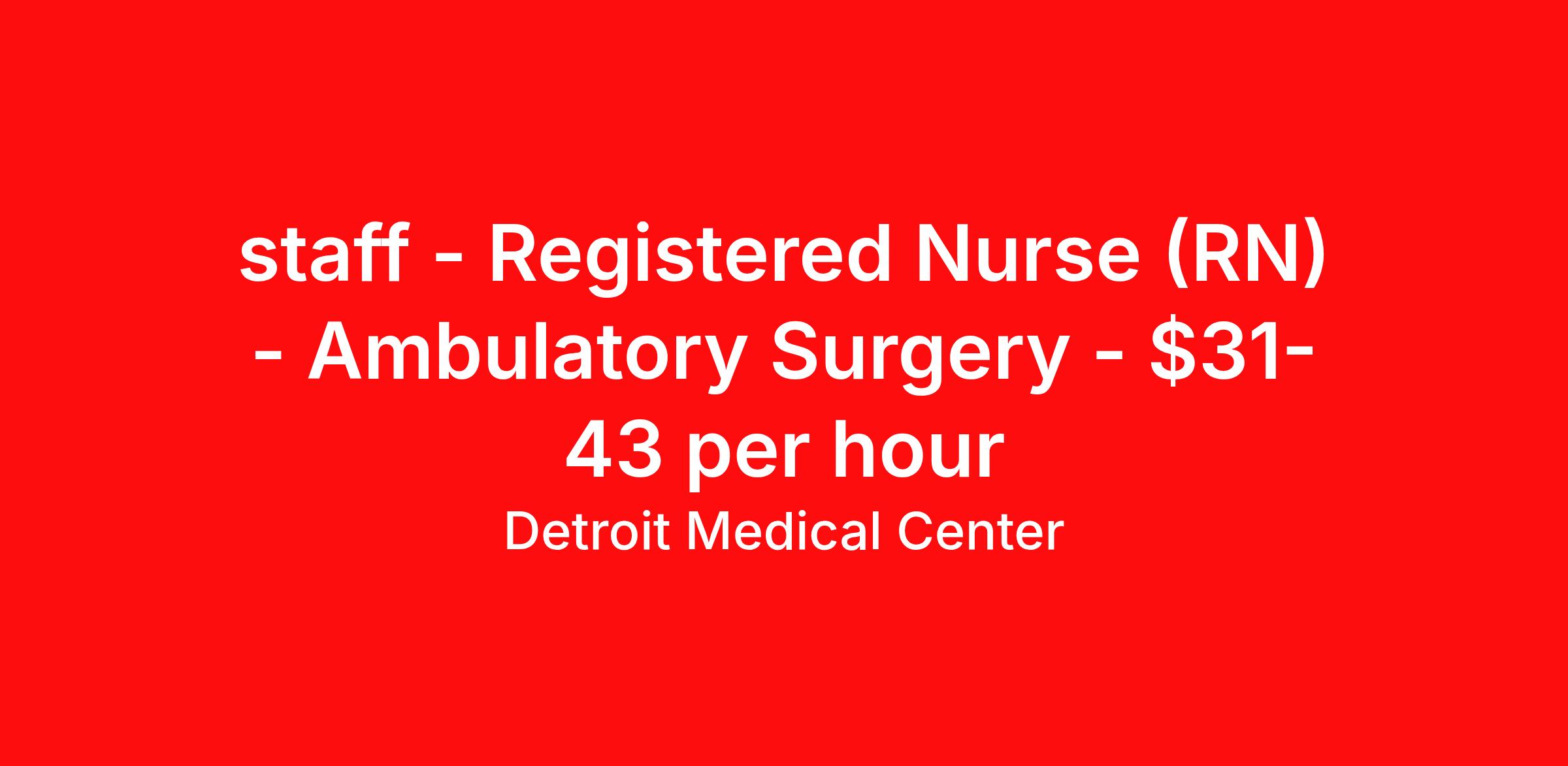 Detroit Medical Center is seeking a Registered Nurse (RN) Ambulatory Surgery for a nursing job in Detroit, Michigan. Job Description & Requirements Specialty: Ambulatory Surgery Discipline: RN Duration: Ongoing 36 hours per week Shift: 12 hours Employment Type: Staff Join our dedicated healthcare team where compassion meets innovation! As a Registered Nurse with us, you'll have the opportunity to make a meaningful impact in patients' lives while enjoying a supportive work environment that fosters professional growth and work-life balance. Ready to be a vital part of our mission? Apply today and bring your passion for nursing to a place where it truly matters! Benefits Statement At Tenet Healthcare, we understand that our greatest asset is our dedicated team of professionals. That’s why we offer more than a job – we provide a comprehensive benefit package that prioritizes your health, professional development, and work-life balance. The available plans and programs include: • Medical, dental, vision, and life insurance • 401(k) retirement savings plan with employer match • Generous paid time off (PTO) • Career development and continuing education opportunities • Health savings accounts, healthcare & dependent flexible spending accounts • Employee Assistance program, Employee discount program • Voluntary benefits include pet insurance, legal insurance, accident and critical illness insurance, long term care, elder & childcare, auto & home insurance. Note: Eligibility for benefits may vary by location and is determined by employment status Job Summary/Description The Detroit Medical Center (DMC) Registered Nurse (RN) is a member of the Patient Care Services Team, and is responsible for the satisfactory completion of nursing care by the nursing team. The RN manages and provides patient care activities for a group of patients and their families through application of independent judgment, communication and collaboration with all team members including ancillary and support services. The role of the Registered Nurse at the DMC encompasses leadership, partnership, collaboration, teaching and supervision. The DMC RN: • Establishes and maintains collaborative relationships with physicians and other health care providers • Delegates, assesses, provides and evaluates patient care • Provides and delegates patient care activities to team members • Monitors patient progress and prepares patient for discharge • Reports directly to senior unit management and participates in shared decision-making activities Qualifications: Minimum Qualifications 1. Graduation from a school of nursing required. 2. BSN preferred. 3. Licensed to practice as a Registered Nurse (RN) in the state of Michigan required. 4. American Heart Association (AHA) BLS required. Facility Description DMC Sinai-Grace Hospital is DMC’s largest hospital, offering a comprehensive heart center, cancer care, gerontology, emergency medicine, obstetrics/gynecology and cosmetic services. Sinai-Grace’s joint replacement program features a revolutionary minimally invasive knee and hip replacement surgery that attracts patients from all over the country. Sinai-Grace operates more than 21 outpatient care sites and ambulatory surgery centers throughout Wayne and Oakland Counties and is one of 10 hospitals in the nation to be awarded a Robert Wood Johnson Foundation grant to help set the standards of cardiac care for hospitals and physicians throughout the nation. EEO Statement Employment practices will not be influenced or affected by an applicant’s or employee’s race, color, religion, sex (including pregnancy), national origin, age, disability, genetic information, sexual orientation, gender identity or expression, veteran status or any other legally protected status. Tenet will make reasonable accommodations for qualified individuals with disabilities unless doing so would result in an undue hardship. Tenet participates in the E-Verify program. Follow the link below for additional information. E-Verify: employment practices of Tenet Healthcare and its companies comply with all applicable laws and regulations Job: Nursing Primary Location: Detroit, Michigan Facility: DMC Sinai-Grace Hospital Job Type: PRN Shift Type: Day Employment practices will not be influenced or affected by an applicant’s or employee’s race, color, religion, sex (including pregnancy), national origin, age, disability, genetic information, sexual orientation, gender identity or expression, veteran status or any other legally protected status. Tenet will make reasonable accommodations for qualified individuals with disabilities unless doing so would result in an undue hardship. Tenet participates in the E-Verify program. Follow the link below for additional information. E-Verify: /> The employment practices of Tenet Healthcare and its companies comply with all applicable laws and regulations. Detroit Medical Center Job ID 43694. Posted job title: Registered Nurse OR (RN) - Ambulatory About Detroit Medical Center The Detroit Medical Center (DMC) is the leading academically–integrated hospital system in Metro Detroit, and one of the largest health care providers in Southeast Michigan. During our 150 years of caring for the community, we have been recognized nationally with top awards in many aspects of hospital operations and patient care. The DMC is able to achieve these awards because of our exceptional employees. The Detroit Medical Center is one the largest academic medical centers in the United States, with a long and rich history of medical education, for more than 100 years. We train more physicians than any other hospital in Detroit. Our evidence-based approach inspires confidence and spurs innovation. It ensures that we are making treatment decisions based on our experience, on the best available research and our understanding of each patient as an individual. Our commitment to our patients Our commitment to patient care and improvin