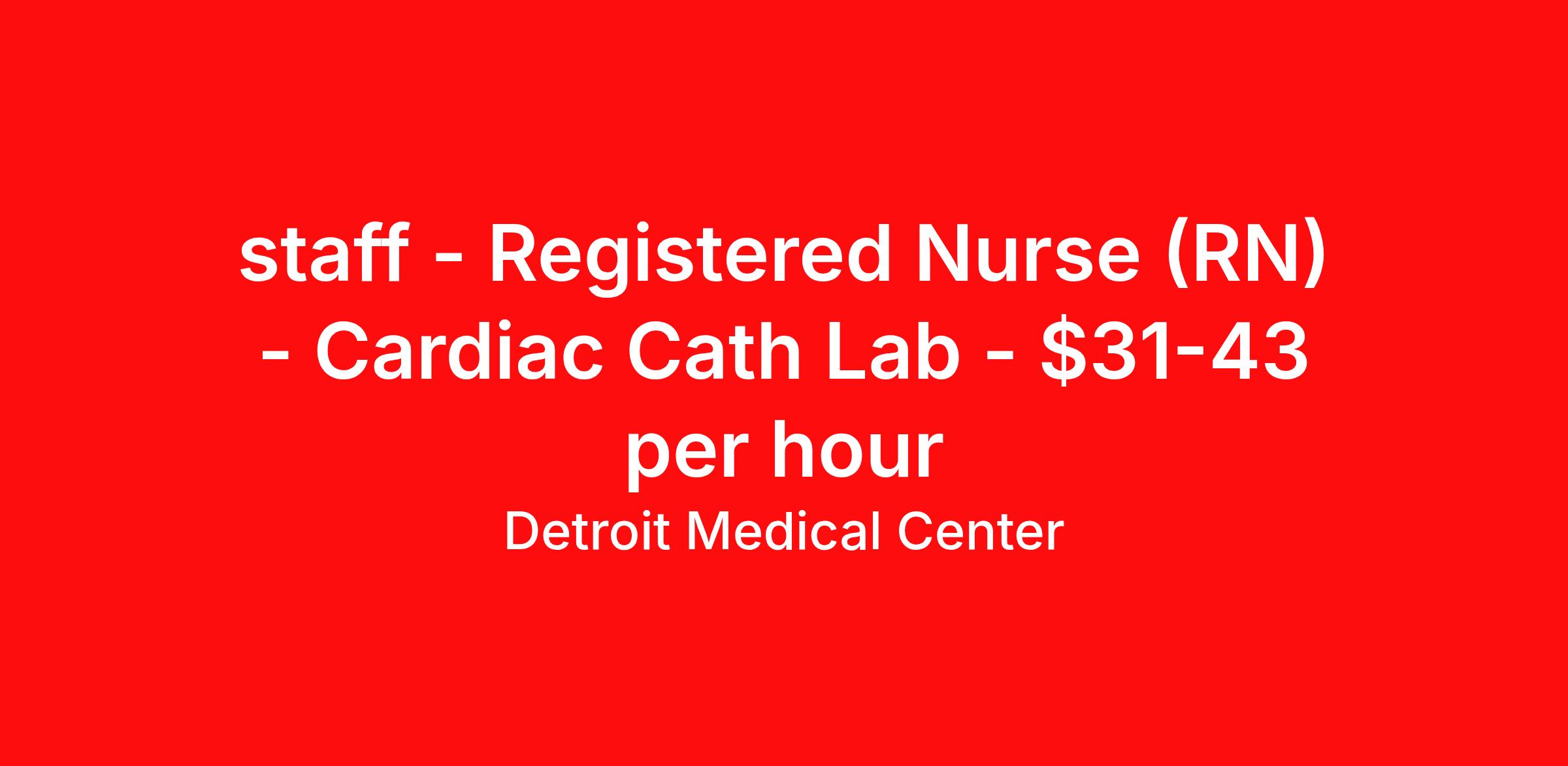 Detroit Medical Center is seeking a Registered Nurse (RN) Cardiac Cath Lab for a nursing job in Detroit, Michigan. Job Description & Requirements Specialty: Cardiac Cath Lab Discipline: RN Duration: Ongoing 36 hours per week Shift: 12 hours Employment Type: Staff Up to $10,000 Sign on Bonus, based on relevant experience Join our dedicated healthcare team where compassion meets innovation! As a Registered Nurse with us, you'll have the opportunity to make a meaningful impact in patients' lives while enjoying a supportive work environment that fosters professional growth and work-life balance. Ready to be a vital part of our mission? Apply today and bring your passion for nursing to a place where it truly matters! Benefits Statement At Tenet Healthcare, we understand that our greatest asset is our dedicated team of professionals. That’s why we offer more than a job – we provide a comprehensive benefit package that prioritizes your health, professional development, and work-life balance. The available plans and programs include: • Medical, dental, vision, and life insurance • 401(k) retirement savings plan with employer match • Generous paid time off (PTO) • Career development and continuing education opportunities • Health savings accounts, healthcare & dependent flexible spending accounts • Employee Assistance program, Employee discount program • Voluntary benefits include pet insurance, legal insurance, accident and critical illness insurance, long term care, elder & childcare, auto & home insurance. Note: Eligibility for benefits may vary by location and is determined by employment status Job Summary/Description The Detroit Medical Center (DMC) Registered Nurse (RN) is a member of the Patient Care Services Team, and is responsible for the satisfactory completion of nursing care by the nursing team. The RN manages and provides patient care activities for a group of patients and their families through application of independent judgment, communication and collaboration with all team members including ancillary and support services. The role of the Registered Nurse at the DMC encompasses leadership, partnership, collaboration, teaching and supervision. The DMC RN: • Establishes and maintains collaborative relationships with physicians and other health care providers • Delegates, assesses, provides and evaluates patient care • Provides and delegates patient care activities to team members • Monitors patient progress and prepares patient for discharge • Reports directly to senior unit management and participates in shared decision-making activities Qualifications: Minimum Qualifications 1. Graduation from a school of nursing required. 2. BSN preferred. 3. Licensed to practice as a Registered Nurse (RN) in the state of Michigan required. 4. American Heart Association (AHA) BLS required. Facility Description DMC Harper University Hospital has distinguished itself in surgery and medicine and is known for its clinical expertise and innovative research. A specialty referral hospital, Harper has established Centers of Excellence in neurosciences, bariatric surgery, vascular services, multidisciplinary cardiovascular services, hypertension, stroke prevention and heart failure. EEO Statement Employment practices will not be influenced or affected by an applicant’s or employee’s race, color, religion, sex (including pregnancy), national origin, age, disability, genetic information, sexual orientation, gender identity or expression, veteran status or any other legally protected status. Tenet will make reasonable accommodations for qualified individuals with disabilities unless doing so would result in an undue hardship. Tenet participates in the E-Verify program. Follow the link below for additional information. E-Verify: employment practices of Tenet Healthcare and its companies comply with all applicable laws and regulations Job: Nursing Primary Location: Detroit, Michigan Facility: DMC Harper University/Hutzel Women's Hospital Job Type: Full Time Shift Type: Day Employment practices will not be influenced or affected by an applicant’s or employee’s race, color, religion, sex (including pregnancy), national origin, age, disability, genetic information, sexual orientation, gender identity or expression, veteran status or any other legally protected status. Tenet will make reasonable accommodations for qualified individuals with disabilities unless doing so would result in an undue hardship. Tenet participates in the E-Verify program. Follow the link below for additional information. E-Verify: /> The employment practices of Tenet Healthcare and its companies comply with all applicable laws and regulations. Detroit Medical Center Job ID 43694. Posted job title: Registered Nurse (RN) - Cath Lab About Detroit Medical Center The Detroit Medical Center (DMC) is the leading academically–integrated hospital system in Metro Detroit, and one of the largest health care providers in Southeast Michigan. During our 150 years of caring for the community, we have been recognized nationally with top awards in many aspects of hospital operations and patient care. The DMC is able to achieve these awards because of our exceptional employees. The Detroit Medical Center is one the largest academic medical centers in the United States, with a long and rich history of medical education, for more than 100 years. We train more physicians than any other hospital in Detroit. Our evidence-based approach inspires confidence and spurs innovation. It ensures that we are making treatment decisions based on our experience, on the best available research and our understanding of each patient as an individual. Our commitment to our patients Our commitment to patient care and improving patient outcomes is part of everything we do. It’s our mission. It’s our promise to every patient and every family who entrusts their care to us. To meet the needs of our community, we operate 8 hospitals and more