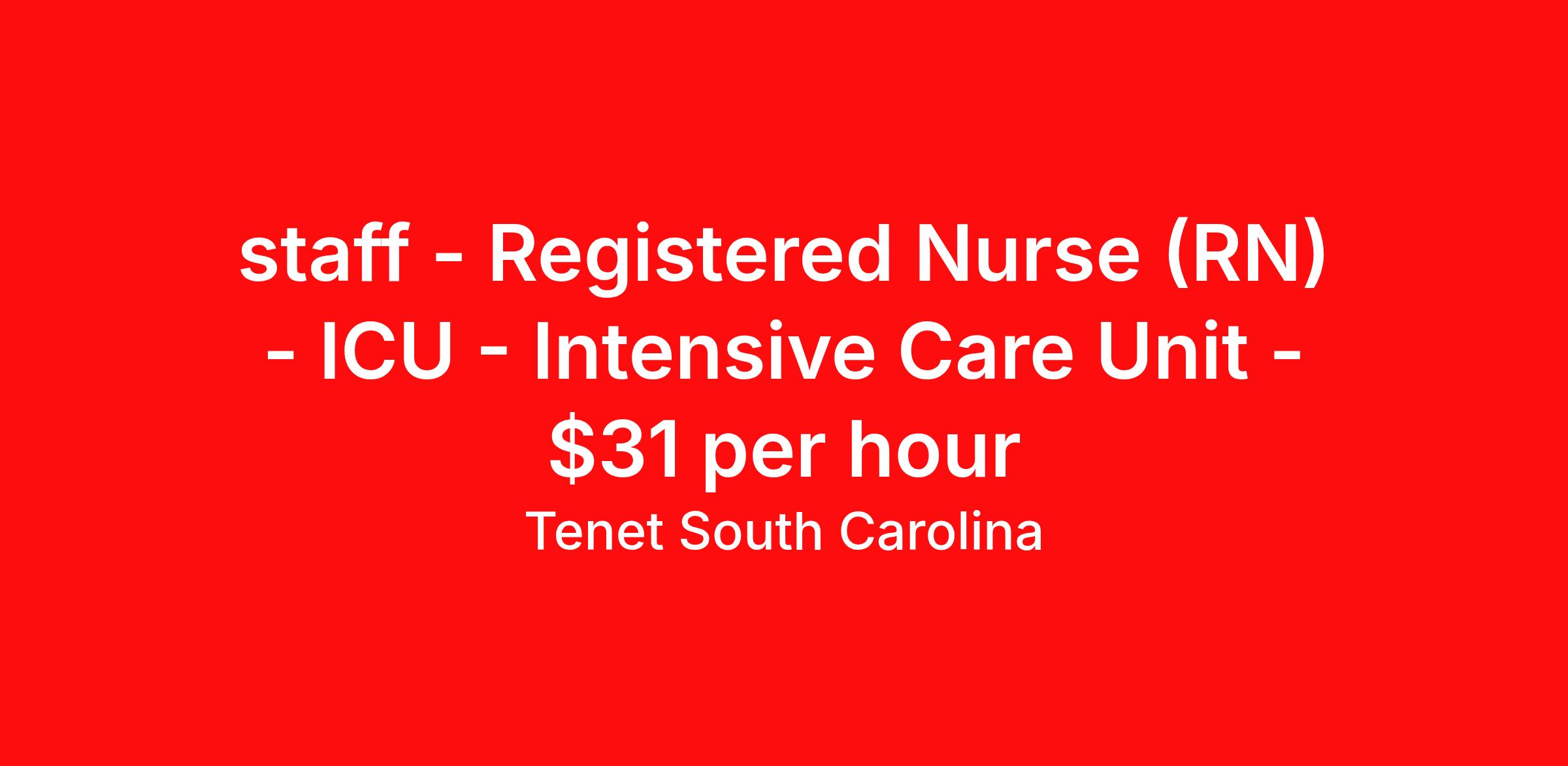 Tenet South Carolina is seeking a Registered Nurse (RN) ICU - Intensive Care Unit for a nursing job in Fort Mill, South Carolina. Job Description & Requirements Specialty: ICU - Intensive Care Unit Discipline: RN Duration: Ongoing 36 hours per week Shift: 12 hours Employment Type: Staff Up to $20,000 Sign-on Bonus Based on Eligibility Provide, promote and maintain quality patient care during diagnostic and therapeutic imaging procedures through education, standards of practice, professional growth, and collaboration with other multidisciplinary health care providers. Initiates and documents a written plan of care within specified timeframe Performs patient interventions completely and proficiently and demonstrates age specific competency for population of patients served. Verifies, during hospitalization, orders for accuracy (including reconciliation of medications), appropriate scheduling of tests and/or procedures, pre-op data, and consent forms. Follows medication and IV Therapy policies including patient identification, understanding about medications, administering meds and recognizing/reporting interactions 100% of the time. Appropriately monitors first dose medication(s) for adverse reactions. Interprets diagnostic data and takes appropriate action when indicated (i.e. notification of critical lab values to physician per hospital protocol). Performs related duties as required. Required: Education: Associate’s degree in Nursing required. Experience: Each candidate’s previous clinical experience is reviewed to determine acceptable experience. Certifications/Registrations/Licenses: A valid Permanent Multi-State RN License from the state in which you reside is required. Should you hold a RN license from another Compact state, you are required to apply for and obtain a Multi-State RN License from the state in which you reside within 30 days. American Heart Association BLS CPR required, must be obtained within 7 days of hire. American Heart Association ACLS and NIHSS is required within orientation period for ICU/CCU, SICU, and CVICU. Preferred: One year of telemetry experience preferred. CCRN preferred. Tenet South Carolina Job ID 2603002870. Posted job title: Registered Nurse (RN) - ICU Benefits Sign-On bonus