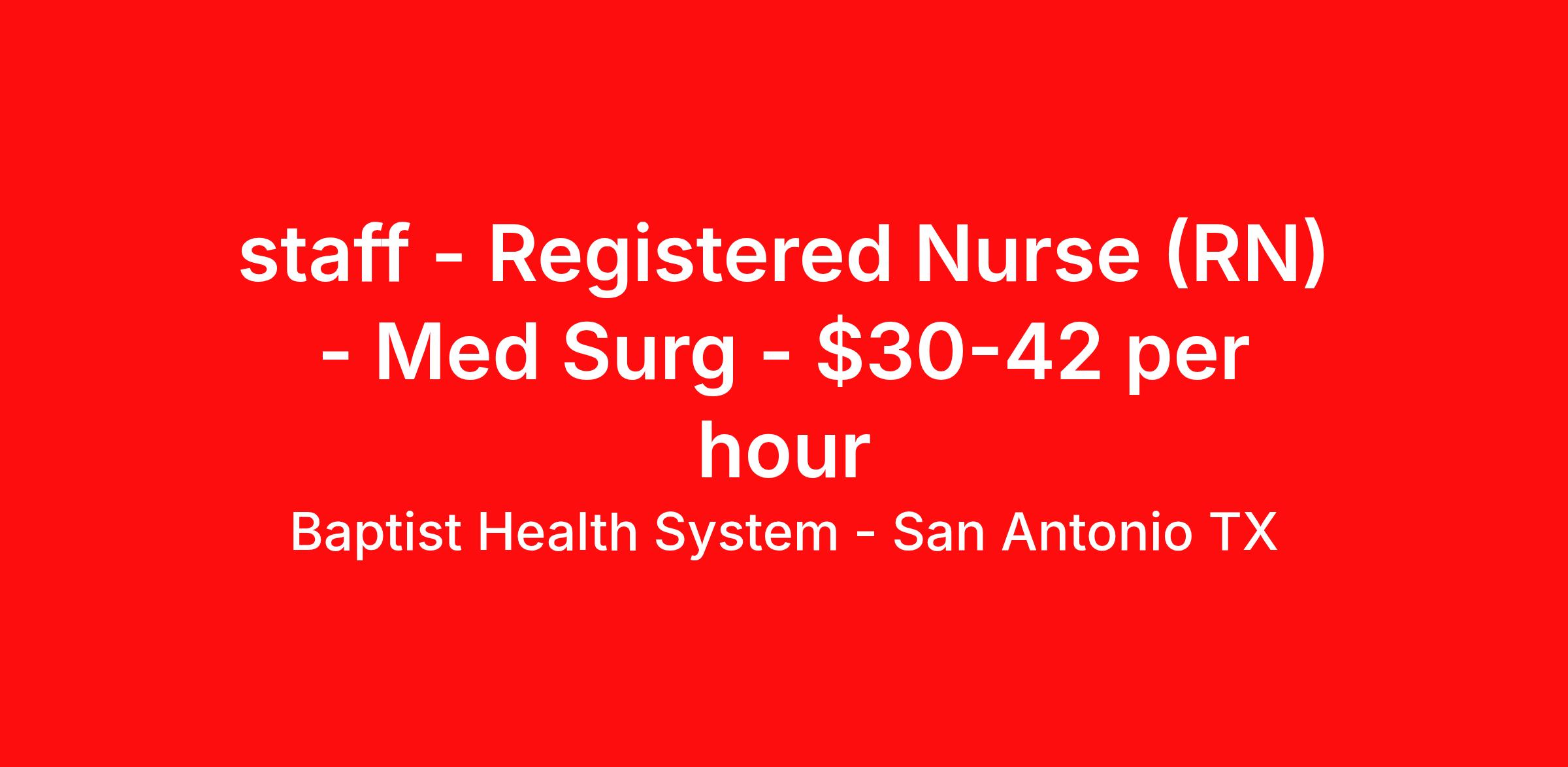Baptist Health System - San Antonio TX is seeking a Registered Nurse (RN) Med Surg for a nursing job in San Antonio, Texas. Job Description & Requirements Specialty: Med Surg Discipline: RN Duration: Ongoing 36 hours per week Shift: 12 hours Employment Type: Staff This position may qualify for a sign-on bonus. Summary Under minimal supervision, provides professional nursing care for patients ranging in age from newborn to geriatric, within the nurse’s competencies following established standards and practices. Supports the mission statement, policies and procedures of the Baptist Health System. Completes established competencies for the position within designated introductory period. Other related duties as assigned. MINIMUM EDUCATION: Graduate of accredited school of nursing PREFERRED EDUCATION: Bachelors Degree PREFERRED EXPERIENCE: Completion of peri-anesthesia or critical care internship/training course REQUIRED CERTIFICATIONS/LICENSURE: Possession of current Texas State License for Registered Nurse or currently eligible for state board certification. PREFERRED CERTIFICATIONS/LICENSURE: Surgery - CNOR Board eligible/certified Post Anesthesia-CPAN Board eligible/certified GI Lab –SGNA Board eligible/certified REQUIRED COURSES/COMPLETIONS (e.g., CPR): BLS - Must have active healthcare provider Basic Life Support on hire (ARC or AHA); however, must have AHA Healthcare Provider BLS within 60 days of hire. AHA ACLS must be completed within 60 days of hire or transfer into role for all Surgical Services areas. AHA PALS must be completed within 60 days of hire or transfer into role for Post Anesthesia Care Unit. LI-GF2 Baptist Health System - San Antonio Job ID 2503034059. Posted job title: Registered Nurse (RN) - SDS Benefits Health Care FSA Dependent Care FSA Life insurance
