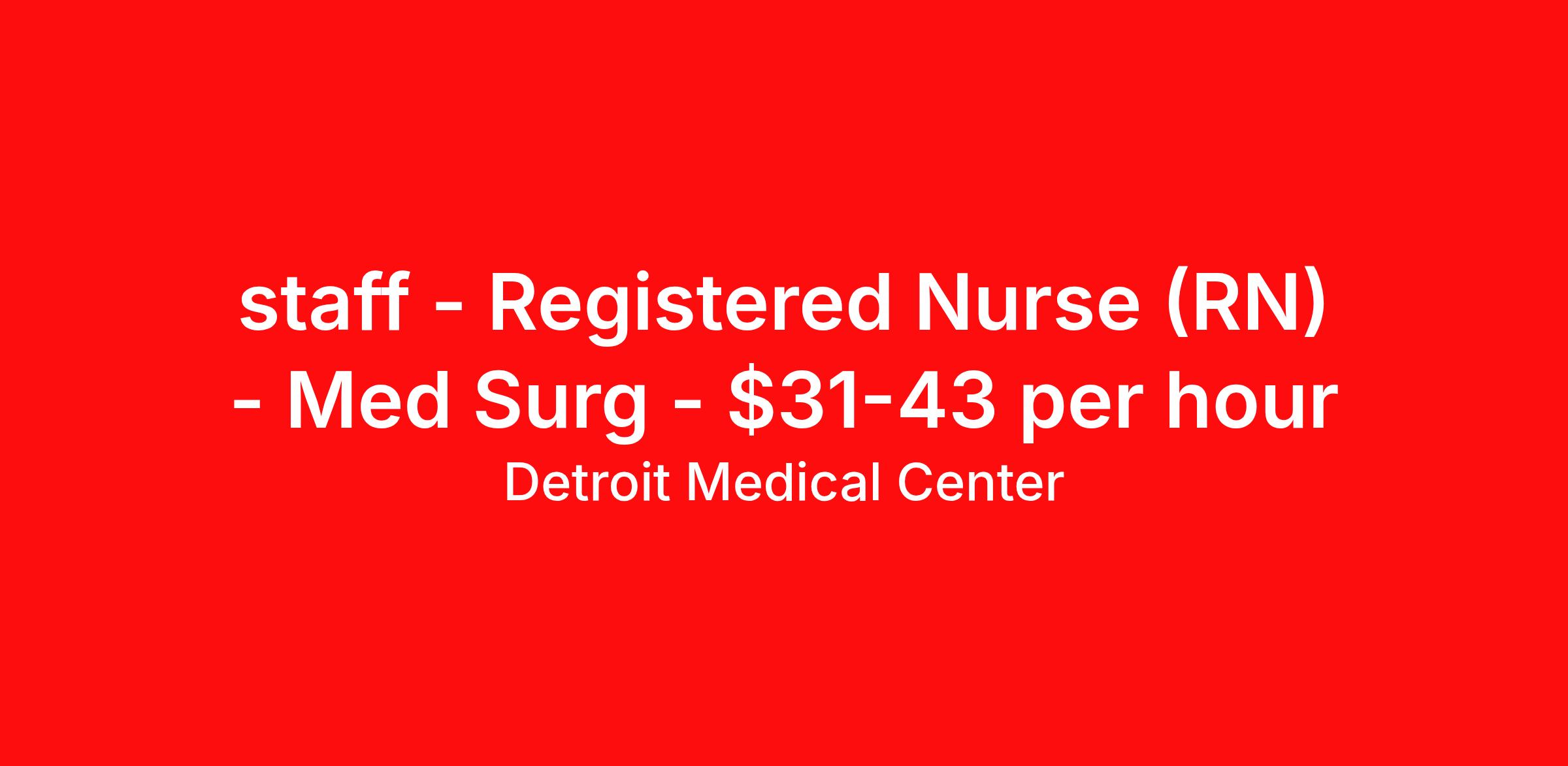 Detroit Medical Center is seeking a Registered Nurse (RN) Med Surg for a nursing job in Detroit, Michigan. Job Description & Requirements Specialty: Med Surg Discipline: RN Duration: Ongoing 36 hours per week Shift: 12 hours Employment Type: Staff Up to $25,000 Sign on Bonus, based on relevant experience Join our dedicated healthcare team where compassion meets innovation! As a Registered Nurse with us, you'll have the opportunity to make a meaningful impact in patients' lives while enjoying a supportive work environment that fosters professional growth and work-life balance. Ready to be a vital part of our mission? Apply today and bring your passion for nursing to a place where it truly matters! Benefits Statement At Tenet Healthcare, we understand that our greatest asset is our dedicated team of professionals. That’s why we offer more than a job – we provide a comprehensive benefit package that prioritizes your health, professional development, and work-life balance. The available plans and programs include: • Medical, dental, vision, and life insurance • 401(k) retirement savings plan with employer match • Generous paid time off (PTO) • Career development and continuing education opportunities • Health savings accounts, healthcare & dependent flexible spending accounts • Employee Assistance program, Employee discount program • Voluntary benefits include pet insurance, legal insurance, accident and critical illness insurance, long term care, elder & childcare, auto & home insurance. Note: Eligibility for benefits may vary by location and is determined by employment status Job Summary The Detroit Medical Center (DMC) Registered Nurse (RN) is a member of the Patient Care Services Team, and is responsible for the satisfactory completion of nursing care by the nursing team. The RN manages and provides patient care activities for a group of patients and their families through application of independent judgment, communication and collaboration with all team members including ancillary and support services. The role of the Registered Nurse at the DMC encompasses leadership, partnership, collaboration, teaching and supervision. The DMC RN: • Establishes and maintains collaborative relationships with physicians and other health care providers • Delegates, assesses, provides and evaluates patient care • Provides and delegates patient care activities to team members • Monitors patient progress and prepares patient for discharge • Reports directly to senior unit management and participates in shared decision-making activities Qualifications: Minimum Qualifications 1. Graduation from a school of nursing required. 2. BSN preferred. 3. Licensed to practice as a Registered Nurse (RN) in the state of Michigan required. 4. American Heart Association (AHA) BLS required. Facility Statement Children’s Hospital of Michigan is an international leader in pediatric and adolescent medicine. Surgical services include general, thoracic, reconstructive and cardiovascular. Imaging technology designed specifically for children provides advanced diagnostic services including Positron Emission Tomography (PET) and MRI. The Children’s Hospital of Michigan Emergency Department is a verified Level 1 Pediatric Trauma Center and dedicated pediatric burn center. Experts in pediatric critical care, rehabilitation, and neonatal and perinatal medicine provide care for thousands of children every year at Children’s Hospital of Michigan, Children’s Hospital of Michigan - Troy and six ambulatory sites. EEO Statement Employment practices will not be influenced or affected by an applicant’s or employee’s race, color, religion, sex (including pregnancy), national origin, age, disability, genetic information, sexual orientation, gender identity or expression, veteran status or any other legally protected status. Tenet will make reasonable accommodations for qualified individuals with disabilities unless doing so would result in an undue hardship. Tenet participates in the E-Verify program. Follow the link below for additional information. E-Verify: The employment practices of Tenet Healthcare and its companies comply with all applicable laws and regulations Job: Nursing Primary Location: Detroit, Michigan Facility: DMC Children's Hospital of Michigan Job Type: Full Time Shift Type: Night Employment practices will not be influenced or affected by an applicant’s or employee’s race, color, religion, sex (including pregnancy), national origin, age, disability, genetic information, sexual orientation, gender identity or expression, veteran status or any other legally protected status. Tenet will make reasonable accommodations for qualified individuals with disabilities unless doing so would result in an undue hardship. Tenet participates in the E-Verify program. Follow the link below for additional information. E-Verify: /> The employment practices of Tenet Healthcare and its companies comply with all applicable laws and regulations. Detroit Medical Center Job ID 43694. Posted job title: Registered Nurse (RN) - Med Surg About Detroit Medical Center The Detroit Medical Center (DMC) is the leading academically–integrated hospital system in Metro Detroit, and one of the largest health care providers in Southeast Michigan. During our 150 years of caring for the community, we have been recognized nationally with top awards in many aspects of hospital operations and patient care. The DMC is able to achieve these awards because of our exceptional employees. The Detroit Medical Center is one the largest academic medical centers in the United States, with a long and rich history of medical education, for more than 100 years. We train more physicians than any other hospital in Detroit. Our evidence-based approach inspires confidence and spurs innovation. It ensures that we are making treatment decisions based on our experience, on the best available research and our understanding of each patient as an 