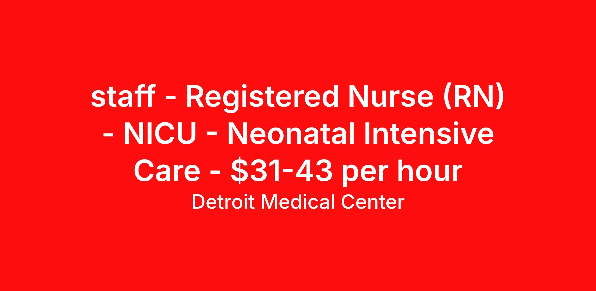 Detroit Medical Center is seeking a Registered Nurse (RN) NICU - Neonatal Intensive Care for a nursing job in Detroit, Michigan. Job Description & Requirements Specialty: NICU - Neonatal Intensive Care Discipline: RN Duration: Ongoing 36 hours per week Shift: 12 hours Employment Type: Staff Up to $10,000 Sign on Bonus, based on relevant experience Join our dedicated healthcare team where compassion meets innovation! As a Registered Nurse with us, you'll have the opportunity to make a meaningful impact in patients' lives while enjoying a supportive work environment that fosters professional growth and work-life balance. Ready to be a vital part of our mission? Apply today and bring your passion for nursing to a place where it truly matters! Benefits Statement At Tenet Healthcare, we understand that our greatest asset is our dedicated team of professionals. That’s why we offer more than a job – we provide a comprehensive benefit package that prioritizes your health, professional development, and work-life balance. The available plans and programs include: • Medical, dental, vision, and life insurance • 401(k) retirement savings plan with employer match • Generous paid time off (PTO) • Career development and continuing education opportunities • Health savings accounts, healthcare & dependent flexible spending accounts • Employee Assistance program, Employee discount program • Voluntary benefits include pet insurance, legal insurance, accident and critical illness insurance, long term care, elder & childcare, auto & home insurance. Note: Eligibility for benefits may vary by location and is determined by employment status Job Summary/Description The Detroit Medical Center (DMC) Registered Nurse (RN) is a member of the Patient Care Services Team, and is responsible for the satisfactory completion of nursing care by the nursing team. The RN manages and provides patient care activities for a group of patients and their families through application of independent judgment, communication and collaboration with all team members including ancillary and support services. The role of the Registered Nurse at the DMC encompasses leadership, partnership, collaboration, teaching and supervision. The DMC RN: • Establishes and maintains collaborative relationships with physicians and other health care providers • Delegates, assesses, provides and evaluates patient care • Provides and delegates patient care activities to team members • Monitors patient progress and prepares patient for discharge • Reports directly to senior unit management and participates in shared decision-making activities Qualifications: Minimum Qualifications 1. Graduation from a school of nursing required. 2. BSN preferred. 3. Licensed to practice as a Registered Nurse (RN) in the state of Michigan required. 4. American Heart Association (AHA) BLS required. Facility Description Children’s Hospital of Michigan is an international leader in pediatric and adolescent medicine. Surgical services include general, thoracic, reconstructive and cardiovascular. Imaging technology designed specifically for children provides advanced diagnostic services including Positron Emission Tomography (PET) and MRI. The Children’s Hospital of Michigan Emergency Department is a verified Level 1 Pediatric Trauma Center and dedicated pediatric burn center. Experts in pediatric critical care, rehabilitation, and neonatal and perinatal medicine provide care for thousands of children every year at Children’s Hospital of Michigan, Children’s Hospital of Michigan - Troy and six ambulatory sites. EEO Statement Employment practices will not be influenced or affected by an applicant’s or employee’s race, color, religion, sex (including pregnancy), national origin, age, disability, genetic information, sexual orientation, gender identity or expression, veteran status or any other legally protected status. Tenet will make reasonable accommodations for qualified individuals with disabilities unless doing so would result in an undue hardship. Tenet participates in the E-Verify program. Follow the link below for additional information. E-Verify: employment practices of Tenet Healthcare and its companies comply with all applicable laws and regulations Job: Nursing Primary Location: Detroit, Michigan Facility: DMC Children's Hospital of Michigan Job Type: Full Time Shift Type: Rotating Employment practices will not be influenced or affected by an applicant’s or employee’s race, color, religion, sex (including pregnancy), national origin, age, disability, genetic information, sexual orientation, gender identity or expression, veteran status or any other legally protected status. Tenet will make reasonable accommodations for qualified individuals with disabilities unless doing so would result in an undue hardship. Tenet participates in the E-Verify program. Follow the link below for additional information. E-Verify: /> The employment practices of Tenet Healthcare and its companies comply with all applicable laws and regulations. Detroit Medical Center Job ID 43690. Posted job title: Registered Nurse (RN) - Neonatal About Detroit Medical Center The Detroit Medical Center (DMC) is the leading academically–integrated hospital system in Metro Detroit, and one of the largest health care providers in Southeast Michigan. During our 150 years of caring for the community, we have been recognized nationally with top awards in many aspects of hospital operations and patient care. The DMC is able to achieve these awards because of our exceptional employees. The Detroit Medical Center is one the largest academic medical centers in the United States, with a long and rich history of medical education, for more than 100 years. We train more physicians than any other hospital in Detroit. Our evidence-based approach inspires confidence and spurs innovation. It ensures that we are making treatment decisions based on our experience, on the best availa