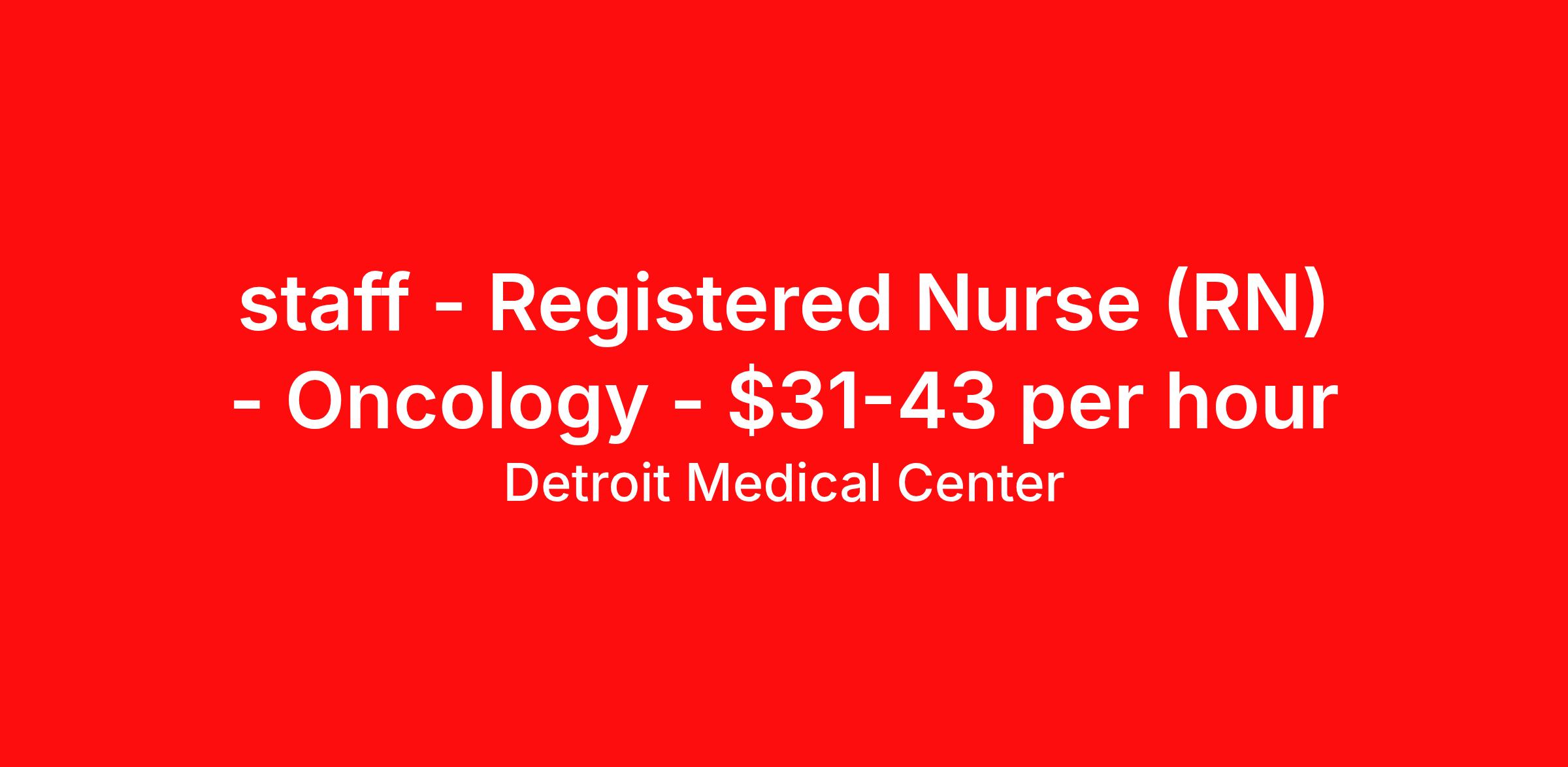Detroit Medical Center is seeking a Registered Nurse (RN) Oncology for a nursing job in Detroit, Michigan. Job Description & Requirements Specialty: Oncology Discipline: RN Duration: Ongoing 36 hours per week Shift: 12 hours Employment Type: Staff Join our dedicated healthcare team where compassion meets innovation! As a Registered Nurse with us, you'll have the opportunity to make a meaningful impact in patients' lives while enjoying a supportive work environment that fosters professional growth and work-life balance. Ready to be a vital part of our mission? Apply today and bring your passion for nursing to a place where it truly matters! Benefits Statement At Tenet Healthcare, we understand that our greatest asset is our dedicated team of professionals. That’s why we offer more than a job – we provide a comprehensive benefit package that prioritizes your health, professional development, and work-life balance. The available plans and programs include: • Medical, dental, vision, and life insurance • 401(k) retirement savings plan with employer match • Generous paid time off (PTO) • Career development and continuing education opportunities • Health savings accounts, healthcare & dependent flexible spending accounts • Employee Assistance program, Employee discount program • Voluntary benefits include pet insurance, legal insurance, accident and critical illness insurance, long term care, elder & childcare, auto & home insurance. Note: Eligibility for benefits may vary by location and is determined by employment status Job Summary/Description The Detroit Medical Center (DMC) Registered Nurse (RN) is a member of the Patient Care Services Team, and is responsible for the satisfactory completion of nursing care by the nursing team. The RN manages and provides patient care activities for a group of patients and their families through application of independent judgment, communication and collaboration with all team members including ancillary and support services. The role of the Registered Nurse at the DMC encompasses leadership, partnership, collaboration, teaching and supervision. The DMC RN: • Establishes and maintains collaborative relationships with physicians and other health care providers • Delegates, assesses, provides and evaluates patient care • Provides and delegates patient care activities to team members • Monitors patient progress and prepares patient for discharge • Reports directly to senior unit management and participates in shared decision-making activities Qualifications: Minimum Qualifications 1. Graduation from a school of nursing required. 2. BSN preferred. 3. Licensed to practice as a Registered Nurse (RN) in the state of Michigan required. 4. American Heart Association (AHA) BLS required. Facility Description Children’s Hospital of Michigan is an international leader in pediatric and adolescent medicine. Surgical services include general, thoracic, reconstructive and cardiovascular. Imaging technology designed specifically for children provides advanced diagnostic services including Positron Emission Tomography (PET) and MRI. The Children’s Hospital of Michigan Emergency Department is a verified Level 1 Pediatric Trauma Center and dedicated pediatric burn center. Experts in pediatric critical care, rehabilitation, and neonatal and perinatal medicine provide care for thousands of children every year at Children’s Hospital of Michigan, Children’s Hospital of Michigan - Troy and six ambulatory sites. EEO Statement Employment practices will not be influenced or affected by an applicant’s or employee’s race, color, religion, sex (including pregnancy), national origin, age, disability, genetic information, sexual orientation, gender identity or expression, veteran status or any other legally protected status. Tenet will make reasonable accommodations for qualified individuals with disabilities unless doing so would result in an undue hardship. Tenet participates in the E-Verify program. Follow the link below for additional information. E-Verify: employment practices of Tenet Healthcare and its companies comply with all applicable laws and regulations Job: Nursing Primary Location: Detroit, Michigan Facility: DMC Children's Hospital of Michigan Job Type: PRN Shift Type: Night Employment practices will not be influenced or affected by an applicant’s or employee’s race, color, religion, sex (including pregnancy), national origin, age, disability, genetic information, sexual orientation, gender identity or expression, veteran status or any other legally protected status. Tenet will make reasonable accommodations for qualified individuals with disabilities unless doing so would result in an undue hardship. Tenet participates in the E-Verify program. Follow the link below for additional information. E-Verify: /> The employment practices of Tenet Healthcare and its companies comply with all applicable laws and regulations. Detroit Medical Center Job ID 43690. Posted job title: Registered Nurse (RN) - Oncology About Detroit Medical Center The Detroit Medical Center (DMC) is the leading academically–integrated hospital system in Metro Detroit, and one of the largest health care providers in Southeast Michigan. During our 150 years of caring for the community, we have been recognized nationally with top awards in many aspects of hospital operations and patient care. The DMC is able to achieve these awards because of our exceptional employees. The Detroit Medical Center is one the largest academic medical centers in the United States, with a long and rich history of medical education, for more than 100 years. We train more physicians than any other hospital in Detroit. Our evidence-based approach inspires confidence and spurs innovation. It ensures that we are making treatment decisions based on our experience, on the best available research and our understanding of each patient as an individual. Our commitment to our patients Our commitm