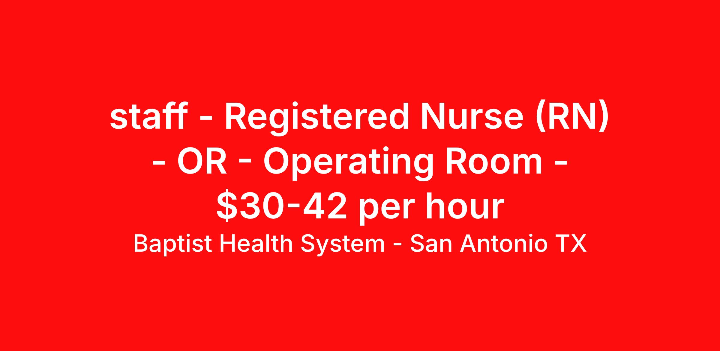 Baptist Health System - San Antonio TX is seeking a Registered Nurse (RN) OR - Operating Room for a nursing job in San Antonio, Texas. Job Description & Requirements Specialty: OR - Operating Room Discipline: RN Duration: Ongoing 36 hours per week Shift: 12 hours Employment Type: Staff Provides expert education and mentoring for nursing staff, hospital administration, physicians, patients, families, and the community. Applies specialized knowledge, demonstrates skills and competencies in the delivery of nursing care. The RN provides high-quality, safe, cost-effective, total nursing care to all patients. The RN assumes responsibility for overall coordination and integration of patient care based on the nursing process. The RN directs care according to established standards of safety, risk management, QI, and Infection Control, with the goal being to discharge the patient with an optimum level of care provided. Assumes responsibility for coordination and planning of patient care with the prescribed medical regimen. Administers all medication safely and in a timely manner per hospital policy. Performs and fulfills all HICS (Hospital Incident Command System) responsibilities, assignments, tasks and roles as directed and needed by the facility in times of emergency and/or disaster. Responsible for knowing the Hospital's emergency codes, including the purpose and appropriate action for each, and adheres to the Hospital policies and procedures for each emergency code. Education: Required: Graduate of an accredited school of nursing. Preferred: Bachelor's or master's degree. Experience: Required: Recent acute care experience. Recent experience in specialty. Certifications: Required: Currently licensed, certified, or registered to practice profession as required by law, regulation in state of practice or policy; AHA BLS and if applicable by corporate policy for unit of hire, AHA ACLS and/or PALS and/or NRP. Physical Demands: Baptist Health System - San Antonio Job ID 2503033984. Posted job title: Registered Nurse (RN) - Operating Room Benefits Health Care FSA Dependent Care FSA Life insurance