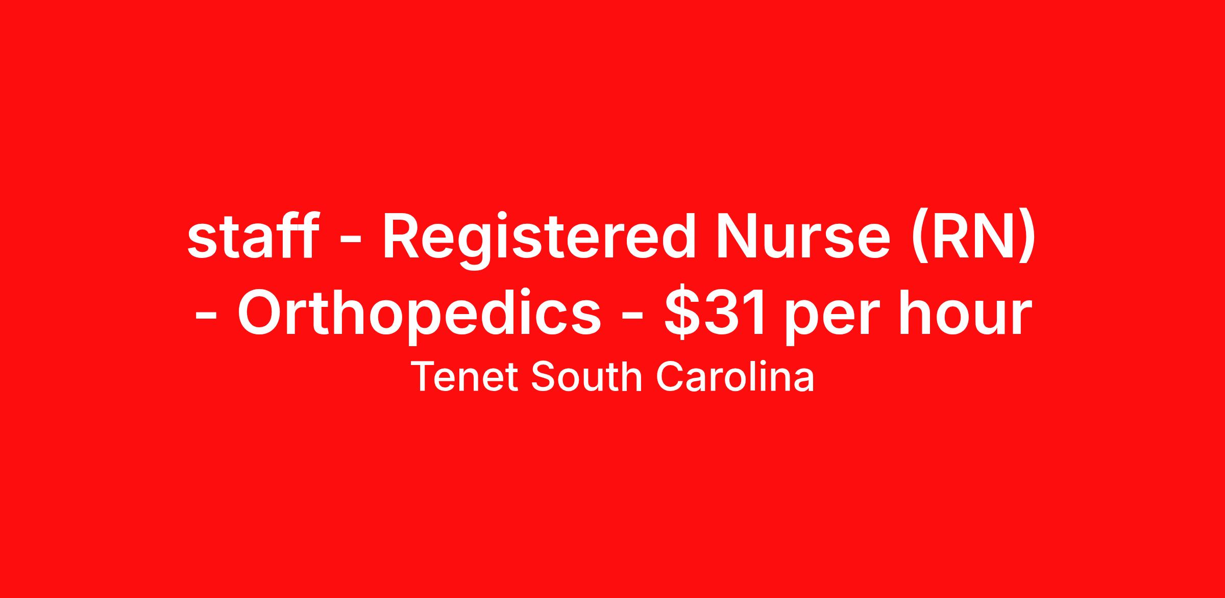 Tenet South Carolina is seeking a Registered Nurse (RN) Orthopedics for a nursing job in Rock Hill, South Carolina. Job Description & Requirements Specialty: Orthopedics Discipline: RN Duration: Ongoing 36 hours per week Shift: 12 hours Employment Type: Staff Up to $20,000 Sign-on Bonus Based on Eligibility Provide, promote and maintain quality patient care during diagnostic and therapeutic imaging procedures through education, standards of practice, professional growth, and collaboration with other multidisciplinary health care providers. Initiates and documents a written plan of care within specified timeframe Performs patient interventions completely and proficiently and demonstrates age specific competency for population of patients served. Provides appropriate treatment in emergency situations as they arise. Verifies, during hospitalization, orders for accuracy (including reconciliation of medications), appropriate scheduling of tests and/or procedures, pre-op data, and consent forms. Follows medication and IV Therapy policies including patient identification, understanding about medications, administering meds and recognizing/reporting interactions 100% of the time. Appropriately monitors first dose medication(s) for adverse reactions. Performs related duties as required. Required: Education: Associate’s degree in Nursing required. Experience: Each candidate’s previous clinical experience is reviewed to determine acceptable experience. Certifications/Registrations/Licenses: A valid Permanent Multi-State RN License from the state in which you reside is required. Should you hold a RN license from another Compact state, you are required to apply for and obtain a Multi-State RN License from the state in which you reside within 30 days. American Heart Association BLS CPR required, must be obtained within 7 days of hire. Basic Rhythms within orientation. Tenet South Carolina Job ID 2603001115. Posted job title: Registered Nurse (RN) - Ortho