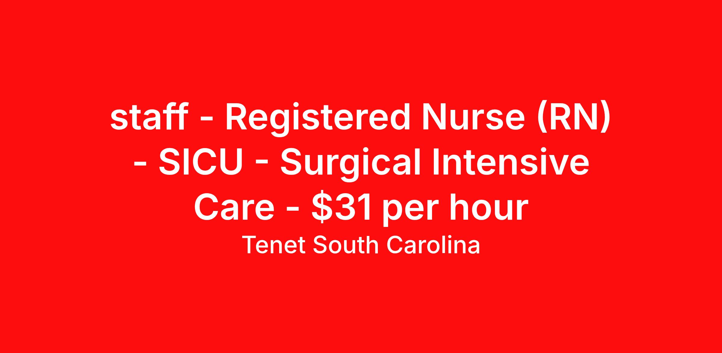 Tenet South Carolina is seeking a Registered Nurse (RN) SICU - Surgical Intensive Care for a nursing job in Rock Hill, South Carolina. Job Description & Requirements Specialty: SICU - Surgical Intensive Care Discipline: RN Duration: Ongoing 36 hours per week Shift: 12 hours Employment Type: Staff Up to $20,000 Sign-on Bonus Based on Eligibility Provide, promote and maintain quality patient care during diagnostic and therapeutic imaging procedures through education, standards of practice, professional growth, and collaboration with other multidisciplinary health care providers. Initiates and documents a written plan of care within specified timeframe Performs patient interventions completely and proficiently and demonstrates age specific competency for population of patients served. Verifies, during hospitalization, orders for accuracy (including reconciliation of medications), appropriate scheduling of tests and/or procedures, pre-op data, and consent forms. Follows medication and IV Therapy policies including patient identification, understanding about medications, administering meds and recognizing/reporting interactions 100% of the time. Appropriately monitors first dose medication(s) for adverse reactions. Interprets diagnostic data and takes appropriate action when indicated (i.e. notification of critical lab values to physician per hospital protocol). Performs related duties as required. Required: Education: Associate’s degree in Nursing required. Experience: Each candidate’s previous clinical experience is reviewed to determine acceptable experience. Certifications/Registrations/Licenses: A valid Permanent Multi-State RN License from the state in which you reside is required. Should you hold a RN license from another Compact state, you are required to apply for and obtain a Multi-State RN License from the state in which you reside within 30 days. American Heart Association BLS CPR required, must be obtained within 7 days of hire. American Heart Association ACLS and NIHSS is required within orientation period for ICU/CCU, SICU, and CVICU. Preferred: One year of telemetry experience preferred. CCRN preferred. Tenet South Carolina Job ID 2503037267. Posted job title: Registered Nurse (RN) - SICU