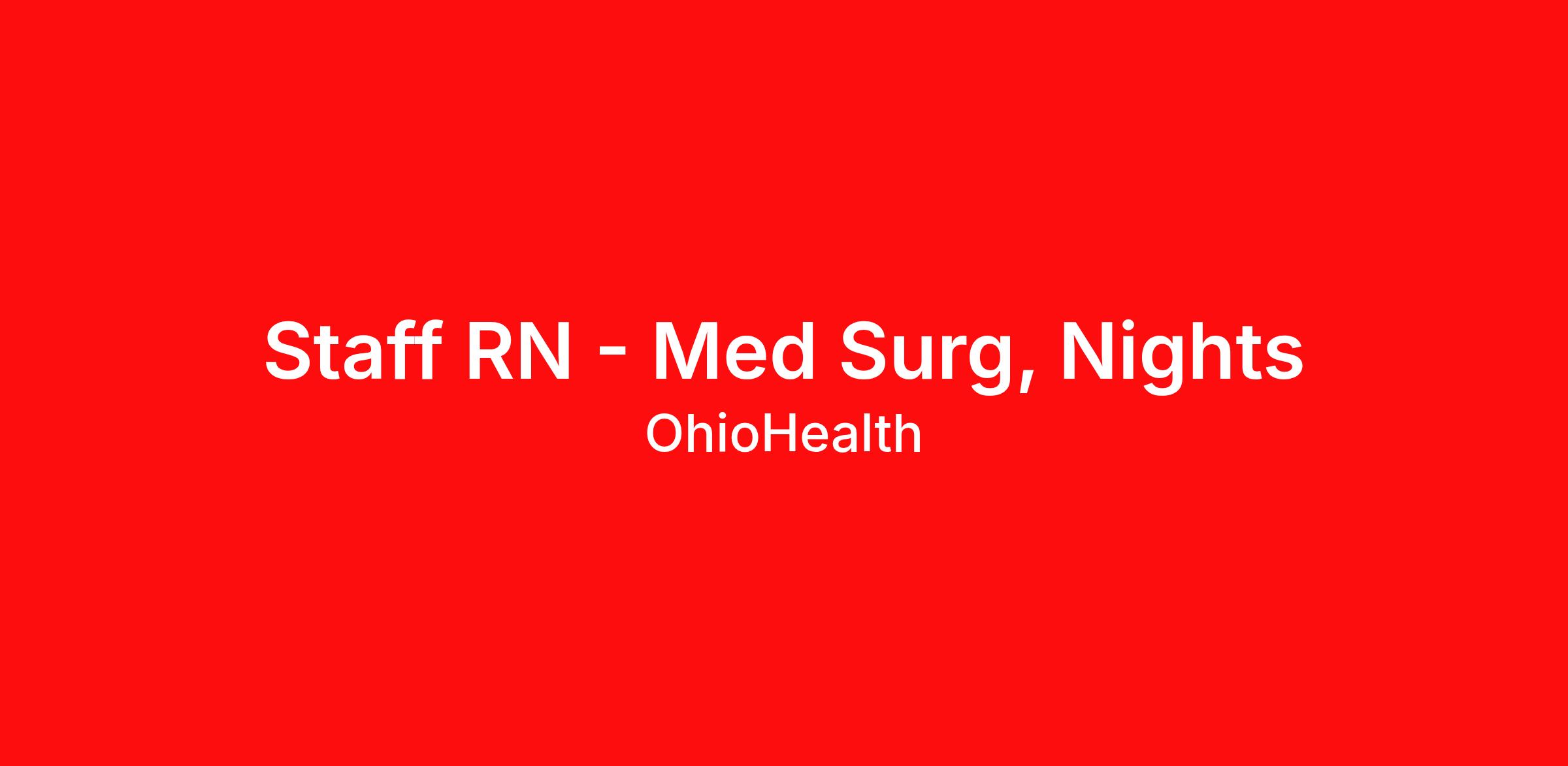 We are more than a health system. We are a belief system. We believe wellness and sickness are both part of a lifelong partnership, and that everyone could use an expert guide. We work hard, care deeply and reach further to help people uncover their own power to be healthy. We inspire hope. We learn, grow, and achieve more – in our careers and in our communities. Job Description Summary: This position provides general nursing care to patients and families along the health illness continuum in diverse health care settings while collaborating with the health care team. He/She is accountable for the practice of nursing as defined by the Ohio Board of Nursing. Responsibilities And Duties: Assessment/Diagnosis - Performs initial, ongoing, and functional health status assessment as applicable to the population and or individual (30%). Outcomes Identification/Planning - Based on nursing diagnoses and collaborative problems, documents planned nursing interventions to achieve outcomes appropriate to patient needs (30%). Implementation/Evaluation - Evaluates and documents response to nursing interventions and achievement of outcomes at appropriately determined intervals; as part of a multidisciplinary team, revises plan of care based on evaluative data (20%). Leadership - Actively participates in process improvement activities to achieve targeted measures of clinical quality, customer satisfaction, and financial performance (10%). Operations (10%). As a High Reliability Organization (HRO), responsibilities require focus on safety, quality and efficiency in performing job duties. The job profile provides an overview of responsibilities and duties and is not intended to be an exhaustive list and is subject to change at any time. As a High Reliability Organization (HRO), responsibilities require focus on safety, quality and efficiency in performing job duties. The job profile provides an overview of responsibilities and duties and is not intended to be an exhaustive list and is subject to change at any time Minimum Qualifications: Associate's Degree (Required)BLS - Basic Life Support - American Heart Association, RN - Registered Nurse - Ohio Board of Nursing Additional Job Description: RN - Registered Nurse BLS - Basic Life Support CPR - Cardiopulmonary Resuscitation Field of Study: Nursing Years of Experience 0 Work Shift: Night Scheduled Weekly Hours : 36 Department Med Surg Unit 1 Join us! if your passion is to work in a caring environment if you believe that learning is a life-long process if you strive for excellence and want to be among the best in the healthcare industry Equal Employment Opportunity OhioHealth is an equal opportunity employer and fully supports and maintains compliance with all state, federal, and local regulations. OhioHealth does not discriminate against associates or applicants because of race, color, genetic information, religion, sex, sexual orientation, gender identity or expression, age, ancestry, national origin, veteran status, military status, pregnancy, disability, marital status, familial status, or other characteristics protected by law. Equal employment is extended to all person in all aspects of the associate-employer relationship including recruitment, hiring, training, promotion, transfer, compensation, discipline, reduction in staff, termination, assignment of benefits, and any other term or condition of employment