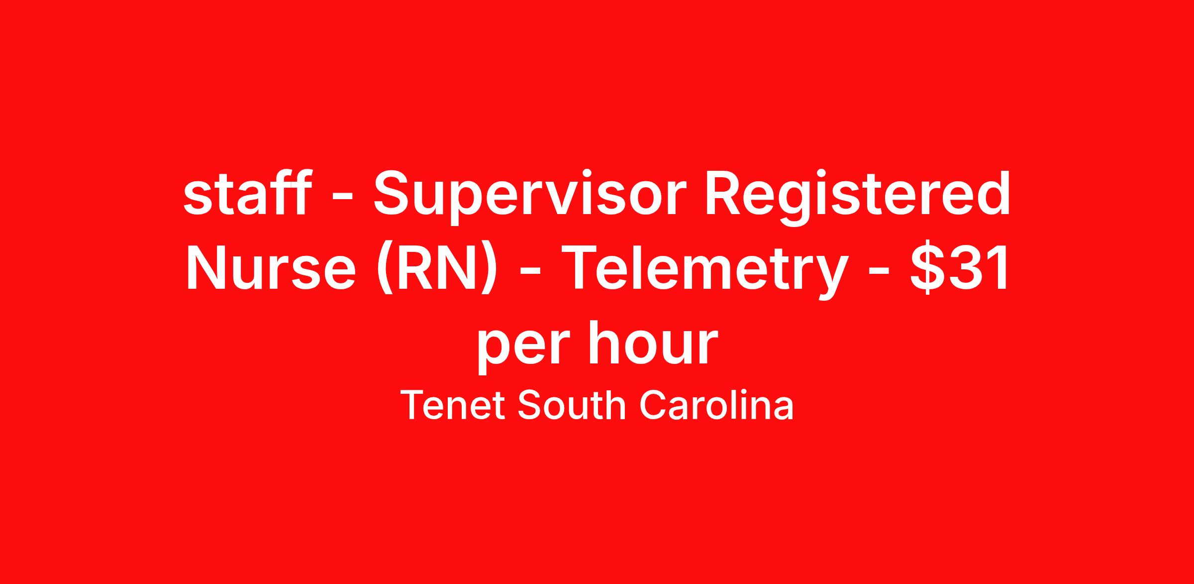 Tenet South Carolina is seeking a Registered Nurse (RN) Telemetry Supervisor for a nursing job in Rock Hill, South Carolina. Job Description & Requirements Specialty: Telemetry Discipline: RN Duration: Ongoing 36 hours per week Shift: 12 hours Employment Type: Staff RN Supervisor CV Telemetry Full Time Nights Position Summary The Clinical Supervisor in collaboration with the Director is responsible for the continuous safe operation of the assigned department including all aspects of patient care, staffing, fiscal responsibility and strategic goals of the unit. The Clinical Supervisor is a designated leader responsible for implementation, supervision, and evaluation of safe patient care while promoting a safe environment for employees, families, and visitors. The Clinical Supervisor maintains clinical and professional competency as appropriate to the ages, developmental stages, and special needs of the population. Service Excellence behavior is promoted at all times. THE RN SUPERVISORCV TELEMETRY FULL TIME NIGHTS CANDIDATE WILL POSSESS THE FOLLOWING EDUCATION, LICENSE/CERTIFICATIONS, AND EXPERIENCE. Qualifications: The requirements listed below are representative of the knowledge, skill, and/or ability required. In accordance with The Americans with Disabilities Act (ADA), it is possible that requirements may be modified to reasonably accommodate disabled individuals. However, no accommodations will be made which may pose serious health or safety risks to the employee or others or which impose undue hardships on the organization. Education/Other Qualifications: Minimum Education: Associates degree in Nursing required. Minimum Experience: 2-3 years of Acute Care or comparable experience with demonstrated leadership ability preferred. Required Certifications/Registrations/Licenses: A valid Permanent Multi-State RN License from the state in which you reside is required. Should you hold a RN license from another Compact state, you are required to apply for and obtain a Multi-State RN License from the state in which you reside within 30 days. American Heart Association BLS CPR required, must be obtained within 7 days of hire. CPI certification with orientation period. Other certifications required are determined by specific unit and is required within orientation period. Tenet South Carolina Job ID 2503018323. Posted job title: RN Supervisor CV Telemetry FT Nights