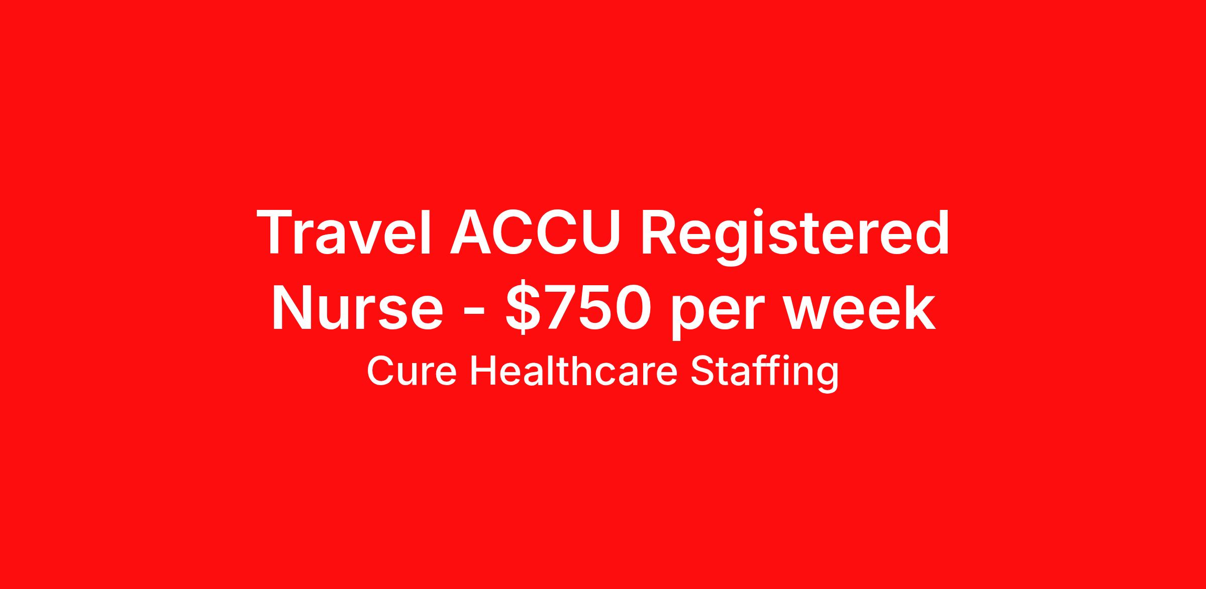 Cure Healthcare Staffing is seeking a travel nurse RN Acute Care for a travel nursing job in Moreno Valley, California. Job Description & Requirements Specialty: Acute Care Discipline: RN Start Date: 04/06/2026 Duration: 4 weeks 36 hours per week Shift: 12 hours, days Employment Type: Travel Cure Healthcare is seeking a RN - ACCU for positions in Moreno Valley, California. Current California license and AHA BLS and ACLS required and additional certifications related to this specialty. To qualify for this travel assignment, the candidate's primary residence must be located at least 50 miles from the facility address. This shift is 3x12 Days. Required: 2 years of recent experience in ACCU. Please inquire for specific job details and confirm shift required by facility. Cure Healthcare Staffing Job ID 36147305. Pay package is based on 12 hour shifts and 36.0 hours per week (subject to confirmation) with tax-free stipend amount to be determined. Posted job title: RN:ACCU,06:30:00-18:30:00 About Cure Healthcare Staffing Phone Number: Main: 512-572-6388 Website: https://curehealthcarestaffing.com/ With 20 years of healthcare staffing experience, Cure is helping nurses and allied health professionals rediscover their love of patient care while providing healthcare facilities with the flexible staffing solutions they need. We talk to nurses and techs every day who feel overwhelmed. By empowering them with flexibility and ownership of their career, we can keep more qualified healthcare professionals in direct patient care. Patient care should always come first. That’s why we went through the process to become accredited by the Joint Commission. We only accept staff that meet the Joint Commission quality criteria so we can ensure that short-term staff assignments contribute to quality care rather than detract from it.
