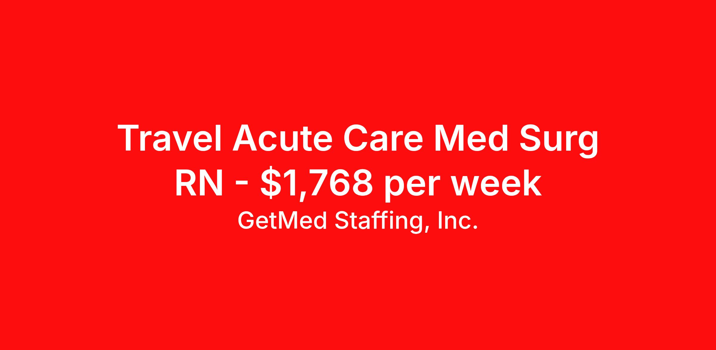 GetMed Staffing, Inc. is seeking a travel nurse RN Med Surg for a travel nursing job in Albany, Georgia. Job Description & Requirements Specialty: Med Surg Discipline: RN Start Date: 03/30/2026 Duration: 17 weeks 36 hours per week Shift: 12 hours, days Employment Type: Travel GetMed Staffing is searching for a strong MedSurg RN to assist our traveler-friendly client. A minimum of 1-2 years of experience is required. Traveling with GetMed Staffing offers the unique opportunity to gain diverse experiences, both personally and professionally. Gain experience that matters. GetMed Staffing, Inc. Job ID 35877430. Pay package is based on 12 hour shifts and 36.0 hours per week (subject to confirmation) with tax-free stipend amount to be determined. Posted job title: RN:MedSurg,07:00:00-19:00:00 About GetMed Staffing, Inc. We are a diversity owned company, specializing in healthcare recruiting services. We truly understand how important a healthcare travelers' relationship is with their recruiter, as well as our relationship is with our healthcare facilities. We recognize that the needs of our healthcare travelers can vary, and therefore we provide the personalized touch necessary to ensure a successful travel assignment each and every time. Our healthcare facilities and clients benefit from us putting our healthcare travelers first. GetMed Staffing is excited to be a leader within the industry by focusing on providing healthcare travelers with more choices and possibilities as they plan for their next healthcare travel assignment. Benefits Life insurance Medical benefits Dental benefits Vision benefits 401k retirement plan