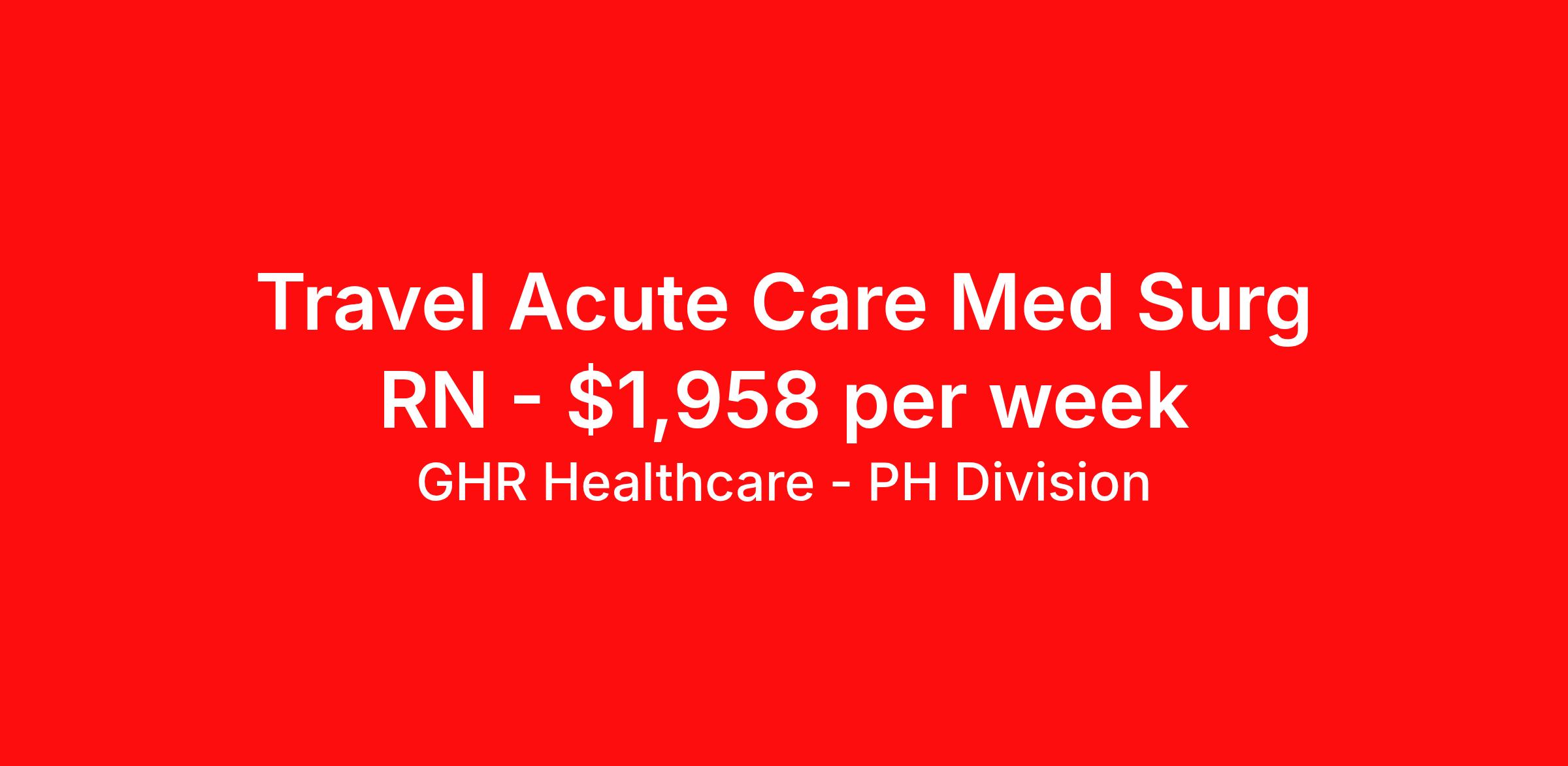 GHR Healthcare - PH Division is seeking a travel nurse RN Med Surg for a travel nursing job in Albany, Georgia. Job Description & Requirements Specialty: Med Surg Discipline: RN Start Date: 03/30/2026 Duration: 17 weeks 36 hours per week Shift: 12 hours Employment Type: Travel Planet Healthcare Job ID 75814395. Pay package is based on 12 hour shifts and 36 hours per week (subject to confirmation) with tax-free stipend amount to be determined. About GHR Healthcare - PH Division For over 30 years, GHR Healthcare has been the bridge between healthcare professionals and the facilities that need them nationwide. We're committed to uncovering your ideal fit, supported by GHR's dedication to competitive compensation, transparent communication, and a devoted team that genuinely cares about your career journey. You can trust us to stand by your side as your advocate, confidante, and partner in advancing your career. At GHR, care and consideration are at the heart of everything we do. Visit ghrhealthcare.com to learn more.