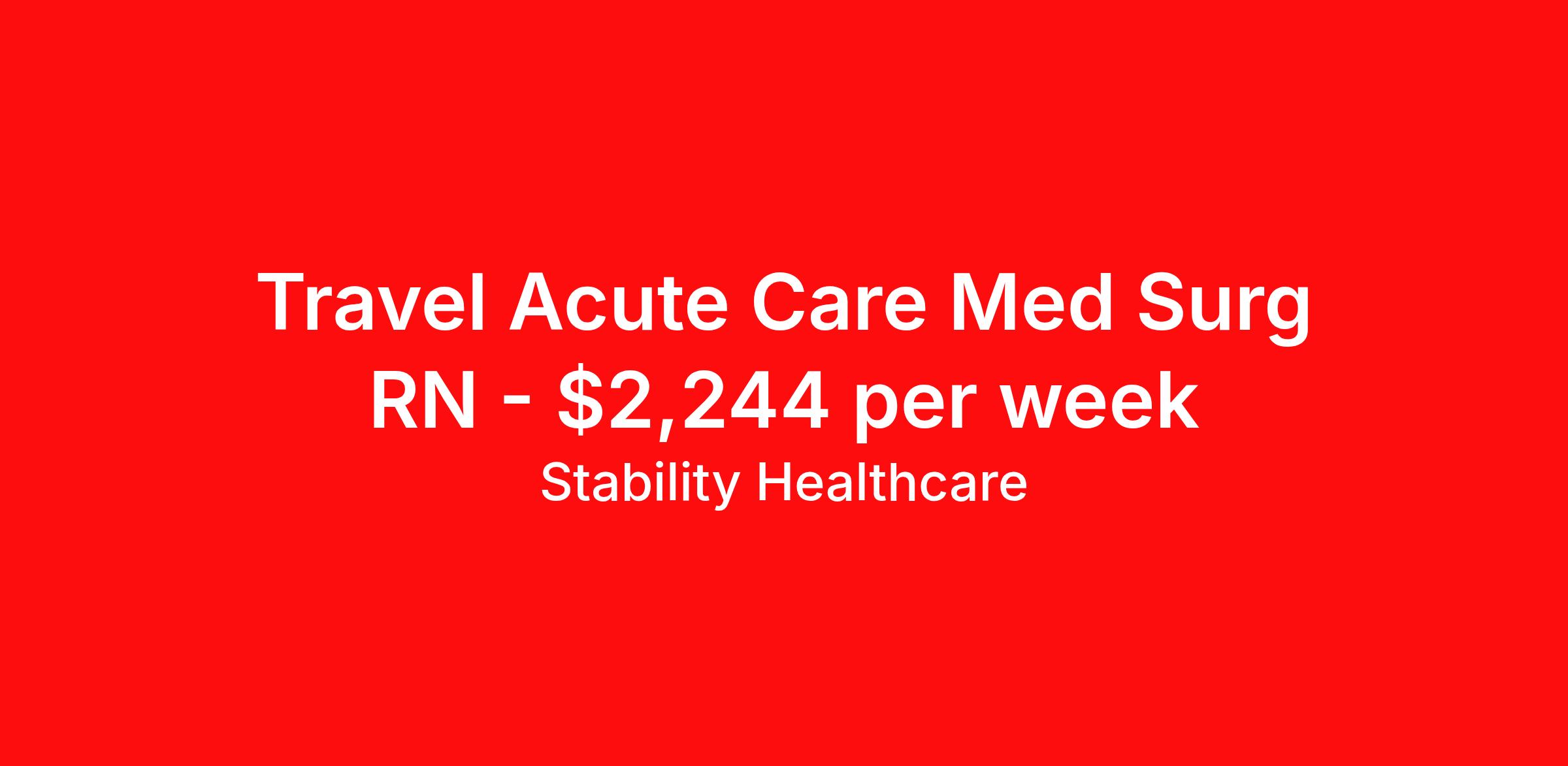 Stability Healthcare is seeking a travel nurse RN Med Surg for a travel nursing job in Peoria, Illinois. Job Description & Requirements Specialty: Med Surg Discipline: RN Duration: 13 weeks 36 hours per week Shift: 12 hours, nights Employment Type: Travel Stability Healthcare is looking for a Med-Surg RN contract position in Peoria, IL. The majority of hospitalized patients are admitted to M/S either directly or after surgery. M/S is also where patients who have been in critical care (ICU) are transferred when they no longer need critical care but still require nursing care. *$600 travel bonus *Day 1 health insurance with United Healthcare *PTO plan start accruing on day 1, use during contract or cash out at the end! *Guaranteed stipend if facility calls you off *Extra hour bonus earn an additional hourly bonus for working over your weekly contracted hours Stability Job ID 827465. Pay package is based on 12 hour shifts and 36 hours per week (subject to confirmation) with tax-free stipend amount to be determined. Posted job title: Med-Surg About Stability Healthcare Stability Healthcare was founded in 2009, with the mission of becoming the best Travel Nursing Agency in California. We have been rated one of the top travel nursing agencies and offer our nurses the highest paying travel nursing jobs available. We have access to the best travel assignments from 1000’s of facilities. You can start the year off in sunny California, spend the Spring in the Colorado Rockies, enjoy the Summer in the Mid-West, experience the change of seasons in Boston and New York, and hit the beaches of Florida in the winter. Our Nurses work in the best hospitals and health systems in the country. Benefits Guaranteed Hours Benefits start day 1