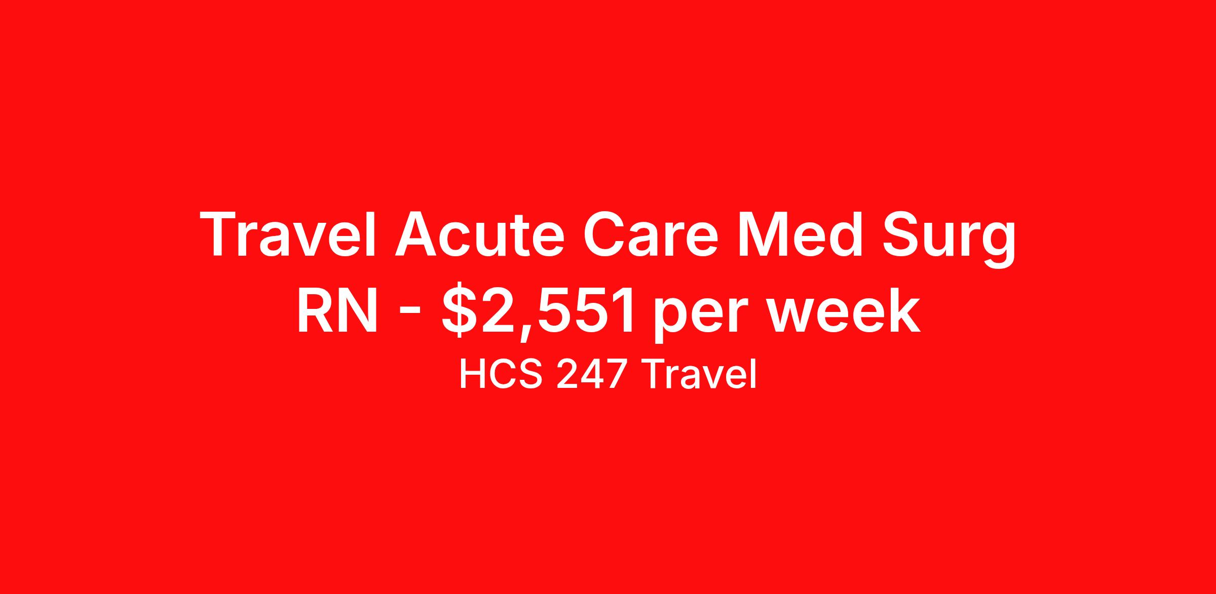 HCS 247 Travel is seeking a travel nurse RN Med Surg / Telemetry for a travel nursing job in Peoria, Illinois. Job Description & Requirements Specialty: Med Surg / Telemetry Discipline: RN Start Date: 04/13/2026 Duration: 13 weeks 36 hours per week Shift: 12 hours, nights Employment Type: Travel HCS 247 Travel Job ID 62511157. Pay package is based on 12 hour shifts and 36 hours per week (subject to confirmation) with tax-free stipend amount to be determined. About HCS 247 Travel HCS 24/7 is a national healthcare staffing organization specializing in the placement of Registered Nurses and Allied health professionals across acute care and other clinical settings. We support travel assignments, local short- and long-term contracts, per diem, temp-to-perm, and direct hire opportunities nationwide. Our clinical coverage includes Registered Nurse specialties such as ER, ICU, Med-Surg, Telemetry, Step-Down, OR, PACU, L&D, Mother/Baby, NICU, Cath Lab, Endoscopy, and more along with a full range of allied and imaging professionals, including Respiratory Therapists, Surgical Technicians, X-Ray Techs, CT Techs, MRI Techs, Interventional Radiology (IR) Techs, Cath Lab Techs, Ultrasound/Sonographers, Mammography Techs, and Nuclear Medicine Techs. With competitive compensation and benefits, consistent opportunities, and a clinician-first approach backed by top-rated customer service, HCS 24/7 delivers a seamless experience from initial application through assignment completion. Benefits Holiday Pay Guaranteed Hours Continuing Education Mileage reimbursement Referral bonus Medical benefits Dental benefits Vision benefits License and certification reimbursement Life insurance Benefits start day 1 Weekly pay