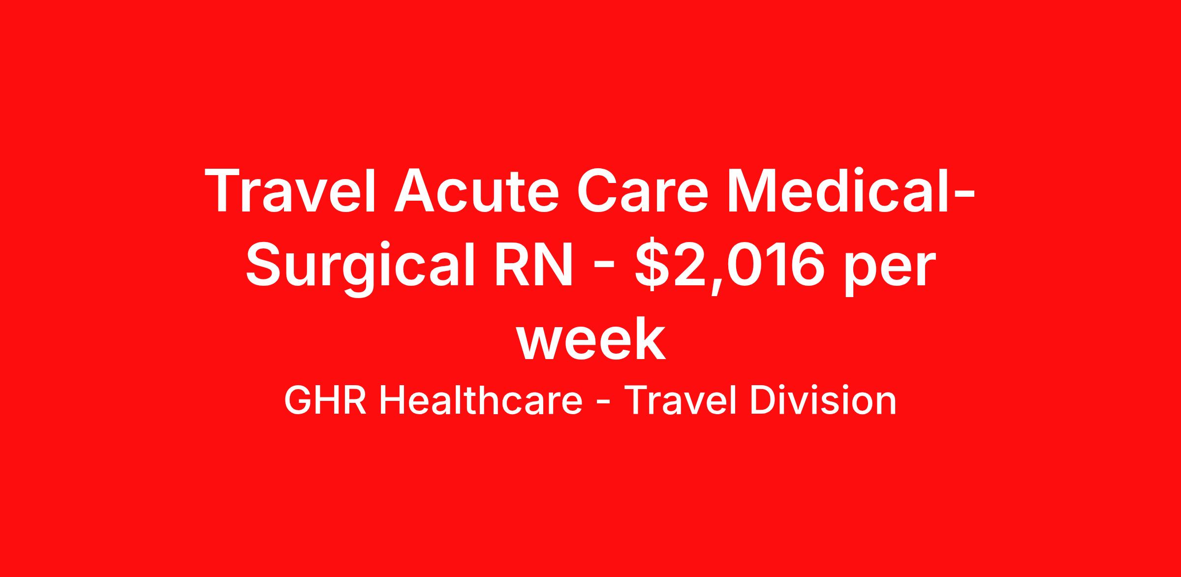 GHR Healthcare - Travel Division is seeking a travel nurse RN Med Surg for a travel nursing job in Albany, Georgia. Job Description & Requirements Specialty: Med Surg Discipline: RN Start Date: 03/30/2026 Duration: 17 weeks 36 hours per week Shift: 12 hours Employment Type: Travel GHR Healthcare - Travel Division Job ID 76233658. Pay package is based on 12 hour shifts and 36 hours per week (subject to confirmation) with tax-free stipend amount to be determined. About GHR Healthcare - Travel Division For over 30 years, GHR Healthcare has been the bridge between healthcare professionals and the facilities that need them nationwide. We're committed to uncovering your ideal fit, supported by GHR's dedication to competitive compensation, transparent communication, and a devoted team that genuinely cares about your career journey. You can trust us to stand by your side as your advocate, confidante, and partner in advancing your career. At GHR, care and consideration are at the heart of everything we do. Visit ghrhealthcare.com to learn more.