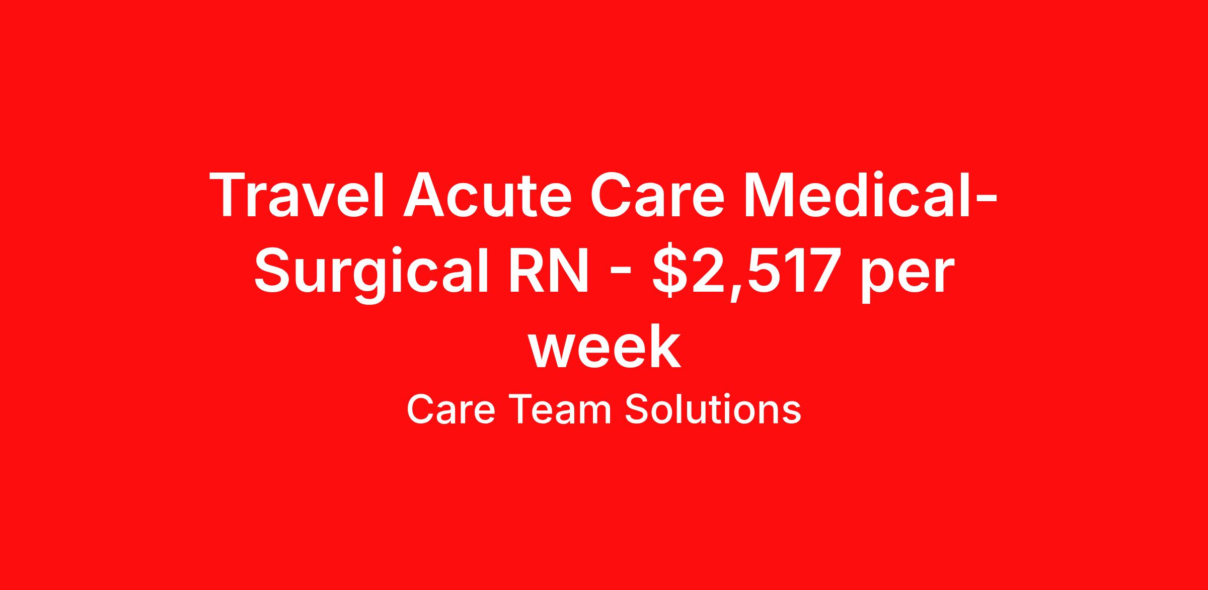 Care Team Solutions is seeking a travel nurse RN Med Surg for a travel nursing job in Albany, Georgia. Job Description & Requirements Specialty: Med Surg Discipline: RN Start Date: 03/30/2026 Duration: 13 weeks 48 hours per week Shift: 12 hours Employment Type: Travel Registered Nurse must have 2 years of recent experience in particular specialty Details: Must Have 2 Years of recent Medical-Surgical experience. Specialty: Medical-Surgical Discipline: Registered Nurse Start Date: 2026-03-30 Duration: 17 Weeks Shift: 12 Hours Day shift Hours Per Week: 48 Hours Employment Type: Contract Gross Weekly Pay: $2517.12 Six things that won’t happen if you apply to this job: You won’t have to guess what the downsides are. We’ll tell you up front. You won’t show up on day 1 and find out this is not what you signed up for. We won't leave your phone call ringing when it's inconvenient. Business hours for you are business hours for us. You won’t get shuffled to some customer service rep when a problem pops up. If we screw up something in securing your placement, we'll own it. That means it's on us to make it right. You won’t figure out your credentials alone. Our credentialing experts will walk you through it step by step. We've talked to thousands of travel nurses like you. We know you want good pay. You want to choose when you work. But the one thing nurse after nurse has said they want and don't have is someone in their corner. There's a lot in this business that’s messed up. We’re trying to be the people that fix it. You and every nurse with the guts to travel deserve it. We've worked hard for you to enjoy some one-of-a-kind benefits you'll not likely find anywhere else, because they benefit you more than they benefit us: Our early pay program Student loan reimbursement Free well-being tele-visits with a psychologist Care Team Solutions Job ID 586038. Pay package is based on 12 hour shifts and 48 hours per week (subject to confirmation) with tax-free stipend amount to be determined. Posted job title: Registered Nurse-Medical-Surgical About Care Team Solutions Two brothers who give an enormous damn. We're Justin and Kyle. Neither of us are nurses. It doesn’t take a nurse to see that the way travel nurses are treated sucks. Nursing is already hard enough. Travel nursing takes serious guts. You get the toughest assignments in places you’ve never been. Which can be fun, but it’s also stressful. You’re in your element but outside of your hometown. You can be a stranger on the team. If anyone deserves someone in their corner, it’s you. But that’s not how most agencies operate. Which is why travel nurses hate working with them. We got into this business because we saw bucket-loads of nurses moving through the "churn and burn" travel machinery. We absolutely hate that. You'll do your best work when you have the placements you want and feel fully supported in your work. We pay our people well because we want them to treat you well. Our recruiters are amazing (we picked each of them ourselves), but if you've got a problem too big for them, they can come straight to us. We work like ten feet away. The "Churners and Burners" promise you the same benefits. They might as well copy/paste them from each other. We have them too: 401k, holiday pay, healthcare, dental, travel reimbursement, etc But we've worked hard for you to enjoy some one-of-a-kind benefits you'll not likely find anywhere else, because they benefit you more than they benefit us: Our early pay program Student loan reimbursement Free well-being tele-visits with a psychologist Benefits Weekly pay Holiday Pay Guaranteed Hours 401k retirement plan Wellness and fitness programs Referral bonus Medical benefits Dental benefits Vision benefits School loan reimbursement