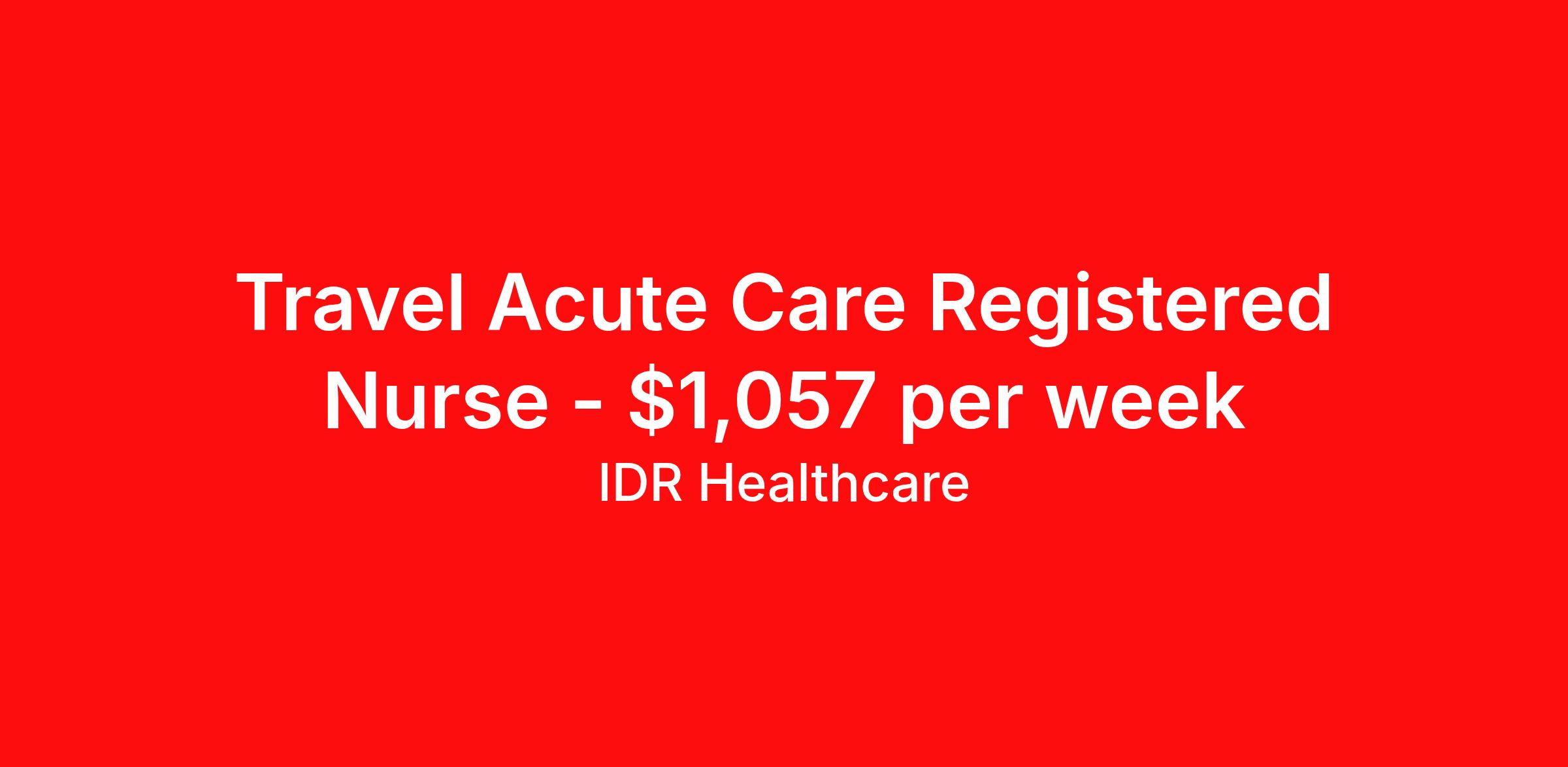 IDR Healthcare is seeking a travel nurse RN Acute Care for a travel nursing job in Snoqualmie, Washington. Job Description & Requirements Specialty: Acute Care Discipline: RN Start Date: 03/30/2026 Duration: 13 weeks 36 hours per week Shift: 12 hours, days Employment Type: Travel IDR Healthcare is an awarding winning staffing firm that believes it is a privilege and awesome responsibility to serve those who selflessly care for others. Our mission is to empower healthcare professionals to achieve their fullest potential both personally and professionally while they create positive change within the healthcare community. We exercise true grit, tenacity, and authenticity while embracing and ownership mindset to go above and beyond providing healthcare professionals a world class experience. We are employee owned and our travelers and clinicians earn shares/equity by just completing multiple assignments! We have been named SIA’s Fastest Growing Staffing Firms and have won ClearlyRated® Best of Staffing for 11 consecutive years! This cements our commitment to clinician satisfaction earning top net promoter scores putting us in the top 2% of agencies in North America! TravelFarWithIDR and see what an extraordinary experience is all about! Benefits 2024 World Staffing Best Staffing Firms to Work For! ESOP (Equity) Healthcare Benefits for up to 30 days Between Assignments Comprehensive Health Insurance Dental and Vision Insurance Sign-On, Completion, & Referral Bonus Programs License and Certification Reimbursement Weekly Pay and Competitive Compensation Large Network of Clients and Job Opportunities 401k retirement plan Exclusive Assignments IDR Job ID 497708. Pay package is based on 12 hour shifts and 36 hours per week (subject to confirmation) with tax-free stipend amount to be determined. About IDR Healthcare IDR Healthcare is an awarding winning staffing firm that believes it is a privilege and awesome responsibility to serve those who selflessly care for others. Our mission is to empower healthcare professionals to achieve their fullest potential both personally and professionally while they create positive change within the healthcare community. We exercise true grit, tenacity, and authenticity while embracing and ownership mindset to go above and beyond providing healthcare professionals a world class experience. We are employee owned and our travelers and clinicians earn shares/equity by just completing multiple assignments! We have been named SIA’s Fastest Growing Staffing Firms and have won ClearlyRated® Best of Staffing for 11 consecutive years! This cements our commitment to clinician satisfaction earning top net promoter scores putting us in the top 2% of agencies in North America! Help us give back! For every booked assignment, proceeds are donated to St. Jude and Feeding America! Last year we raised over $18,000 for St. Jude and provided over 49,000 meals for children in need. TravelFarWithIDR and see what it is all about! Benefits Weekly pay 401k retirement plan Referral bonus Medical benefits Dental benefits License and certification reimbursement Vision benefits