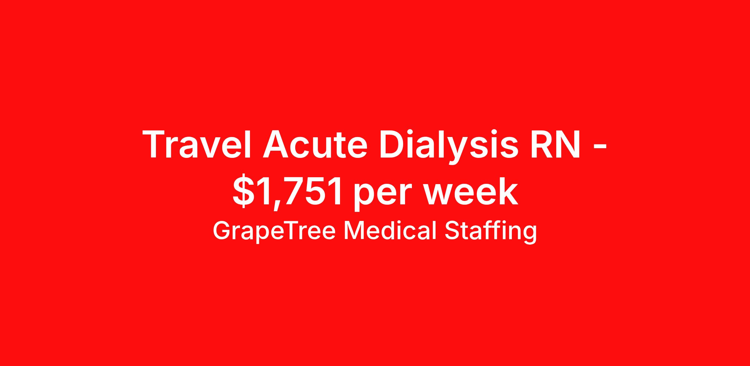 GrapeTree Medical Staffing is seeking a travel nurse RN Dialysis for a travel nursing job in Saint Louis, Missouri. Job Description & Requirements Specialty: Dialysis Discipline: RN Start Date: ASAP Duration: 13 weeks 36 hours per week Shift: 12 hours, days Employment Type: Travel Grape Tree LTC Job ID 90846. Pay package is based on 12 hour shifts and 36 hours per week (subject to confirmation) with tax-free stipend amount to be determined. Posted job title: RN - Dialysis About GrapeTree Medical Staffing GrapeTree Medical Staffing has over 20 years of experience offering 24/7 staffing solutions to healthcare communities. GrapeTree takes pride in staffing high-quality, experienced CNAs, STNAs, LPNs, and RNs in 8-13 week travel contracts in nursing homes, assisted living, skilled nursing and memory care facilities across the midwestern US. Benefits Referral bonus Employee assistance programs License and certification reimbursement Weekly pay Holiday Pay Guaranteed Hours Mileage reimbursement