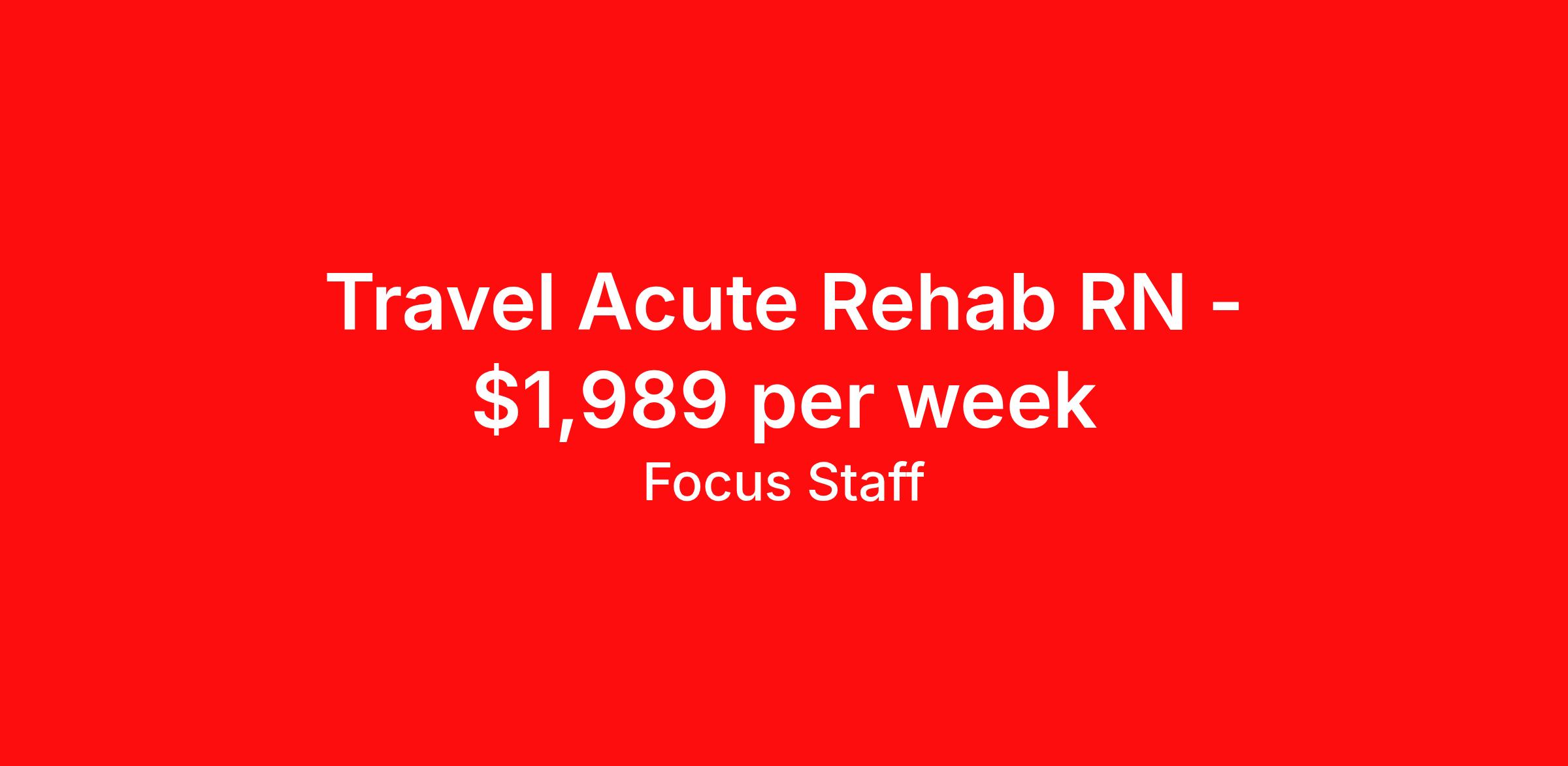 Focus Staff is seeking a travel nurse RN Rehabilitation for a travel nursing job in Evansville, Indiana. Job Description & Requirements Specialty: Rehabilitation Discipline: RN Start Date: 04/13/2026 Duration: 13 weeks 36 hours per week Shift: 12 hours, days Employment Type: Travel Focus Staff is seeking a Rehab Registered Nurse for a travel contract in Evansville, IN. The ideal candidate will have at least 1 year of experience in a Rehab setting. Contract Length: 90 Start Date: 04/13/2026 Shift: 3x12 Days Benefits for Rehab RNs: Health insurance Vision insurance Dental Insurance Life insurance Licensure reimbursement Travel reimbursement Relocation assistance 401(k) 401(k) matching Competitive Pay Referral Bonus Requirements: 1 Year of Experience, 2 Preferred Valid IN RN License BLS (Basic Life Support) ACLS (Advanced Cardiovascular Life Support) Eligible to work in the United States About Focus Staff: Focus Staff is a traveler-first nurse and healthcare staffing agency! We prioritize the needs of our travelers, giving you complete control over your journey. Our mission is to help you create the life you love, explore the country and do what you do best, help others. Interested in becoming a traveler with Focus Staff? Discover why travelers choose us, apply today! All-Star Status: Dallas 100 (Multiple Years in a Row) Inc. 5000 Certified by The Joint Commission Best of Staffing Talent Satisfaction 2022 Best of Staffing Client Satisfaction 2022 Fastest-Growing US Staffing Firms 2017 If you’re seeking a Rehab Registered Nurse position in Evansville, IN and are looking to work with an agency that will listen to your needs and career goals, then Focus Staff is the right place to be. We are proud of our ability to build relationships with all our healthcare professionals, whether you’re seeking travel assignments, PR or permeant positions. We Offer: Immediate Openings Weekly Pay through Direct Deposits Flexible Schedules Day and Night Shifts Available Competitive Compensation Guaranteed Hours (based on employer) Travel Assistance Dedicated/Responsive Recruiters Day One Medical, Dental, Vision and Life Insurance Generous Housing Stipend 24/7 Support Company Provided Housing Options Referral Bonus ($600) Loyalty Bonus ($1,200) Discounts/Coupons to Hotels Access to Jobs in all 50 States Painless Credentialing Process U.S.A.-based Company Equal Opportunity Employer Joint Commission Certified Licensure Reimbursement Pet-Friendly Access to Discounts, Rewards, and more Other Information: Job City: Evansville Shift: 3x12 Days Focus Staff is an EEO/AA (Equal Employment Opportunity and Affirmative Action) Employer. Estimated pay package based on bill rate at time job was posted. Bill rates can change frequently and without notice. Exact pay package may vary based on several factors, including, but not limited to, guaranteed hours, travel distance, demand, experience, etc. RN, Registered Nurse, Travel Nurse, Nurse, Travel RN, Nurse RN, Travel Rehab RN, RN – Rehab, Temporary, Travel, 13 Weeks, Temp, Full-tile, Contract, Assignment, Nursing, Temporary RN, Contract RN, Rehabilitation RN Focus Staff Job ID a0xVt00000Jq7lmIAB. Pay package is based on 12 hour shifts and 36 hours per week (subject to confirmation) with tax-free stipend amount to be determined. Posted job title: Travel REHAB RN - Rehabilitation Registered Nurse About Focus Staff Your Journey, Our Focus. Travel Confidently, Care Boldly with Focus Staff. At Focus Staff, we’re here to make your travel healthcare career rewarding, seamless, and stress-free. Whether you’re a travel nurse, therapist, or allied health professional, we take care of the details so you can focus on what you do best — caring for others. Our mission is simple: to help healthcare heroes like you thrive, no matter where your journey takes you. With thousands of job opportunities across all 50 states, our dedicated recruiters work closely with you to match you to the right assignment, based on what matters most to you — pay, location, benefits, or career growth. From day one, you’ll enjoy premium benefits like medical coverage that bridges between assignments, 401K matching, travel and licensing reimbursements, and personalized housing support. Plus, our team is here for you 24/7, with clinical support available whenever you need guidance or backup. At Focus Staff, we believe in making every assignment a smooth, comfortable, and empowering experience. Let’s make your next adventure your best one yet.