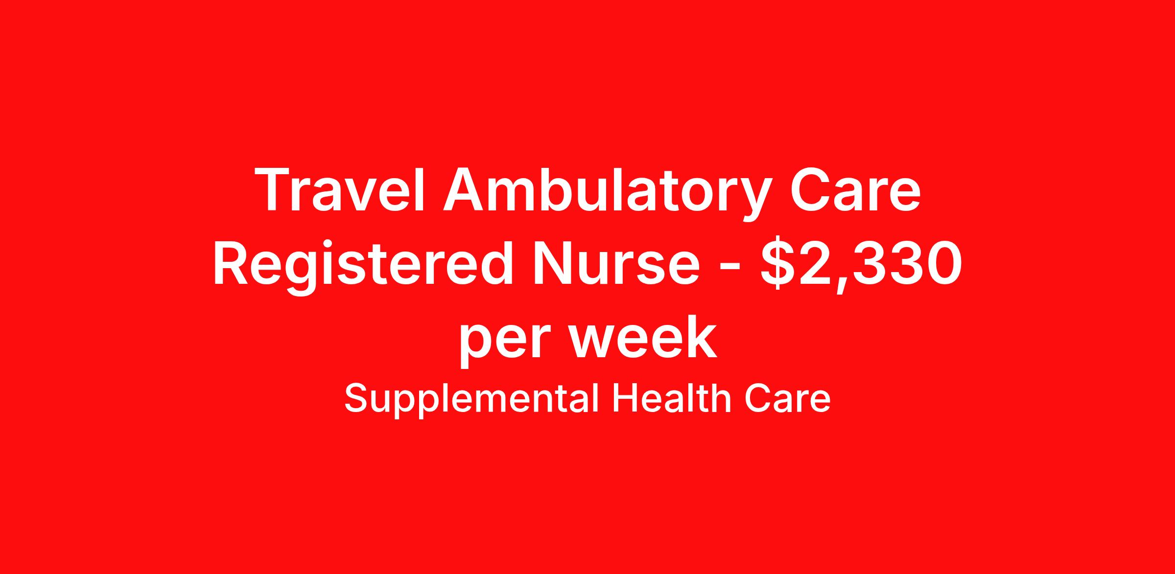 Supplemental Health Care is seeking a travel nurse RN Ambulatory Care for a travel nursing job in Bethel, Alaska. Job Description & Requirements Specialty: Ambulatory Care Discipline: RN Start Date: ASAP Duration: 13 weeks 40 hours per week Shift: 8 hours, days Employment Type: Travel Job Description: Supplemental Health Care is connecting Ambulatory Care Registered Nurses with top-tier hospital contracts in Bethel, Alaska. Travel or stay local, either way, we’ll guide you to an opportunity that matches your goals, offering excellent pay, benefits, and support. Qualifications: Current Alaska Registered Nurse License / Certification American Heart Association BLS 1 to 2 years of recent Ambulatory Care experience Ambulatory Care Registered Nurse Contract Details: $2,280 - $2,330 per week* Weekly pay 13-week contract with possibility to extend AM shifts available *Estimated weekly payment may include both taxable wages and tax-free reimbursements for meals, housing, and incidentals. Please speak with a recruiter for details. What We Offer: Full medical, dental, vision, life, and even pet insurance! Round the clock support. No matter where you are or what time it is, Supplemental Health Care is standing by. SHC's Share the Care referral program is the most dynamic, profitable referral program in the industry. 401(k) Retirement Savings Program with a wide range of investment options. Discounted and free online access to CEU courses through Supplemental University. Apply now to launch your next Ambulatory Care Registered Nurse assignment, or ask our team about other exciting Registered Nurse opportunities. Supplemental Health Care is an Equal Opportunity Employer. All candidates, including veterans and those with disabilities, are encouraged to apply. SHC will consider for employment qualified applicants with criminal histories in a manner consistent with the requirements of applicable local, state, or federal law. To learn more, visit www.shccares.com/eeo Supplemental Health Care Job ID 1465006. Pay package is based on 8 hour shifts and 40 hours per week (subject to confirmation) with tax-free stipend amount to be determined. Posted job title: Ambulatory Care Registered Nurse About Supplemental Health Care At Supplemental Health Care, a simple belief in the power of caring guides a unique commitment to world-class service in healthcare staffing. For 40 years, we’ve supported talented professionals pursuing their life calling in hospitals, schools, home health, corrections, behavioral health, and other settings. At SHC, we inspire vital connections and enrich lives and inspire better outcomes. As recipients of the Best in Staffing Awards for both Client and Talent, Supplemental Health Care is proud to be among only 2% of staffing companies singled out for the distinction based on the real feedback of our employees and the clients we serve. SHC has also earned The Joint Commission’s Gold Seal of Approval and is named among the Largest Health Care Staffing companies in the United States by Staffing Industry Analysts. We are also thrilled to recognize our very own SLP, Dr. Kelly Byrd as the American Staffing Association 2024 National Staffing Employee of the Year and Health Care Sector All-Star. We’re honored to connect Dr. Byrd to employment, share her incredible story, and support her family literacy nonprofit. For everyone that we serve, SHC is the place where caring hearts thrive. Benefits Referral bonus Benefits start day 1 401k retirement plan Continuing Education Discount program Health savings account