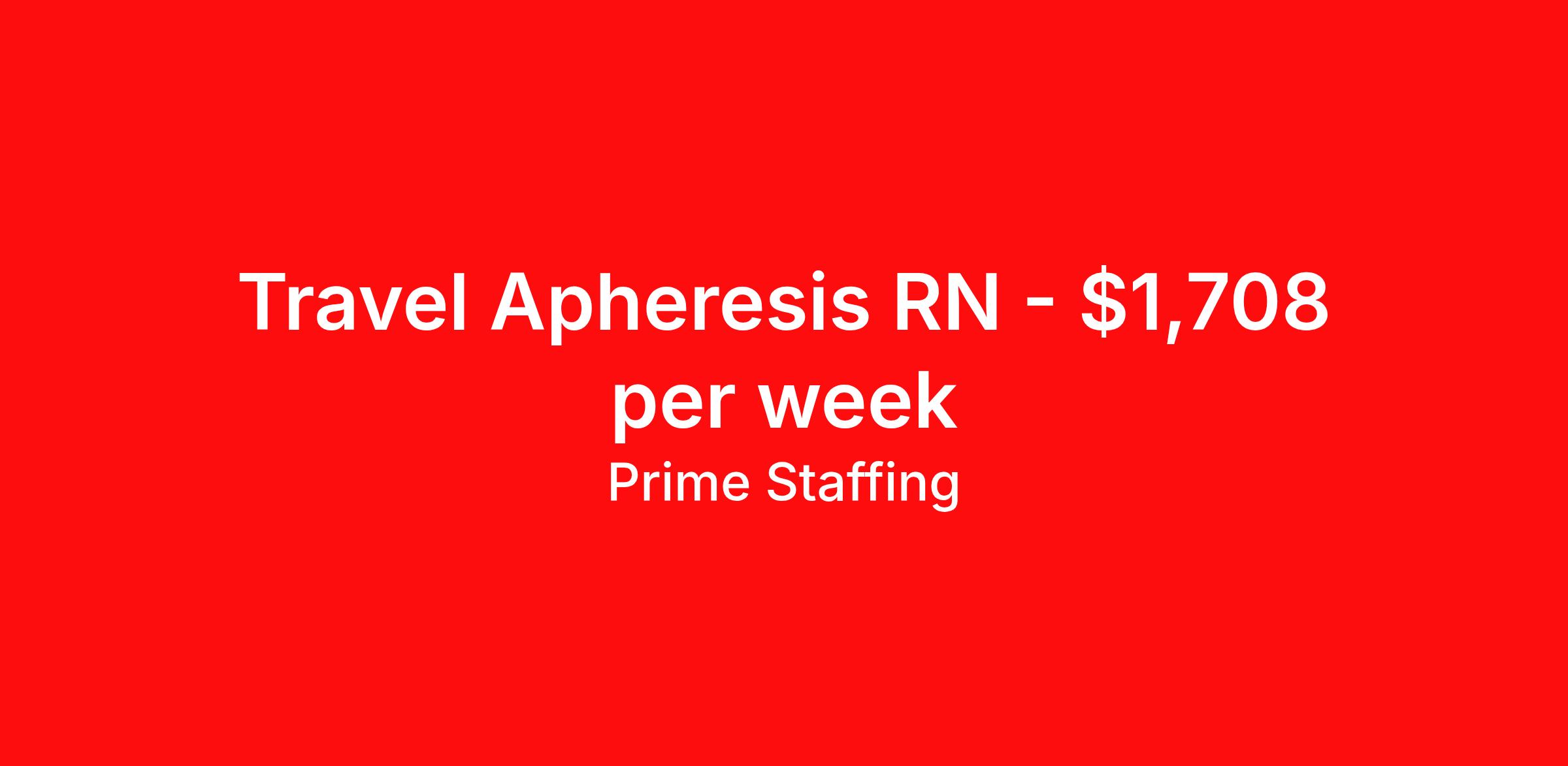 Prime Staffing is seeking a travel nurse RN Apheresis for a travel nursing job in Indianapolis, Indiana. Job Description & Requirements Specialty: Apheresis Discipline: RN Start Date: 05/18/2026 Duration: 13 weeks 40 hours per week Shift: 8 hours Employment Type: Travel ID: 62711892 Shift: Day 4x10-Hour (07:00 - 17:30) Description: *Pre-Screening Question: Does this applicant have Plasma Exchange and Red Blood Cell Exchange experience?IU Health is now offering charge pay, which is a $3.00 bill rate bump per hourIN LICENSE AND CERTS MUST BE IN HAND TO SUBMITShift Requirements: 4x10sRotating Call Certification Requirements: BCLSSkillset Requirements: Minimum 3 Year Experience; Apheresis Equipment or Dialysis and Central lines and ports Staffing Ratios: 1:1Unit Information: GVHD, BO, CTCL, Photopheresis Special Equipment: CellEx Modified Time:5/18/2026 12:00:00 AM Account Manager: Bryan Howlett Account Manager Email: COVID-19 Vaccine: Not Required Flu Vaccine: Unknown Submittals:Low Job Requirements & Qualifications Previous Charge Experience : Preferred Years of Experience : 3 Patient Ratio Experience : 1 Charting System Experience : Required Charting System Name : Cerner Community Hospital Experience : - LTAC Experience : - Trauma Level I Experience : - Trauma Level II Experience : - Travel Experience Required : Yes Certifications : BLSSkills : Ability to cannulate AV fistula, Ability to cannulate AV graft, Acute Care Inpatient Dialysis*, Apheresis treatment, Blood prime, Blood return, Chronic Outpatient Dialysis*, Infection control, Interpretation/Management of Dysrhythmias, Post Apheresis treatment, Red blood cell exchange, Therapeutic Plasma Exchange/Plasmapheresis, Tunneled/ Non Tunneled Catheter, Apheresis Equipment or Dialysis* Unit Details Staffing & Scheduling Scheduling Type : block Patient Ratios Days : 1 Patient Ratios Nights : - Patient Ratios Weekends : - Float Required : - Call Required : - Weekend Coverage : - Number of Weekend Shifts Per Contract : - Pre-Approved Time Off : one Orientation Hours : - Facility & Patient Care Details Patient Age Groups : Adolescents, Adults Daily Census : N/A Number of Visits Per Day : - Number of Rooms : 8 Number of Beds : 8 Additional Unit Information Interdisciplinary Support : IV Teams, Interpretation Services, Social Services, Rapid Response Teams, Pharmacy, Unit Secretary Patient Diagnoses : GVHD, BO, CTCL Special Procedures/Unit Details : Photopheresis Special Equipment : CellEx Tier2 Travel Compliance Travelers University must be accredited by the ACEN or CCNE at the time of graduation. SSN required at time of submittal DOB required at time of submittal RTO we can auto-approve 5 days of non holiday RTO or less. Anything more requires facility approval. Candidate MUST WORK 2 out of 3 major holidays. If 1 position is available, we can allow 3 submissions at one time. 18 months exp. required, however please refer to job description for any exceptions made depending on the unit License: Must be in hand prior to start date. Temporary licenses may be obtainable once perm license applications have been submitted. 2 supervisor references required Local Radius: IN residents are considered local Local Rules: Accepted: Surgical Services positions, Allied positions, and IU Clinics will accept local travelers Eligible local travelers will be offered the in-state rate at lower BR Not accepted: For MS, MS Tele, PCU, ICU, and ER positions, locals are not accepted Floating is 100% required of ALL TRAVELERS - Candidates will float within hospital or to an affiliate hospital/s near by Certs required please see job description/unit description to find list of required certs depending on unit No specific charting required for any IU health positions Bill rate please see job for posted bill rate Background Policy to be noted prior to submission so we can seek approval prior to offer Any PERM or PRN employee of IU must be away for 12 months before applying as a traveler Consecutive Contract Policy: Current or past IU travelers who have accrued 12 months of travel employment anywhere within IU Health are required to take a designated break to reset travel eligibility effective 2/24/26. This break must be taken in one consecutive period and cannot be split up under any circumstances. Please see AM for additional clarification if needed. Out-of-state residents: require a 3 month/90 day break to reset eligibility prior to the traveler s year mark In-state residents require a 6 month/180 day break to reset eligibility prior to the traveler s year mark Submittal Details: Tier2 Travel ComplianceTravelers University must be accredited by the ACEN or CCNE at the time of graduation.SSN required at time of submittalDOB required at time of submittalRTO we can auto-approve 5 days of non holiday RTO or less. Anything more requires facility approval. Candidate MUST WORK 2 out of 3 major holidays.If 1 position is available, we can allow 3 submissions at one time.18 months exp. required, however please refer to job description for any exceptions made depending on the unitLicense: Must be in hand prior to start date. Temporary licenses may be obtainable once perm license applications have been submitted. 2 supervisor references requiredLocal Radius: IN residents are considered localLocal Rules:Accepted: Surgical Services positions, Allied positions, and IU Clinics will accept local travelersEligible local travelers will be offered the in-state rate at lower BRNot accepted: For MS, MS Tele, PCU, ICU, and ER positions, locals are not acceptedFloating is 100% required of ALL TRAVELERS - Candidates will float within hospital or to an affiliate hospital/s near by Certs required please see job description/unit description to find list of required certs depending on unitNo specific charting required for any IU health positionsBill rate please see job for posted bill rateBackground Policy to be noted prior to submission so we can seek approval prior to offerAny PERM or PRN employee 