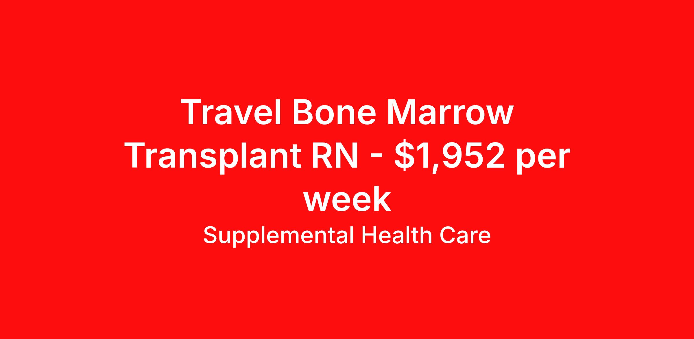 Supplemental Health Care is seeking a travel nurse RN Bone Marrow Transplant for a travel nursing job in Indianapolis, Indiana. Job Description & Requirements Specialty: Bone Marrow Transplant Discipline: RN Start Date: ASAP Duration: 13 weeks 36 hours per week Shift: 12 hours, days Employment Type: Travel Job Description: Supplemental Health Care is connecting Bone Marrow Transplant Registered Nurses with top-tier hospital contracts in Indianapolis, Indiana. Travel or stay local, either way, we’ll guide you to an opportunity that matches your goals, offering excellent pay, benefits, and support. Qualifications: Current Indiana Registered Nurse License / Certification American Heart Association BLS 1 to 2 years of recent Bone Marrow Transplant experience Bone Marrow Transplant Registered Nurse Contract Details: $1,782 - $1,952 per week* Weekly pay 12-week full-time contract with possibility to extend AM shifts available *Estimated weekly payment may include both taxable wages and tax-free reimbursements for meals, housing, and incidentals. Please speak with a recruiter for details. What We Offer: Full medical, dental, vision, life, and even pet insurance! Round the clock support. No matter where you are or what time it is, Supplemental Health Care is standing by. SHC's Share the Care referral program is the most dynamic, profitable referral program in the industry. 401(k) Retirement Savings Program with a wide range of investment options. Discounted and free online access to CEU courses through Supplemental University. Apply now to launch your next Bone Marrow Transplant Registered Nurse assignment, or ask our team about other exciting Registered Nurse opportunities. Supplemental Health Care is an Equal Opportunity Employer. All candidates, including veterans and those with disabilities, are encouraged to apply. SHC will consider for employment qualified applicants with criminal histories in a manner consistent with the requirements of applicable local, state, or federal law. To learn more, visit www.shccares.com/eeo Supplemental Health Care Job ID 1471376. Pay package is based on 12 hour shifts and 36 hours per week (subject to confirmation) with tax-free stipend amount to be determined. Posted job title: Bone Marrow Transplant Registered Nurse About Supplemental Health Care At Supplemental Health Care, a simple belief in the power of caring guides a unique commitment to world-class service in healthcare staffing. For 40 years, we’ve supported talented professionals pursuing their life calling in hospitals, schools, home health, corrections, behavioral health, and other settings. At SHC, we inspire vital connections and enrich lives and inspire better outcomes. As recipients of the Best in Staffing Awards for both Client and Talent, Supplemental Health Care is proud to be among only 2% of staffing companies singled out for the distinction based on the real feedback of our employees and the clients we serve. SHC has also earned The Joint Commission’s Gold Seal of Approval and is named among the Largest Health Care Staffing companies in the United States by Staffing Industry Analysts. We are also thrilled to recognize our very own SLP, Dr. Kelly Byrd as the American Staffing Association 2024 National Staffing Employee of the Year and Health Care Sector All-Star. We’re honored to connect Dr. Byrd to employment, share her incredible story, and support her family literacy nonprofit. For everyone that we serve, SHC is the place where caring hearts thrive. Benefits Referral bonus Benefits start day 1 401k retirement plan Continuing Education Discount program Health savings account