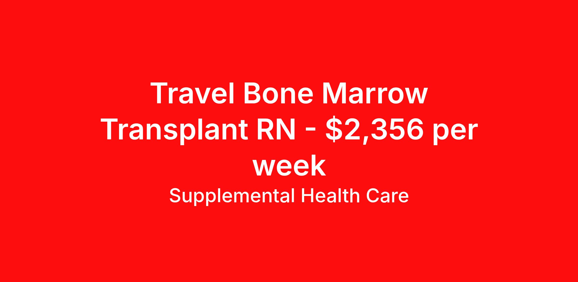 Supplemental Health Care is seeking a travel nurse RN Bone Marrow Transplant for a travel nursing job in Houston, Texas. Job Description & Requirements Specialty: Bone Marrow Transplant Discipline: RN Start Date: ASAP Duration: 13 weeks 36 hours per week Shift: 12 hours, nights Employment Type: Travel Job Description: Supplemental Health Care is connecting Bone Marrow Transplant Registered Nurses with top-tier hospital contracts in Houston, Texas. Travel or stay local, either way, we’ll guide you to an opportunity that matches your goals, offering excellent pay, benefits, and support. Qualifications: Current Texas Registered Nurse License / Certification American Heart Association BLS 1 to 2 years of recent Bone Marrow Transplant experience Bone Marrow Transplant Registered Nurse Contract Details: $2,142 - $2,356 per week* Weekly pay 13-week full-time contract with possibility to extend NOC shifts available *Estimated weekly payment may include both taxable wages and tax-free reimbursements for meals, housing, and incidentals. Please speak with a recruiter for details. What We Offer: Full medical, dental, vision, life, and even pet insurance! Round the clock support. No matter where you are or what time it is, Supplemental Health Care is standing by. SHC's Share the Care referral program is the most dynamic, profitable referral program in the industry. 401(k) Retirement Savings Program with a wide range of investment options. Discounted and free online access to CEU courses through Supplemental University. Apply now to launch your next Bone Marrow Transplant Registered Nurse assignment, or ask our team about other exciting Registered Nurse opportunities. Supplemental Health Care is an Equal Opportunity Employer. All candidates, including veterans and those with disabilities, are encouraged to apply. SHC will consider for employment qualified applicants with criminal histories in a manner consistent with the requirements of applicable local, state, or federal law. To learn more, visit www.shccares.com/eeo Supplemental Health Care Job ID 1471023. Pay package is based on 12 hour shifts and 36 hours per week (subject to confirmation) with tax-free stipend amount to be determined. Posted job title: Bone Marrow Transplant Registered Nurse About Supplemental Health Care At Supplemental Health Care, a simple belief in the power of caring guides a unique commitment to world-class service in healthcare staffing. For 40 years, we’ve supported talented professionals pursuing their life calling in hospitals, schools, home health, corrections, behavioral health, and other settings. At SHC, we inspire vital connections and enrich lives and inspire better outcomes. As recipients of the Best in Staffing Awards for both Client and Talent, Supplemental Health Care is proud to be among only 2% of staffing companies singled out for the distinction based on the real feedback of our employees and the clients we serve. SHC has also earned The Joint Commission’s Gold Seal of Approval and is named among the Largest Health Care Staffing companies in the United States by Staffing Industry Analysts. We are also thrilled to recognize our very own SLP, Dr. Kelly Byrd as the American Staffing Association 2024 National Staffing Employee of the Year and Health Care Sector All-Star. We’re honored to connect Dr. Byrd to employment, share her incredible story, and support her family literacy nonprofit. For everyone that we serve, SHC is the place where caring hearts thrive. Benefits Referral bonus Benefits start day 1 401k retirement plan Continuing Education Discount program Health savings account