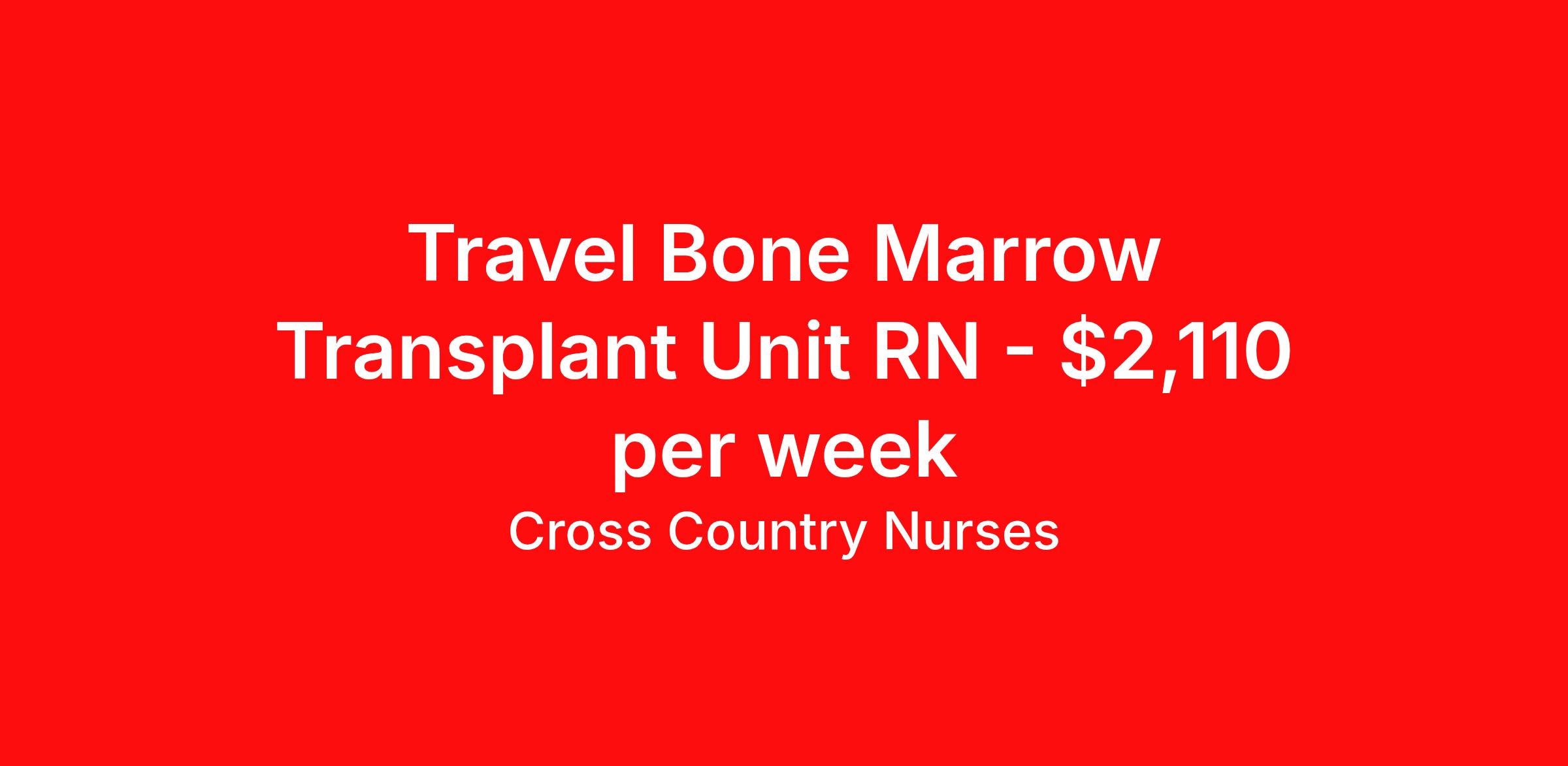 Cross Country Nurses is seeking a travel nurse RN Bone Marrow Transplant for a travel nursing job in Indianapolis, Indiana. Job Description & Requirements Specialty: Bone Marrow Transplant Discipline: RN Start Date: 04/20/2026 Duration: 12 weeks 36 hours per week Shift: 12 hours, days Employment Type: Travel Job Description As a registered nurse - bone marrow transplant unit (RN), you'll care for patients who are being treated for diseases such as lymphoma, leukemia, anemia, cancer and immune deficiency. Working at a hospital, outpatient facility or cancer center, you'll collaborate with oncologists and other cancer care team members. Your responsibilities may include administering chemotherapy, medications and IVs, monitoring vital signs, helping patients manage pain, providing patient and family education, and assisting before, during and after procedures. You'll play an essential role in providing moral support and ensuring your patients receive safe, high-quality care. Minimum Requirements At least 1 year of recent acute care experience in specialty Active RN license Benefits The benefits of taking a travel nursing job with Cross Country include: Private housing or generous housing allowance Comprehensive health insurance with prescription coverage Dependent health insurance with prescription coverage Competitive salaries Referral bonuses Travel reimbursement 401(k) retirement plan Direct deposit/free checking Unlimited free CE credits Posted Date: 2026-03-13 Cross Country Job ID 1223728. Pay package is based on 12 hour shifts and 36 hours per week (subject to confirmation) with tax-free stipend amount to be determined. Posted job title: Registered Nurse / Bone Marrow Transplant Unit About Cross Country Nurses You care for others — we’re here to care for you. At Cross Country, we know travel nursing is about more than just the job. It’s about building a career that supports your lifestyle, your values, and your impact. We offer competitive pay, full benefits, and 24/7 support from a team that truly understands what it means to be on the front lines. Wherever your journey takes you, we’re with you every step of the way. Let’s build your best life — one assignment at a time. Benefits 401k retirement plan Referral bonus