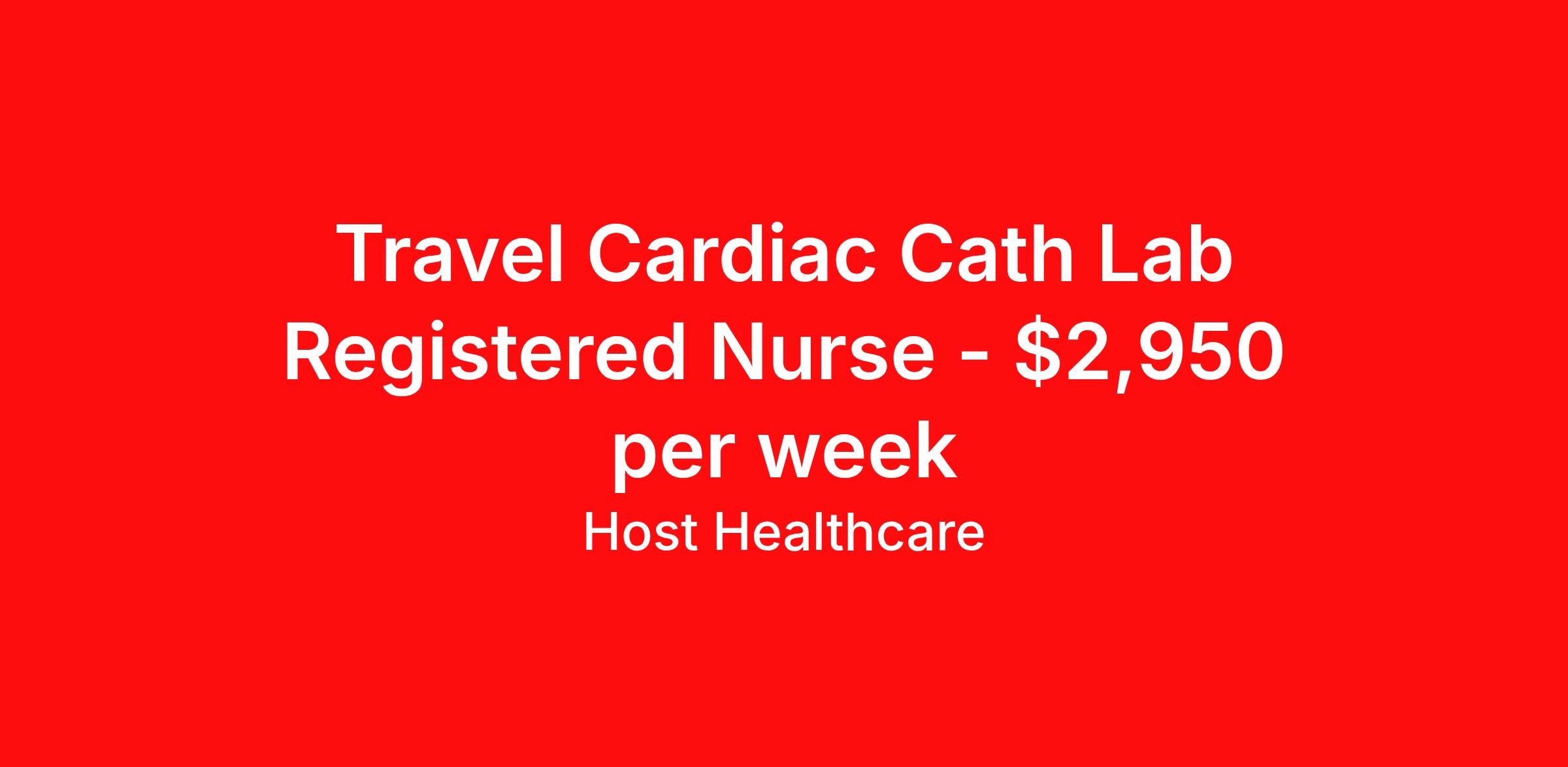 Host Healthcare is seeking a travel nurse RN Cardiac Cath Lab for a travel nursing job in Soldotna, Alaska. Job Description & Requirements Specialty: Cardiac Cath Lab Discipline: RN Start Date: 03/31/2026 Duration: 16 weeks 40 hours per week Shift: 8 hours, days Employment Type: Travel Host Healthcare Job ID a1fVX000002vUoDYAU. Pay package is based on 8 hour shifts and 40 hours per week (subject to confirmation) with tax-free stipend amount to be determined. Posted job title: RN - Cardiac Cath Lab About Host Healthcare At Host Healthcare, we provide a truly comfortable experience as you explore your travel nursing, therapy, or allied career. We make your travel healthcare journey easy by taking care of all the details, so you don’t have to. We are on a mission to help others live better and we do this by helping the healers of the world be as comfortable as possible. With access to tens of thousands of travel nursing, therapy, and allied jobs in all 50 states, our responsive and friendly recruiters find your dream position based on what’s important to you. During your assignment, get access to premium benefits, including Day 1 medical that continues up to 30 days between assignments, 401K matching, travel reimbursements, dedicated housing support, and more. We also offer 24/7 support from our team and access to our on-staff clinicians so you can feel comfortable and confident throughout your entire assignment. Travel comfortably with Host Healthcare. Benefits Referral bonus School loan reimbursement Vision benefits Wellness and fitness programs Company provided housing options License and certification reimbursement Life insurance Medical benefits Mileage reimbursement Pet insurance Discount program Employee assistance programs Guaranteed Hours Health savings account Holiday Pay 401k retirement plan Continuing Education Dental benefits