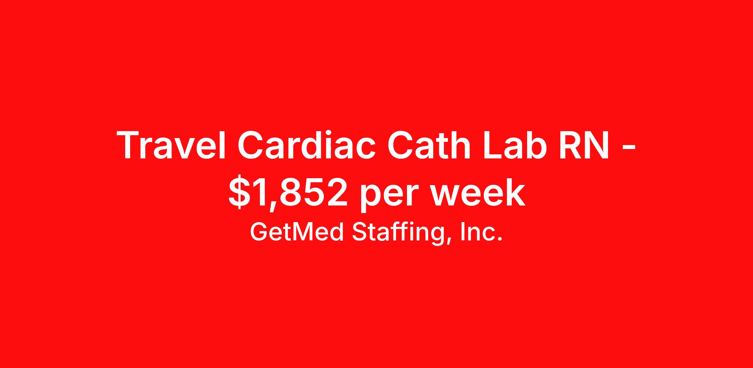 GetMed Staffing, Inc. is seeking a travel nurse RN Cardiac Cath Lab for a travel nursing job in Ocala, Florida. Job Description & Requirements Specialty: Cardiac Cath Lab Discipline: RN Start Date: 03/23/2026 Duration: 13 weeks 36 hours per week Shift: 12 hours, days Employment Type: Travel GetMed Staffing is searching for a strong Cath Lab RN to assist our traveler-friendly client. A minimum of 1-2 years of experience is required. Traveling with GetMed Staffing offers the unique opportunity to gain diverse experiences, both personally and professionally. Gain experience that matters. GetMed Staffing, Inc. Job ID 35769249. Pay package is based on 12 hour shifts and 36.0 hours per week (subject to confirmation) with tax-free stipend amount to be determined. Posted job title: Cath Lab:Cath Lab RN,07:00:00-19:00:00 About GetMed Staffing, Inc. We are a diversity owned company, specializing in healthcare recruiting services. We truly understand how important a healthcare travelers' relationship is with their recruiter, as well as our relationship is with our healthcare facilities. We recognize that the needs of our healthcare travelers can vary, and therefore we provide the personalized touch necessary to ensure a successful travel assignment each and every time. Our healthcare facilities and clients benefit from us putting our healthcare travelers first. GetMed Staffing is excited to be a leader within the industry by focusing on providing healthcare travelers with more choices and possibilities as they plan for their next healthcare travel assignment. Benefits Life insurance Medical benefits Dental benefits Vision benefits 401k retirement plan