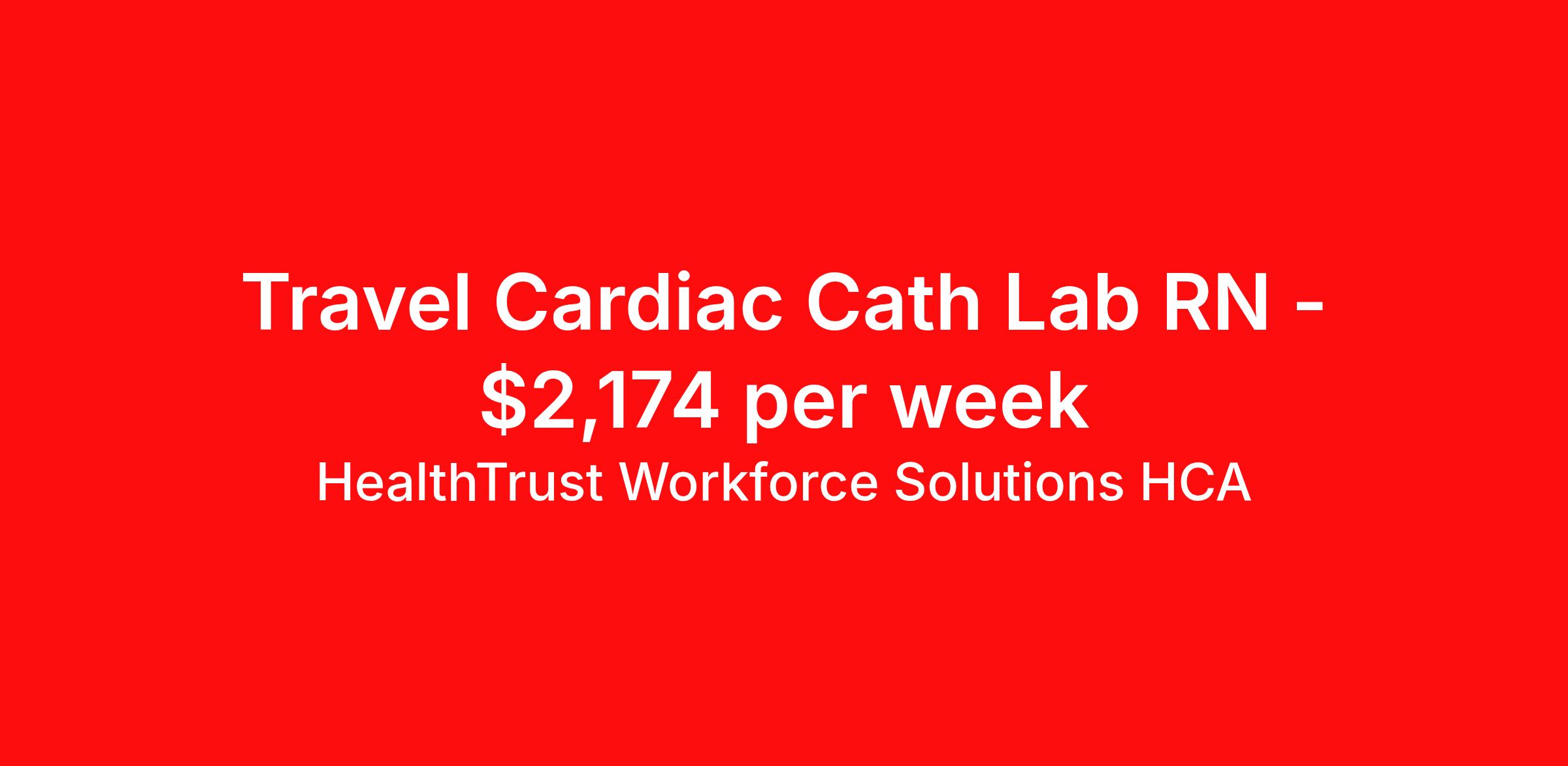 HealthTrust Workforce Solutions HCA is seeking a travel nurse RN Cardiac Cath Lab for a travel nursing job in Ocala, Florida. Job Description & Requirements Specialty: Cardiac Cath Lab Discipline: RN Duration: 13 weeks 36 hours per week Shift: 12 hours, days Employment Type: Travel Entrust Your Career to HealthTrust! At HealthTrust, we believe that healthcare is not defined by the four walls in which it is practiced; it’s defined by its people. We pride ourselves on crafting opportunities that expand skill sets, broaden career horizons, provide economic stability, and cultivate personal growth. HealthTrust Offers: Competitive Pay Packages Guaranteed hours Weekly direct deposit options 401k with Company Match Earn up to $750 for referrals Free Private Furnished Housing or Tax-Free Subsidy To get started, you will need: RN's a minimum of 1 year in specialty Allied 6 months of experience An adventurous spirit and fierce dedication Degree in corresponding specialty as required Appropriate certifications and licensure as needed for the specific position HealthTrust Benefits: Opportunities for a lifetime: When you become a part of the HCA family, you will have exclusive access to more opportunities than any other healthcare system in the nation. At HWS, we help open the door to a lifetime of lasting career opportunities. A culture of care: Our clinicians have made HWS an industry leader for over 25 years. We are passionate about our mission that, above all else, we are committed to the care and improvement of human life. Career Development: As a wholly owned subsidiary of HCA Healthcare, HWS is a preferred partner to thousands of top-performing hospitals. We provide our healthcare professionals with first-priority access to more than 200,000 jobs nationwide. We are uniquely positioned to offer you exclusive and direct access to HCA Healthcare’s vast network of facilities. Let us open the door to nationwide opportunities that fit your lifestyle! We are an equal opportunity employer and value diversity at our company. We do not discriminate on the basis of race, religion, color, national origin, gender, sexual orientation, age, marital status, veteran status, or disability status. Job Requirements Certifications ACLS (Required) BLS (Required) HealthTrust Workforce Solutions HCA Job ID 978535. Posted job title: Travel Nurse - Cath Lab About HealthTrust Workforce Solutions HCA At HealthTrust Workforce Solutions, healthcare is not just about the four walls of a facility but about the people who provide and receive care. Our focus is on empowering healthcare professionals to deliver exceptional patient experiences by providing them with the necessary skills, tools, and support. We partner with healthcare facilities nationwide to ensure that the right professionals are in the right roles. We prioritize our clinicians by giving them a voice and access to opportunities to fulfill their mission of improving lives by providing quality patient care. We are committed to our core values of Trust, Innovation, Adaptability, Courage, and Accountability. We are dedicated to positively impacting the healthcare industry by providing first-priority access to more than 200,000 jobs nationwide to our healthcare professionals. Join us and be part of the HealthTrust family, where you can make a difference every day. We embrace our changing environment, and we maintain a culture that has a rich tradition of transforming itself to meet the challenges of the future. MISSION STATEMENT While putting great people in the right roles is essential, our mission is far greater. We want our clinicians to be part of the HealthTrust family, where healthcare professionals have a voice and are empowered with the right tools and opportunities to fulfill their personal mission of improving lives. Plus, as a preferred partner to thousands of top-performing hospitals, we provide our healthcare professionals with first-priority access to more than 200,000 jobs nationwide. Benefits Dental benefits Vision benefits Referral bonus Continuing Education Life insurance
