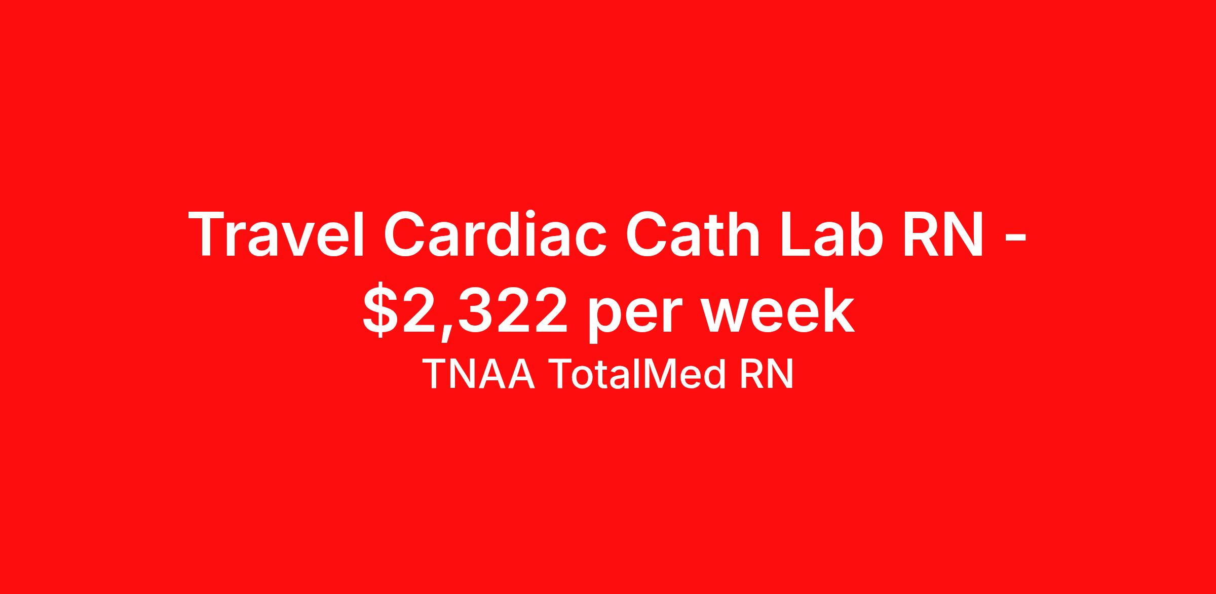 TNAA TotalMed RN is seeking a travel nurse RN Cardiac Cath Lab for a travel nursing job in El Paso, Texas. Job Description & Requirements Specialty: Cardiac Cath Lab Discipline: RN Duration: 13 weeks 40 hours per week Shift: 8 hours, days Employment Type: Travel We're looking for Cardiac Cath Lab RNs for an immediate travel nurse opening in El Paso, TX. The right RN should have 1-2 years recent acute care experience. Read below for more requirements. As a Cath Lab RN, you'll work with a highly skilled team of medical professionals in a cardiovascular surgical environment providing assistance to the physician including maintenance and monitoring of EKG equipment, and assisting during angioplasty, cardiac catheterization and electrophysiology. As a Cath Lab Travel Nurse, you should be prepared to perform the following tasks: Learn complex technologies effectively. Assist physicians with cardiac catheterization as a way to diagnose heart conditions or as a treatment. Assist with angioplasties, valvuloplasties and stent placements. Help implant pacemakers and implantable cardioverter-defibrillators (ICDs). Cath Lab Travel Nurses should be able to stand and walk for long periods of time, as well as bend, lean and stoop without difficulty. RNs should be able to easily lift 20 pounds. Moving or lifting of patients may require lifting of up to 50 pounds at times. Because of the fast-paced environment, Cardiac Cath Lab Travel Nurses must possess good skills for coping with stress and be able to relate to people of all ages and backgrounds. Requirements*: ACLS, BLS, 1 Year * Additional certifications may be required before beginning an assignment. TotalMed Travel Job ID 1373227. Pay package is based on 8 hour shifts and 40 hours per week (subject to confirmation) with tax-free stipend amount to be determined. Posted job title: Catheterization lab - CathLab RN - Travel Nurse About TNAA TotalMed RN TotalMed is a Top Ten, travel nursing and healthcare staffing agency with the mission of igniting purpose in healthcare. The organization staffs nurses, therapists, pharmacists, and other clinicians of all specialties in all 50 states. They offer local and travel jobs and match caregivers with the right organization to assist both facilities and patients. As an organization, they focus on putting highly-skilled staff into facilities to ensure adequate staffing for a better patient experience. TotalMed specializes in recruiting and placing healthcare professionals in travel, PRN, and permanent positions across the country in Nursing and Allied Health. Throughout 2020, the organization filled roles at even the most short-staffed facilities during the most challenging time in healthcare. By matching the right travel healthcare professional with the right organization, TotalMed continues to offer a lifeline to facilities and their patients. Benefits Weekly pay Guaranteed Hours Continuing Education 401k retirement plan Sick pay Wellness and fitness programs Referral bonus Employee assistance programs Medical benefits Dental benefits Vision benefits Benefits start day 1