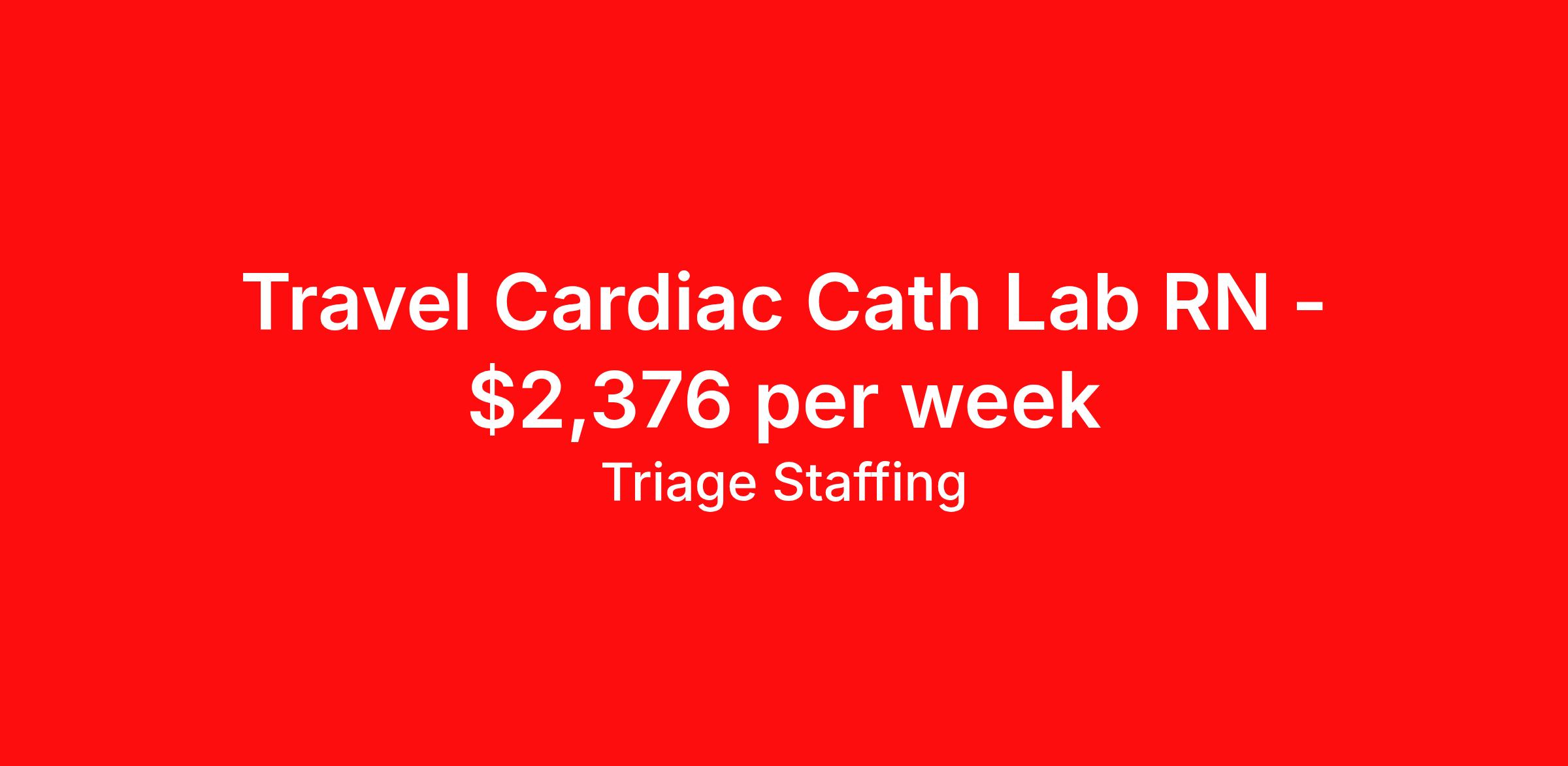 Triage Staffing is seeking a travel nurse RN Cardiac Cath Lab for a travel nursing job in El Paso, Texas. Job Description & Requirements Specialty: Cardiac Cath Lab Discipline: RN Start Date: ASAP Duration: 13 weeks 40 hours per week Shift: 8 hours, days Employment Type: Travel Travel Nursing: Cath Lab El Paso Location: El Paso Start Date: 2/16/2026 Shift Details: 8H Days 40 hours per week Length: 13 WEEKS Apply for specific facility details.Cath Lab RN Triage Staffing Job ID 3UNRG6WC. Posted job title: Nursing: Cath Lab About Triage Staffing At Triage, we prefer to be real . Real about expectations—both ours and yours. Real about how a decision you make today could affect your tomorrows. Real about how compensation actually works. Real about how great—or grating—your next supervisor may be. Being real allows everyone at Triage to be ready . Ready to serve you with real honesty. So if that gig near the ocean is really no day at the beach, or that third shift comes with a second-class rate, we tell you. So you can be ready, too. We staff all five major divisions of acute care—nursing, lab, radiology, cardiopulmonary and rehab therapy, offering: - Competitive, custom pay packages - One point of contact for both travelers and facilities (per division) - A reliable recruiter who's got your back throughout your entire assignment - In-house compliance and accounting specialists - A clinical liaison team available 24/7 to offer medical and professional support and career development - A mentoring program that is run and managed by actual clinicians—yeah, you read that right - And more (because of course there’s more) Are we the biggest? No. Are we the best? That’s rather subjective, but we’re trying to be. Will we work like hell to get you as close to your idea of heaven as possible? Yes. Yes, we will. Benefits: Day One comprehensive, nationwide insurance plans for health, vision and dental and life—including a HSA option Day One 401(k) program with employer-matching contributions once eligible Facility cancelling protection—your time is money on and off-the-clock Guaranteed hours Weekly paychecks via direct deposit Earned vacation bonuses for time worked Paid holidays Employee assistance program (EAP)—your mental health is important, too Continuing education, certification and licensing reimbursement Workers comp—because accidents happen Top-rated professional liability insurance Company provided housing options Referral bonus—$750 in your pocket after they’ve completed a 13-week assignment