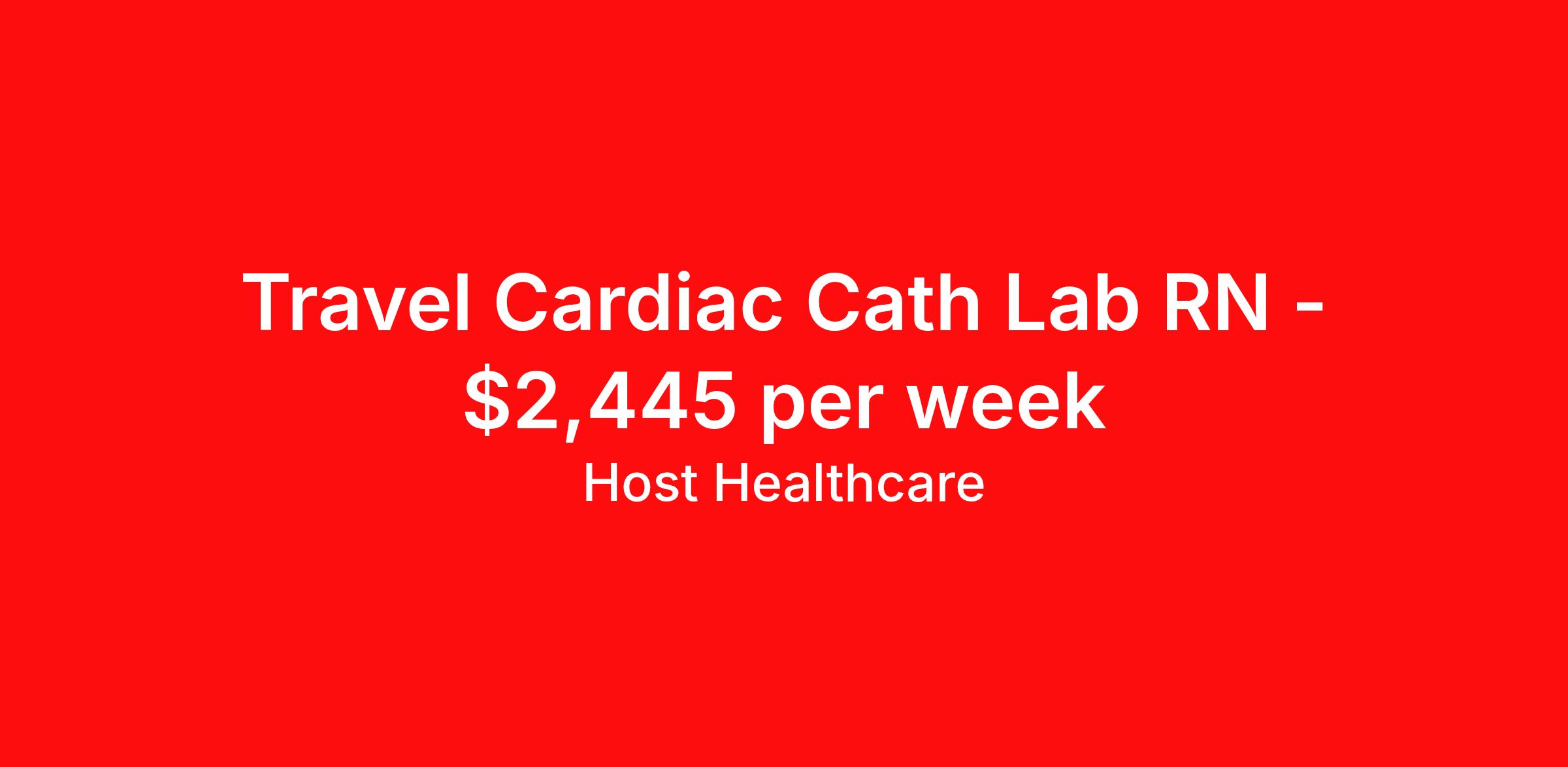Host Healthcare is seeking a travel nurse RN Cardiac Cath Lab for a travel nursing job in El Paso, Texas. Job Description & Requirements Specialty: Cardiac Cath Lab Discipline: RN Start Date: ASAP Duration: 13 weeks 40 hours per week Shift: 8 hours, days Employment Type: Travel Host Healthcare Job ID a1fVX000002hrntYAA. Pay package is based on 8 hour shifts and 40 hours per week (subject to confirmation) with tax-free stipend amount to be determined. Posted job title: RN - Cardiac Cath Lab About Host Healthcare At Host Healthcare, we provide a truly comfortable experience as you explore your travel nursing, therapy, or allied career. We make your travel healthcare journey easy by taking care of all the details, so you don’t have to. We are on a mission to help others live better and we do this by helping the healers of the world be as comfortable as possible. With access to tens of thousands of travel nursing, therapy, and allied jobs in all 50 states, our responsive and friendly recruiters find your dream position based on what’s important to you. During your assignment, get access to premium benefits, including Day 1 medical that continues up to 30 days between assignments, 401K matching, travel reimbursements, dedicated housing support, and more. We also offer 24/7 support from our team and access to our on-staff clinicians so you can feel comfortable and confident throughout your entire assignment. Travel comfortably with Host Healthcare. Benefits Referral bonus School loan reimbursement Vision benefits Wellness and fitness programs Company provided housing options License and certification reimbursement Life insurance Medical benefits Mileage reimbursement Pet insurance Discount program Employee assistance programs Guaranteed Hours Health savings account Holiday Pay 401k retirement plan Continuing Education Dental benefits