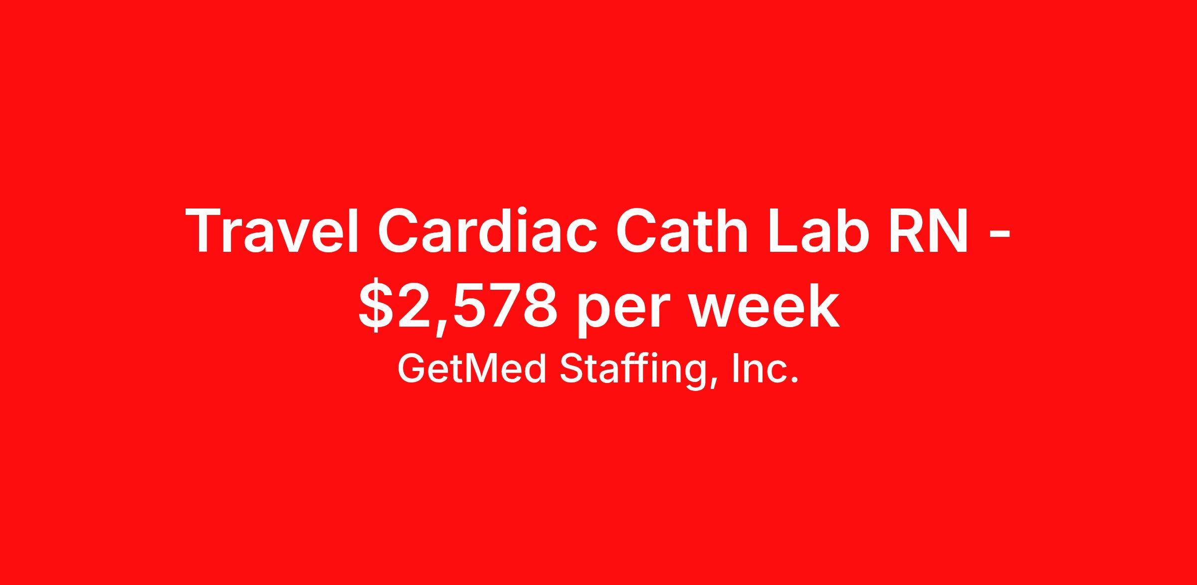 GetMed Staffing, Inc. is seeking a travel nurse RN Cardiac Cath Lab for a travel nursing job in Bloomington, Illinois. Job Description & Requirements Specialty: Cardiac Cath Lab Discipline: RN Start Date: 03/30/2026 Duration: 13 weeks 36 hours per week Shift: 9 hours, days Employment Type: Travel GetMed Staffing is searching for a strong Cath Lab RN to assist our traveler-friendly client. A minimum of 1-2 years of experience is required. Traveling with GetMed Staffing offers the unique opportunity to gain diverse experiences, both personally and professionally. Gain experience that matters. GetMed Staffing, Inc. Job ID 36157780. Pay package is based on 9 hour shifts and 36.0 hours per week (subject to confirmation) with tax-free stipend amount to be determined. Posted job title: Cath Lab:Cath Lab RN,07:00:00-16:00:00 About GetMed Staffing, Inc. We are a diversity owned company, specializing in healthcare recruiting services. We truly understand how important a healthcare travelers' relationship is with their recruiter, as well as our relationship is with our healthcare facilities. We recognize that the needs of our healthcare travelers can vary, and therefore we provide the personalized touch necessary to ensure a successful travel assignment each and every time. Our healthcare facilities and clients benefit from us putting our healthcare travelers first. GetMed Staffing is excited to be a leader within the industry by focusing on providing healthcare travelers with more choices and possibilities as they plan for their next healthcare travel assignment. Benefits Life insurance Medical benefits Dental benefits Vision benefits 401k retirement plan