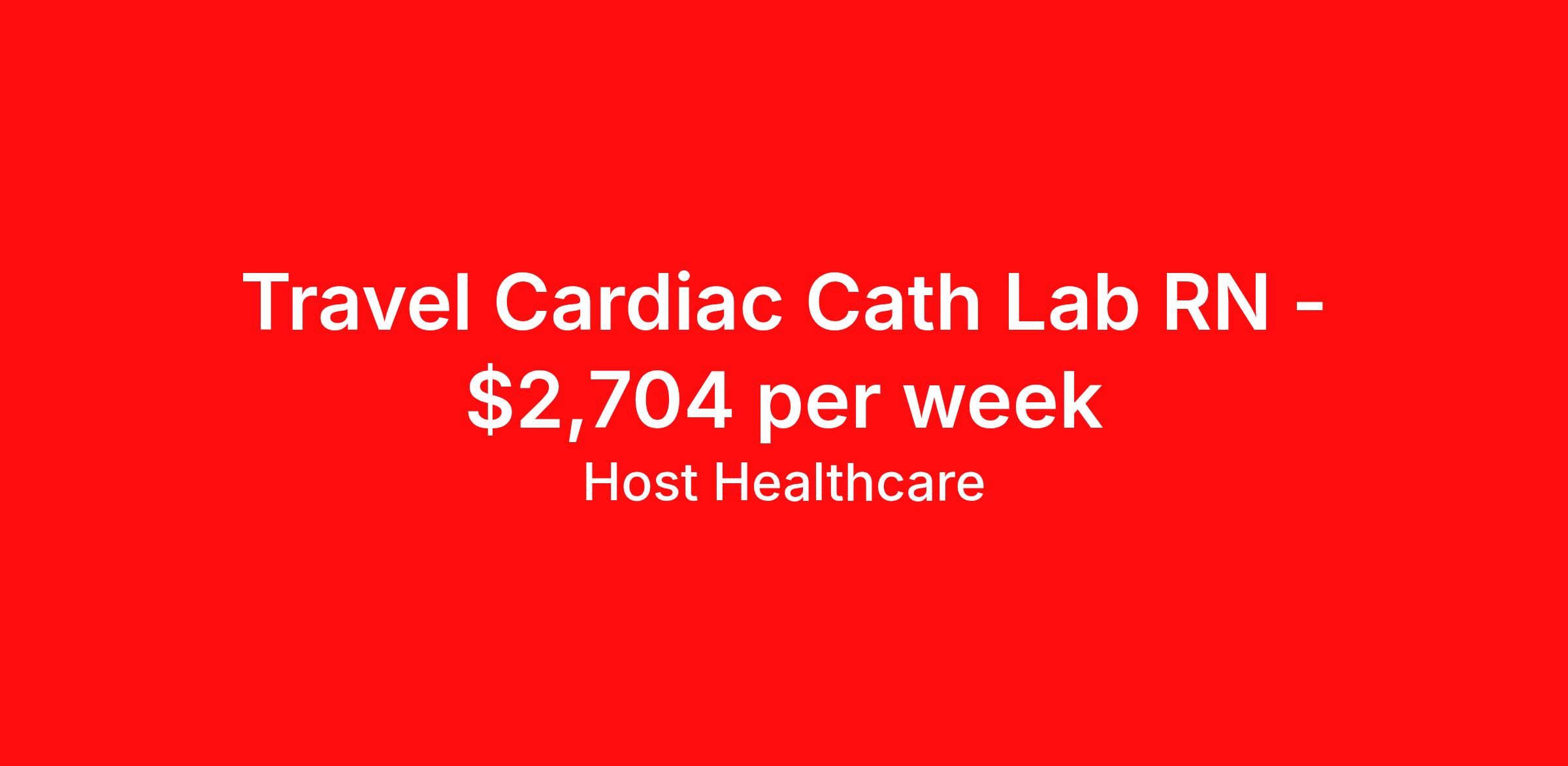 Host Healthcare is seeking a travel nurse RN Cardiac Cath Lab for a travel nursing job in Fort Wayne, Indiana. Job Description & Requirements Specialty: Cardiac Cath Lab Discipline: RN Start Date: ASAP Duration: 13 weeks 40 hours per week Shift: 8 hours, days Employment Type: Travel Host Healthcare Job ID a1fVJ000006cooLYAQ. Pay package is based on 8 hour shifts and 40 hours per week (subject to confirmation) with tax-free stipend amount to be determined. Posted job title: RN - Cardiac Cath Lab About Host Healthcare At Host Healthcare, we provide a truly comfortable experience as you explore your travel nursing, therapy, or allied career. We make your travel healthcare journey easy by taking care of all the details, so you don’t have to. We are on a mission to help others live better and we do this by helping the healers of the world be as comfortable as possible. With access to tens of thousands of travel nursing, therapy, and allied jobs in all 50 states, our responsive and friendly recruiters find your dream position based on what’s important to you. During your assignment, get access to premium benefits, including Day 1 medical that continues up to 30 days between assignments, 401K matching, travel reimbursements, dedicated housing support, and more. We also offer 24/7 support from our team and access to our on-staff clinicians so you can feel comfortable and confident throughout your entire assignment. Travel comfortably with Host Healthcare. Benefits Referral bonus School loan reimbursement Vision benefits Wellness and fitness programs Company provided housing options License and certification reimbursement Life insurance Medical benefits Mileage reimbursement Pet insurance Discount program Employee assistance programs Guaranteed Hours Health savings account Holiday Pay 401k retirement plan Continuing Education Dental benefits