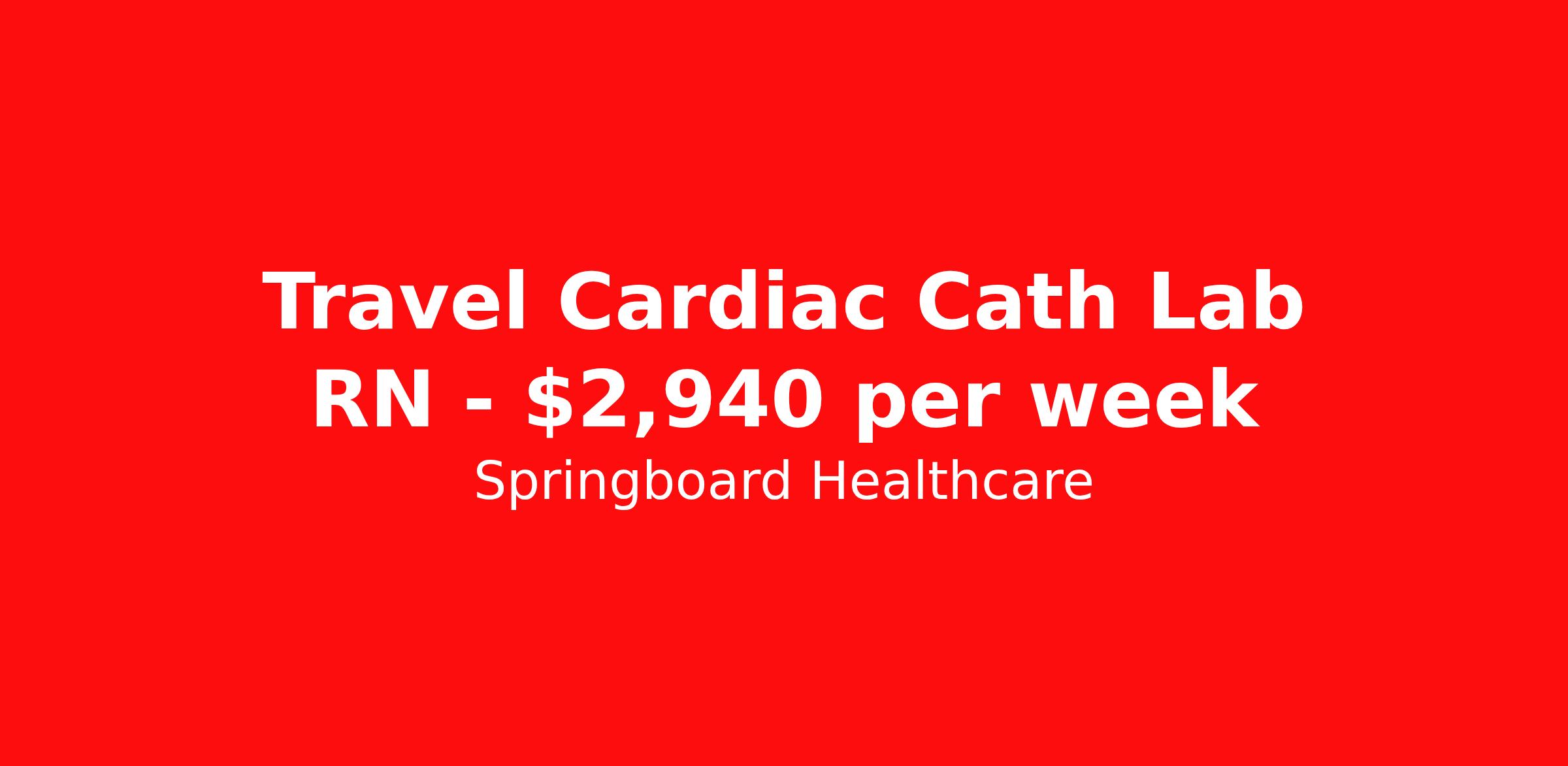 Springboard Healthcare is seeking a travel nurse RN Cardiac Cath Lab for a travel nursing job in Los Angeles, California. Job Description & Requirements Specialty: Cardiac Cath Lab Discipline: RN Start Date: 04/06/2026 Duration: 13 weeks 40 hours per week Shift: 10 hours Employment Type: Travel Springboard Healthcare Job ID 834575. Pay package is based on 10 hour shifts and 40 hours per week (subject to confirmation) with tax-free stipend amount to be determined. Posted job title: Cath Lab RN