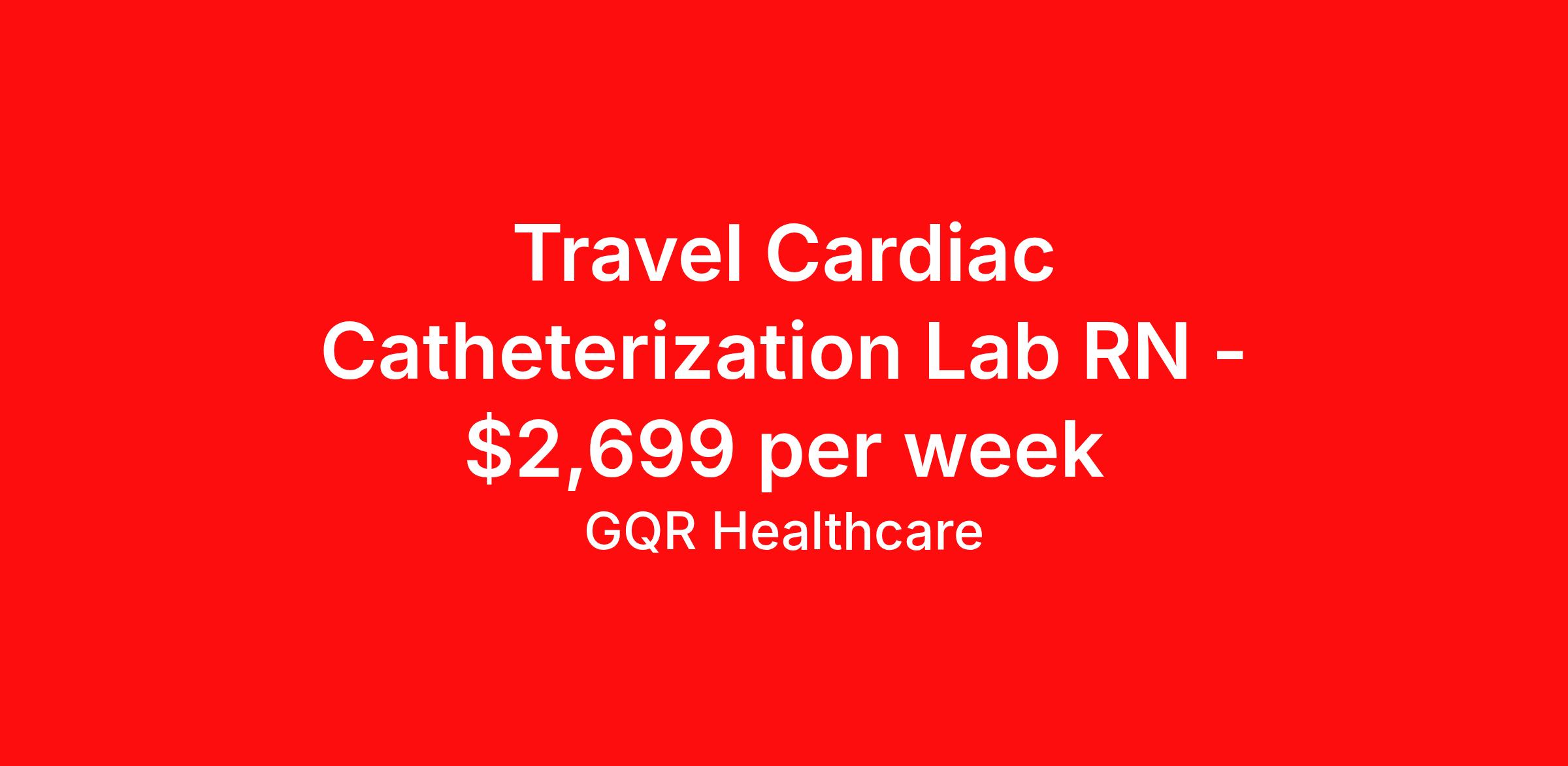 GQR Healthcare is seeking a travel nurse RN Cardiac Cath Lab for a travel nursing job in Wellington, Florida. Job Description & Requirements Specialty: Cardiac Cath Lab Discipline: RN Start Date: ASAP Duration: 13 weeks 40 hours per week Shift: 8 hours, days Employment Type: Travel Contract - W2 Cath Lab Registered Nurse (RN) Job Location: Wellington, Florida Start Date: March 9, 2026 Profession: Registered Nurse (RN) Facility: Estimated Pay: $2699 - $2794 Duration:13 weeks Specialty:Cath Lab Shift: Day Shift Details: null Day Job Type: Travel *Estimated weekly pay includes projected hourly wages and weekly meal and lodging per diems for eligible clinicians based on nationally published GSA rates. Actual weekly pay and per diems may differ from the amount shown and are subject to change during an assignment. Benefits: Day 1 Insurance Cigna medical, MetLife dental and vision insurance License reimbursement for new licenses needed for each assignment Discounts with hotels and rental cars A dedicated recruiter and support team that will help you every step of the way to sure you start on time and have an exceptional experience Referral bonus up to $700 About the Company: Finding the right role is about more than just matching skills to a job—it’s about aligning with your goals, values, and the way you want to work. As an award-winning talent partner, we support healthcare professionals through every step of that process, offering meaningful opportunities, clear guidance, and long-term partnership. From our first conversation to your first day on the job (and beyond!), we’re here to help you move forward with confidence. GQR Job ID 774594. Pay package is based on 8 hour shifts and 40 hours per week (subject to confirmation) with tax-free stipend amount to be determined. Posted job title: Registered Nurse (RN) About GQR Healthcare GQR’s Healthcare team specializes in connecting experts within the industry to highly skilled healthcare professionals across the US market. In the competitive healthcare market, we recognize that the industry’s common goals of improved quality of care and patient outcomes are wholly reliant upon the professionals directly supporting these initiatives. Leveraging our extensive candidate network, we deliver continuity of care for the communities our partners serve to ensure the patient experience is of the highest quality. Through deep market specialization and a unique approach to talent acquisition, GQR Healthcare provides an unparalleled and personalized experience across all medical specialties in nursing and within diverse healthcare platforms across the industry.