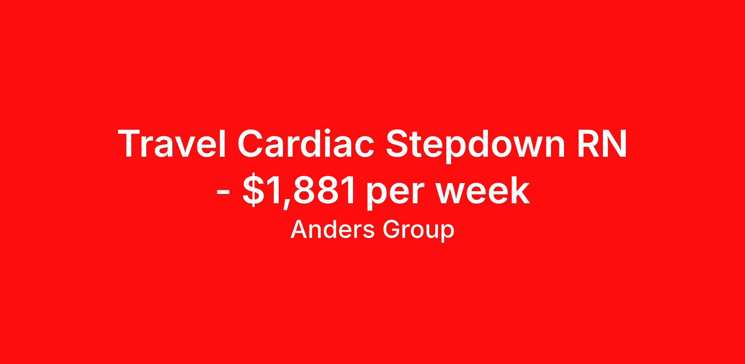 Anders Group is seeking a travel nurse RN Cardiac Stepdown for a travel nursing job in Saint Louis, Missouri. Job Description & Requirements Specialty: Cardiac Stepdown Discipline: RN Start Date: ASAP Duration: 13 weeks 36 hours per week Shift: 12 hours, nights Employment Type: Travel Anders Group Job ID 1003140. Pay package is based on 12 hour shifts and 36 hours per week (subject to confirmation) with tax-free stipend amount to be determined. Posted job title: AUTO OFFER: Travel: RN Cardiac Med Intermediate - Nights About Anders Group WHY ANDERS? Anders Group is a Joint Commission accredited staffing agency and stands out from other agencies by our commitment to making sure our travelers are given the best customer service. Our team works hard to find the best jobs with the most aggressive rates! Anders Group offers rewarding assignments and competitive compensation packages, nationwide! We offer the following benefits from day one: Health Insurance, Including a Buy-up Option Dental Insurance Vision Insurance Life Insurance 401(k) Licensure Reimbursement Premium Pay Packages CEU Reimbursements Daily Per Diems Travel Reimbursements Rental Car Allowances Continuing Education Resources Referral Bonus And Many More! THE ANDERS DIFFERENCE You're committed to providing exceptional healthcare. We're committed to you. Anders Group was founded by a team of healthcare recruiters who had built strong relationships with healthcare facilities and professionals nationwide. As staffing firms shifted their focus to numbers and margins, these recruiters saw a need for a company to take a different approach to staffing. Anders Group was founded in 2010 to do just that. We focus on individual and facility goals to make quality placements. Great people working with great facilities make for the best placements. Through our focus on providing the best experience to Allied and Nursing health care professionals, Anders Group has grown to be a top staffing firm in Healthcare. We look forward to working with you! Benefits Medical benefits Dental benefits Vision benefits Life insurance 401k retirement plan License and certification reimbursement Continuing Education Referral bonus