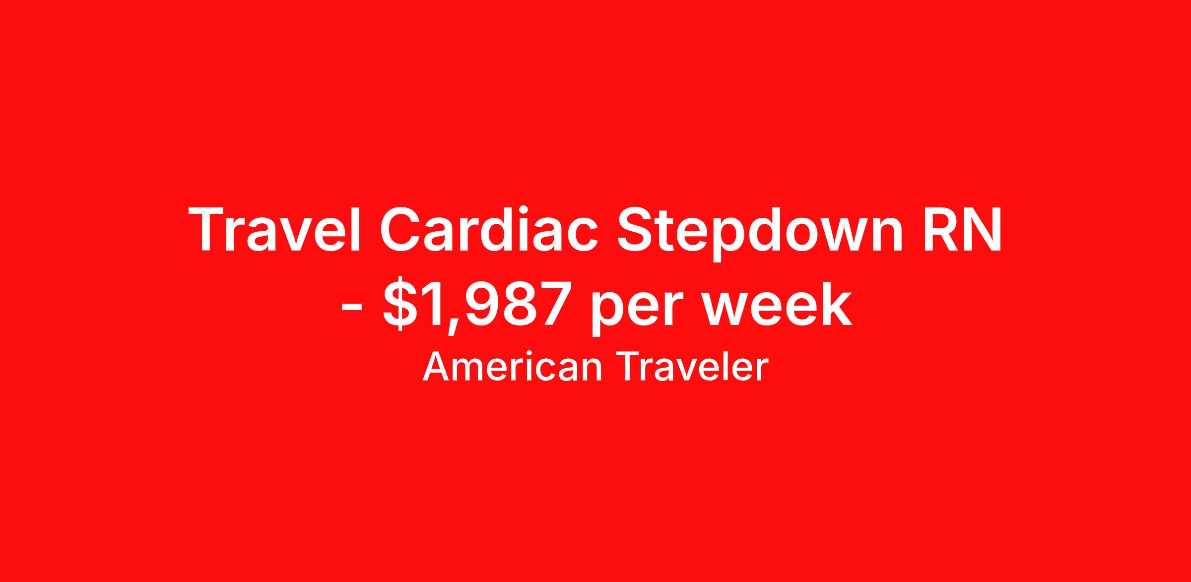 American Traveler is seeking a travel nurse RN Cardiac Stepdown for a travel nursing job in Saint Louis, Missouri. Job Description & Requirements Specialty: Cardiac Stepdown Discipline: RN Start Date: 03/30/2026 Duration: 13 weeks 36 hours per week Shift: 12 hours, nights Employment Type: Travel Assignment Overview Shift: Nights, 3x12hrs Hours: 36 hrs/wk Start Date: Mar 30, 2026 Length: 13 weeks Openings: 2 Description American Traveler is hiring a travel RN for a Cardiac Medical Intermediate (Stepdown) position in Saint Louis, MO, requiring a minimum of 1 year of recent experience and an active MO or compact RN license. Details Hospital-based Cardiac Medical Intermediate (Stepdown) unit Night shift schedule: 7:00 PM – 7:30 AM 13-week contract Requirements Active MO or compact RN license required Minimum 1 year of recent experience in cardiac medical intermediate or stepdown nursing No certifications expiring within the first 30 days of assignment unless documented renewal is scheduled Valid U.S. Social Security Number required (Canadian SINs not accepted) No gaps in employment of 90 or more days within the past 12 months Additional Information Up to 5 days of requested time off (RTO) is allowed but must be made up during the assignment Candidates living within 50 miles of the facility are subject to local candidate rules, including a restriction of 3 consecutive 13-week contracts before a 1-year separation or transfer to a facility outside the 50-mile radius is required American Traveler Job ID P-686262. Pay package is based on 12 hour shifts and 36 hours per week (subject to confirmation) with tax-free stipend amount to be determined. Posted job title: Travel RN - Telemetry - Stepdown About American Traveler With over 25 years of experience, American Traveler has established a reputation for outstanding customer service. Our team ensures a smooth, worry-free experience for those starting on or expanding their travel nursing and allied careers. With thousands of travel nursing and allied jobs nationwide, our attentive and approachable recruiters find positions that align perfectly with your career aspirations and personal requirements. American Traveler offers exceptional benefits, including premium medical, dental, vision and life insurance beginning day one of your assignment, generous 401(k) match, substantial housing stipends, and more. Additionally, with 24/7 support and access to our in-house clinicians, you are assured confidence and comfort throughout your assignment. With our team behind you, you can relax and enjoy a rewarding travel career.